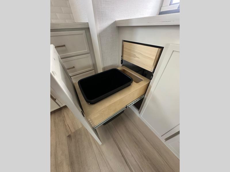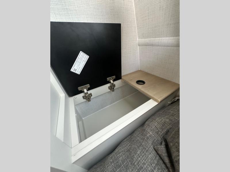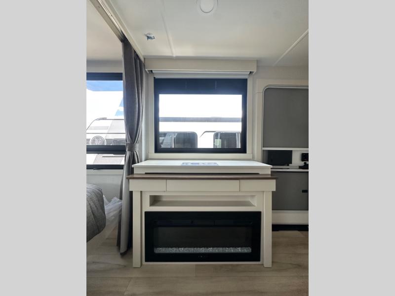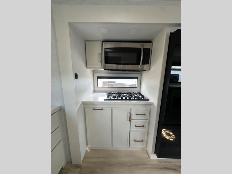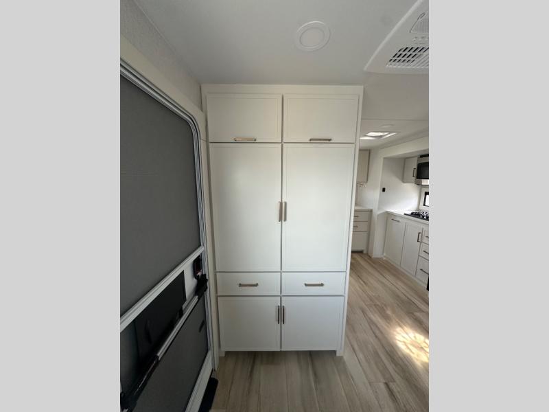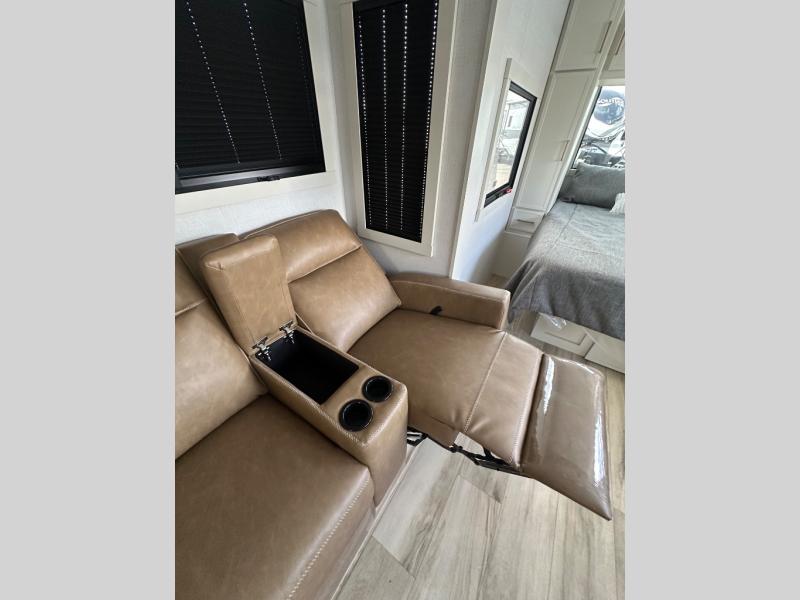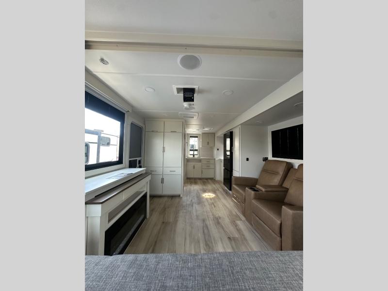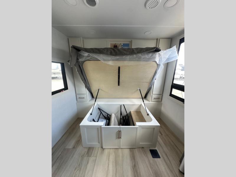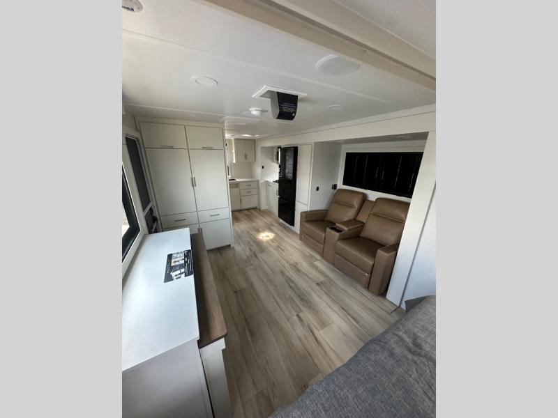 You'll love the amount of space you have in this travel trailer thanks to the large slide out in the main living area. There is comfy theater seating here, along with the kitchen appliances plus a pantry with drawers and an outlet. And a tri-fold sofa option can be chosen in place of theater seating if you're needing sleeping space for guests. You can dine at the pull-out dining table with a drawer, which is right in front of the pull-down interior/exterior screen. A full bath with a 36" x 30" shower will let you freshen up each day, and the king bed in the front bedroom includes a room divider in front for added privacy!