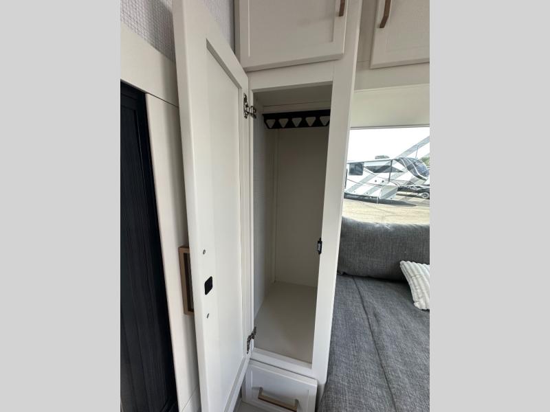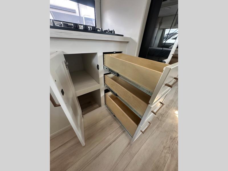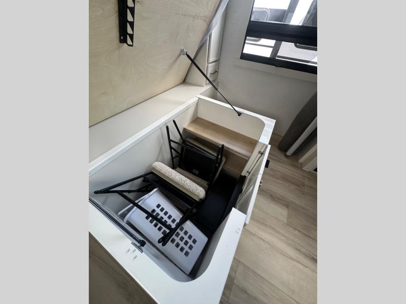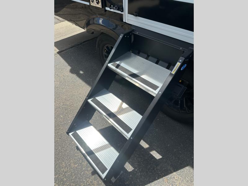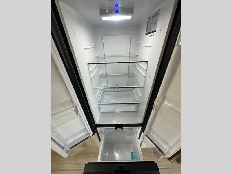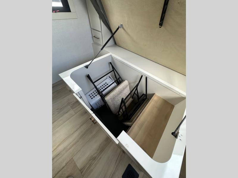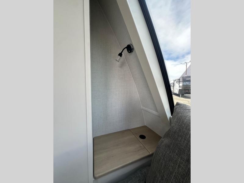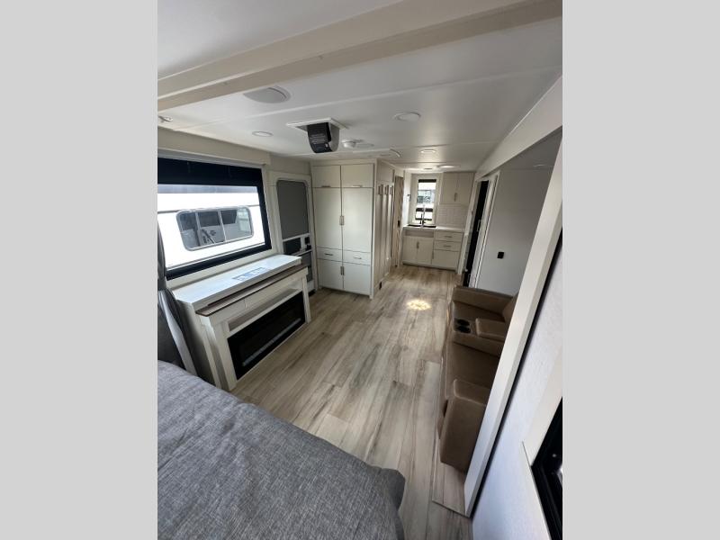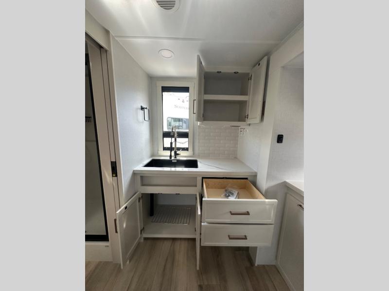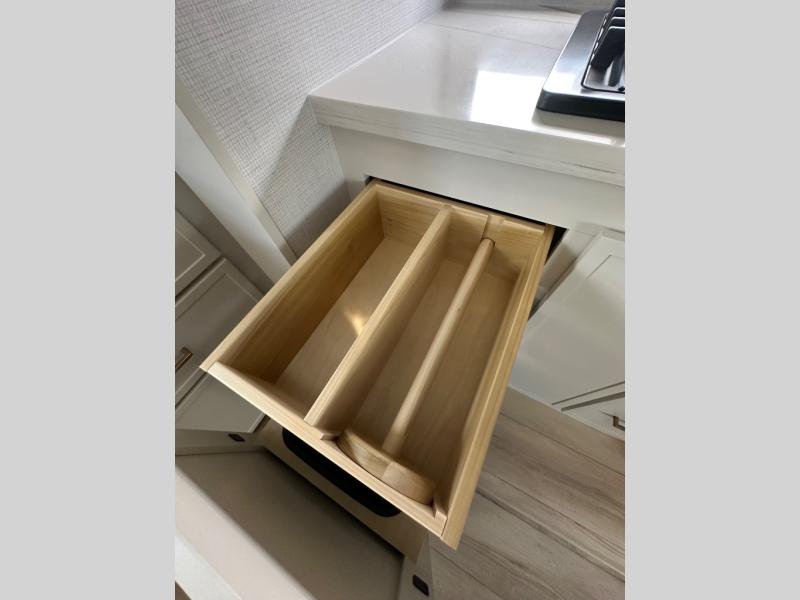 You'll love the amount of space you have in this travel trailer thanks to the large slide out in the main living area. There is comfy theater seating here, along with the kitchen appliances plus a pantry with drawers and an outlet. And a tri-fold sofa option can be chosen in place of theater seating if you're needing sleeping space for guests. You can dine at the pull-out dining table with a drawer, which is right in front of the pull-down interior/exterior screen. A full bath with a 36" x 30" shower will let you freshen up each day, and the king bed in the front bedroom includes a room divider in front for added privacy!