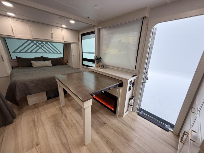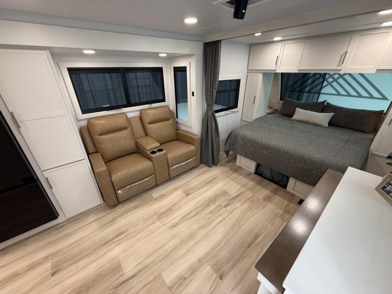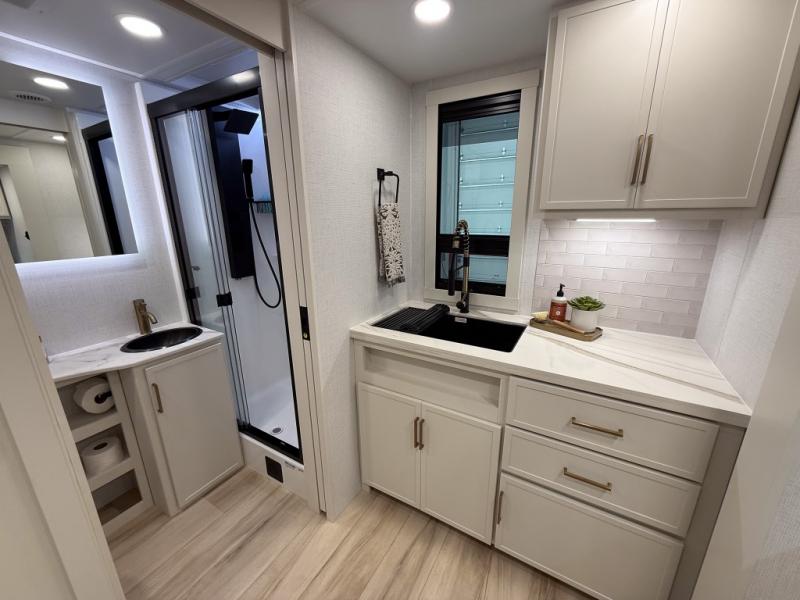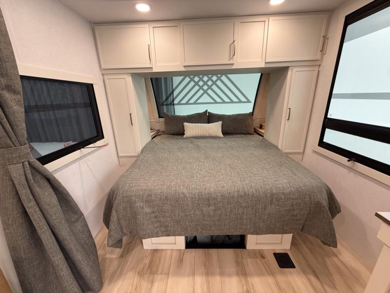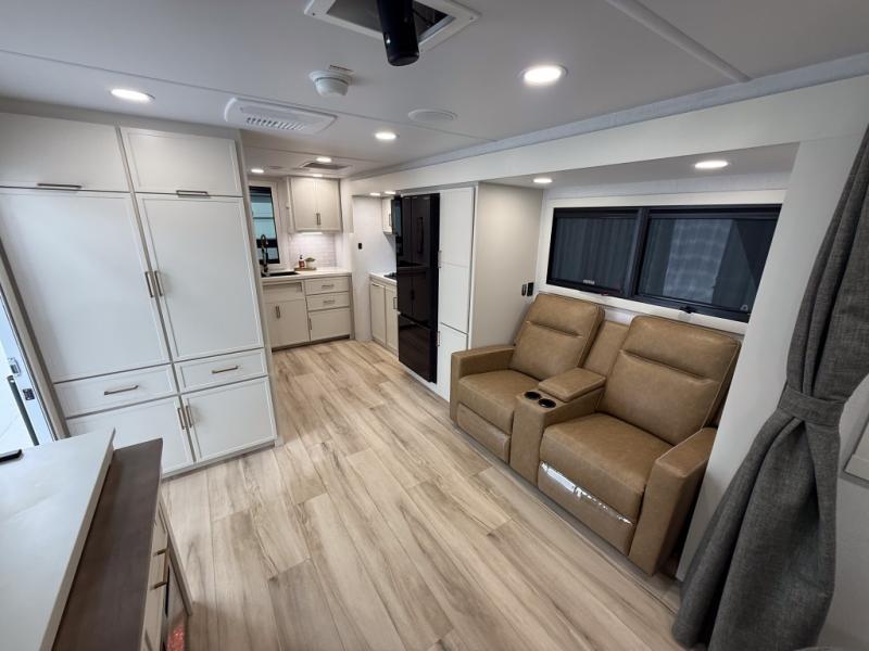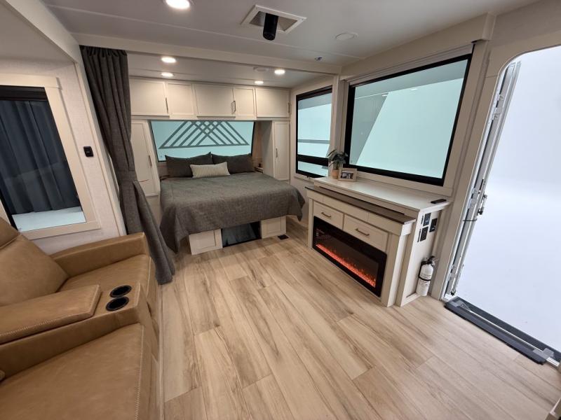 You'll love the amount of space you have in this travel trailer thanks to the large slide out in the main living area. There is comfy theater seating here, along with the kitchen appliances plus a pantry with drawers and an outlet. And a tri-fold sofa option can be chosen in place of theater seating if you're needing sleeping space for guests. You can dine at the pull-out dining table with a drawer, which is right in front of the pull-down interior/exterior screen. A full bath with a 36" x 30" shower will let you freshen up each day, and the king bed in the front bedroom includes a room divider in front for added privacy!