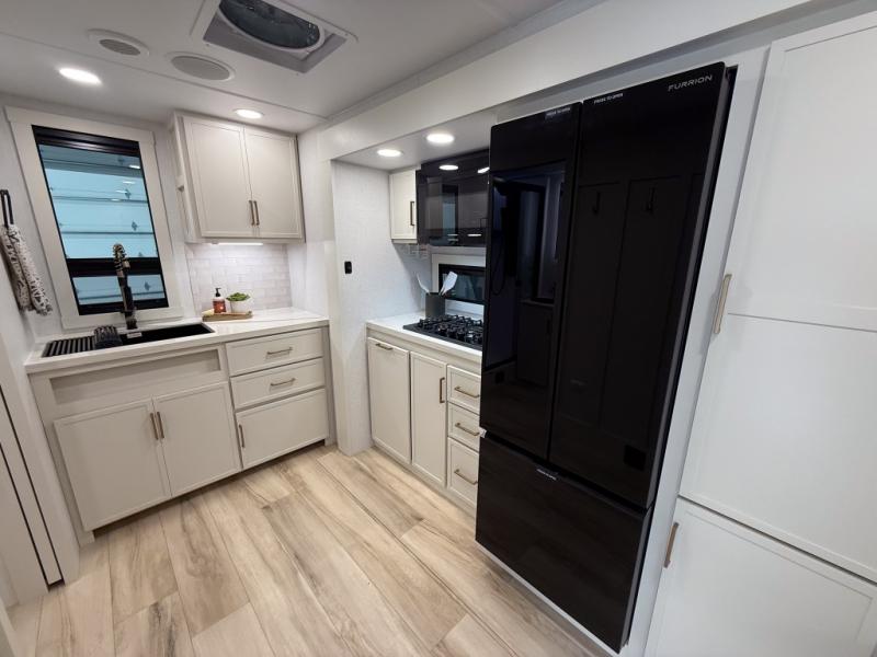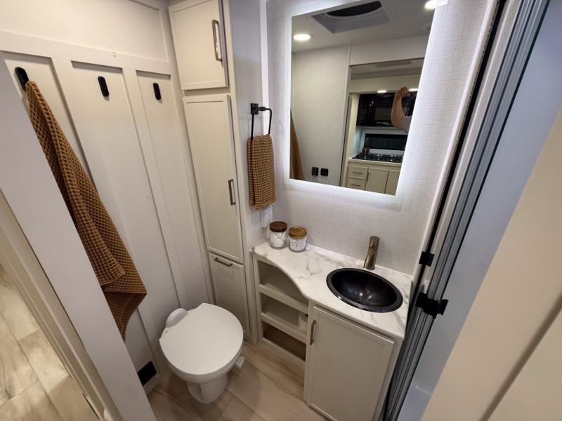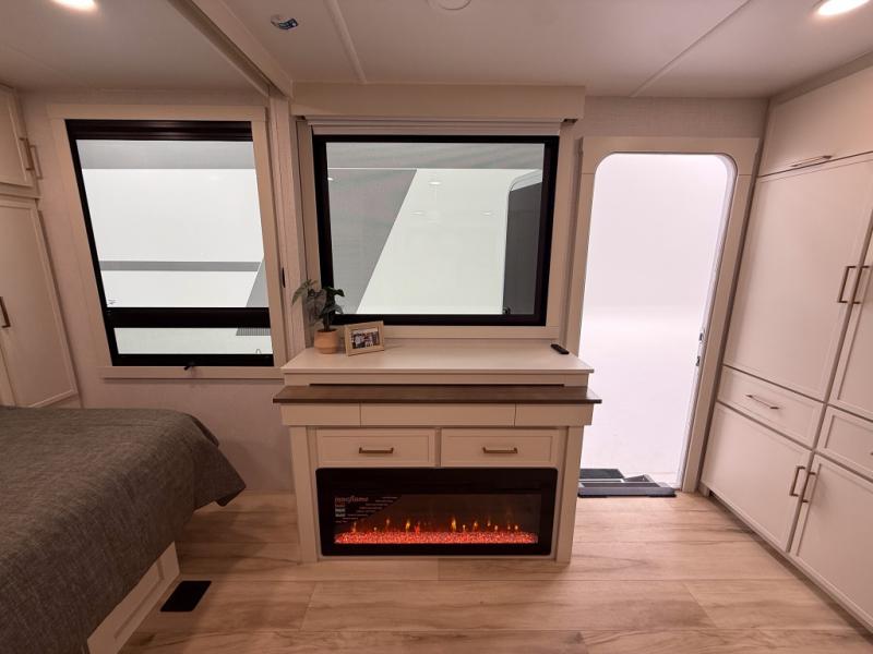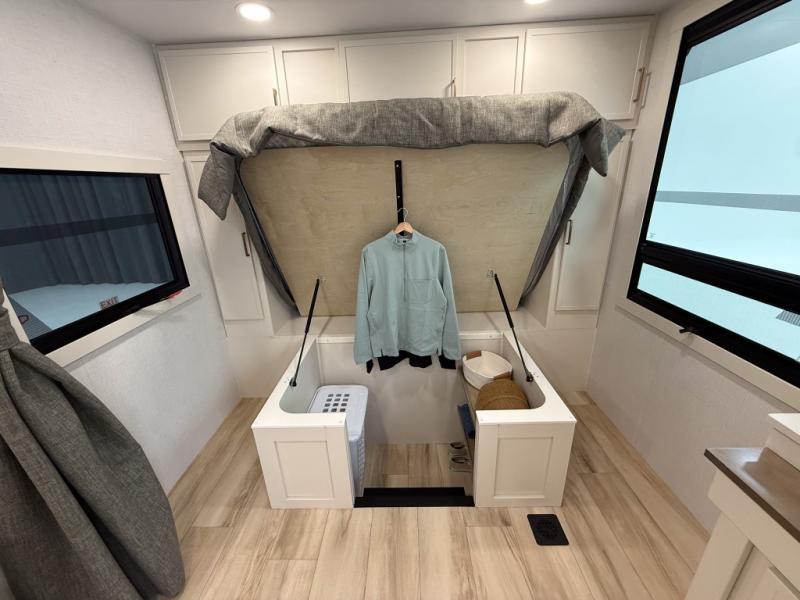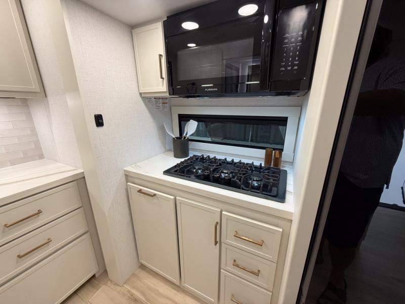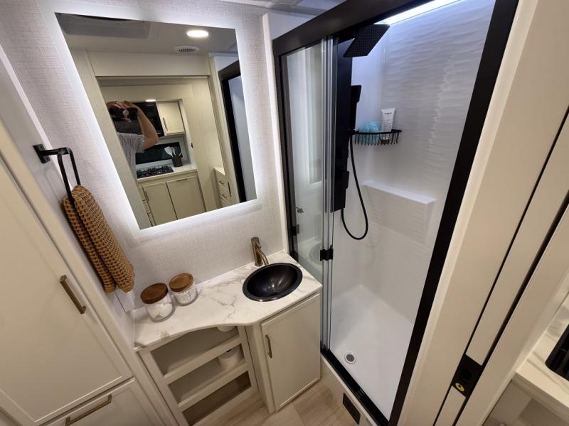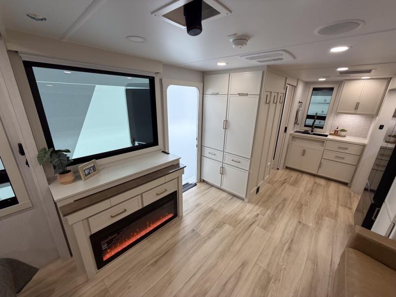 You'll love the amount of space you have in this travel trailer thanks to the large slide out in the main living area. There is comfy theater seating here, along with the kitchen appliances plus a pantry with drawers and an outlet. And a tri-fold sofa option can be chosen in place of theater seating if you're needing sleeping space for guests. You can dine at the pull-out dining table with a drawer, which is right in front of the pull-down interior/exterior screen. A full bath with a 36" x 30" shower will let you freshen up each day, and the king bed in the front bedroom includes a room divider in front for added privacy!