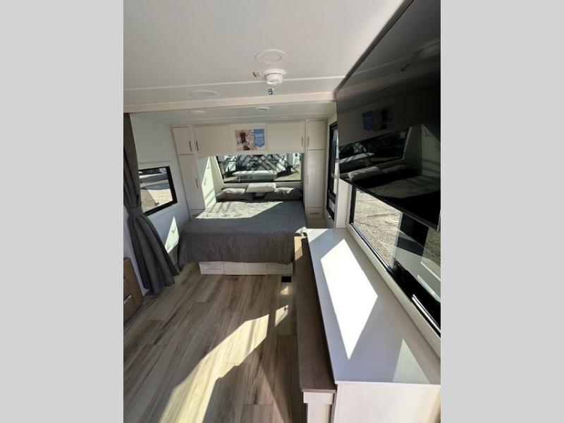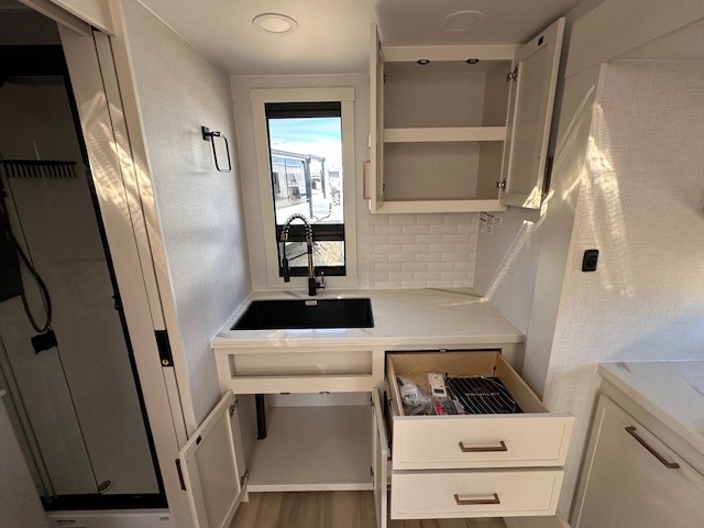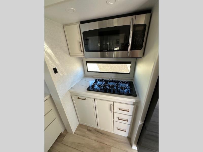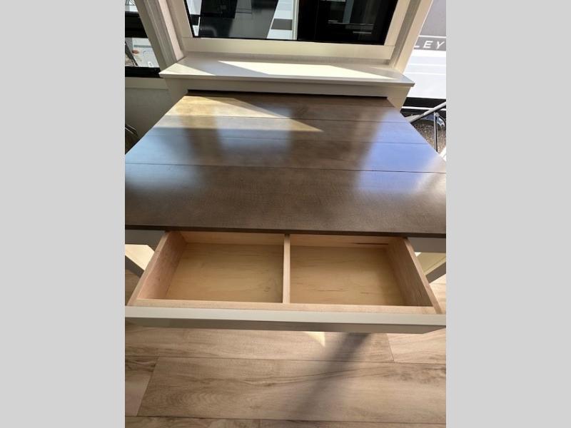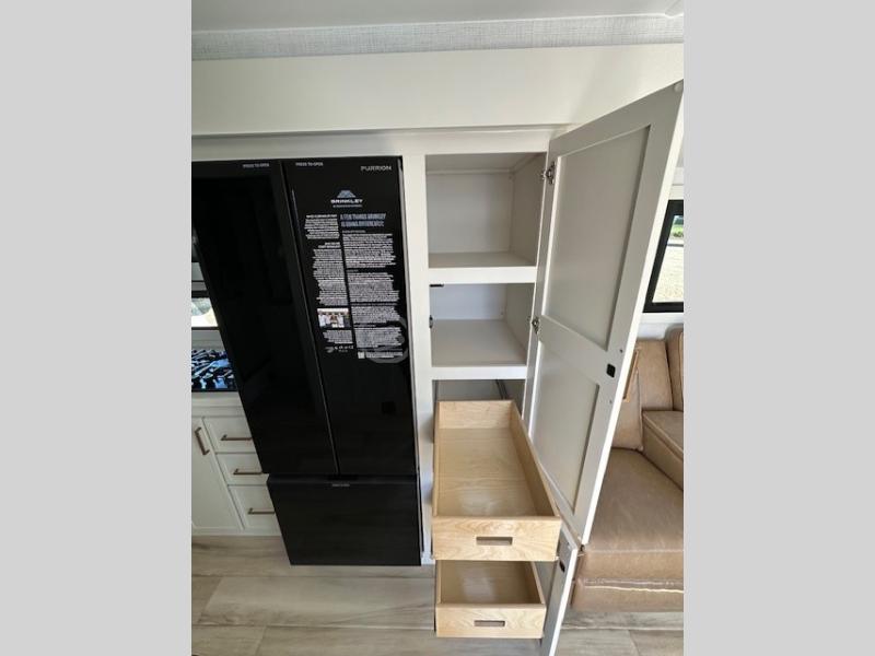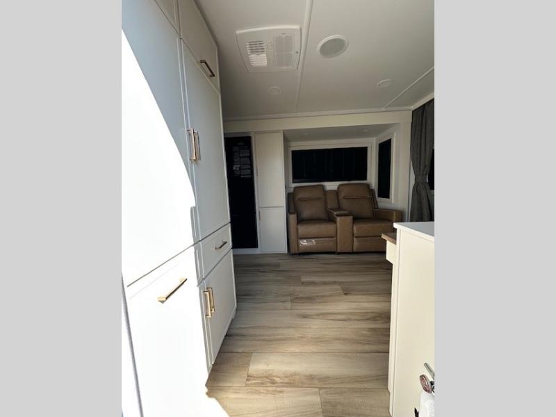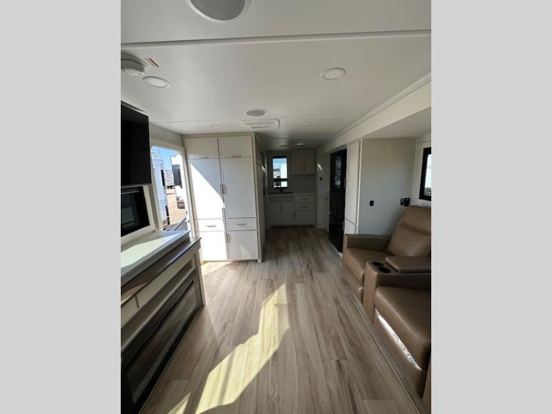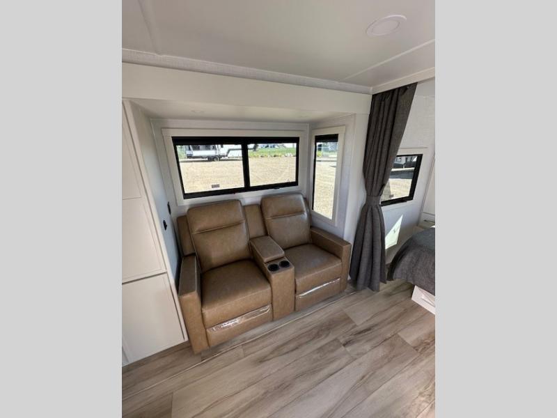 You'll love the amount of space you have in this travel trailer thanks to the large slide out in the main living area. There is comfy theater seating here, along with the kitchen appliances plus a pantry with drawers and an outlet. And a tri-fold sofa option can be chosen in place of theater seating if you're needing sleeping space for guests. You can dine at the pull-out dining table with a drawer, which is right in front of the pull-down interior/exterior screen. A full bath with a 36" x 30" shower will let you freshen up each day, and the king bed in the front bedroom includes a room divider in front for added privacy!