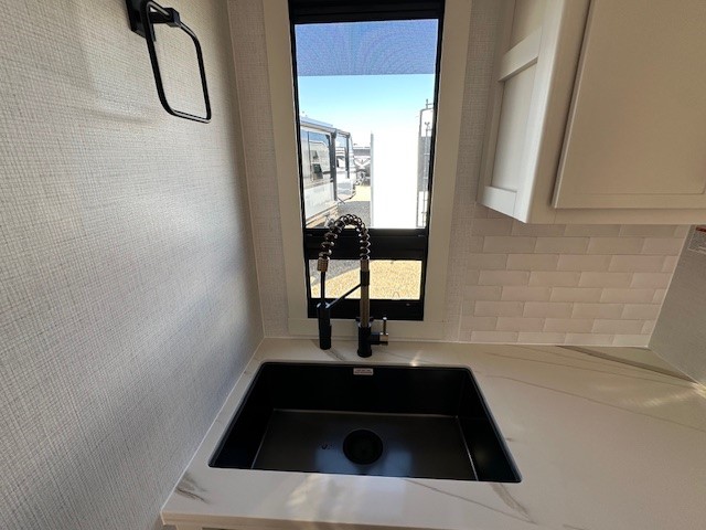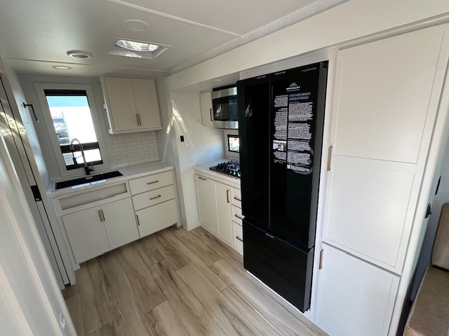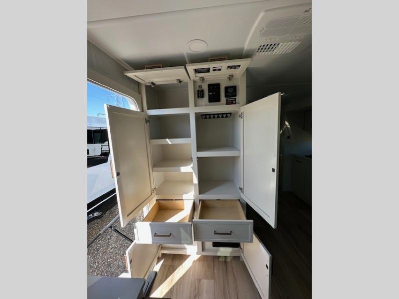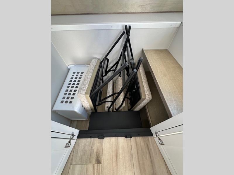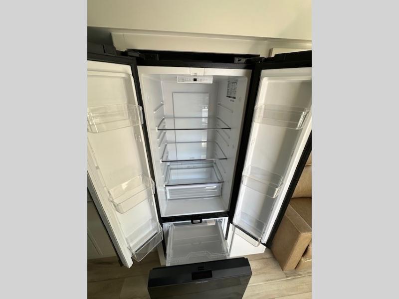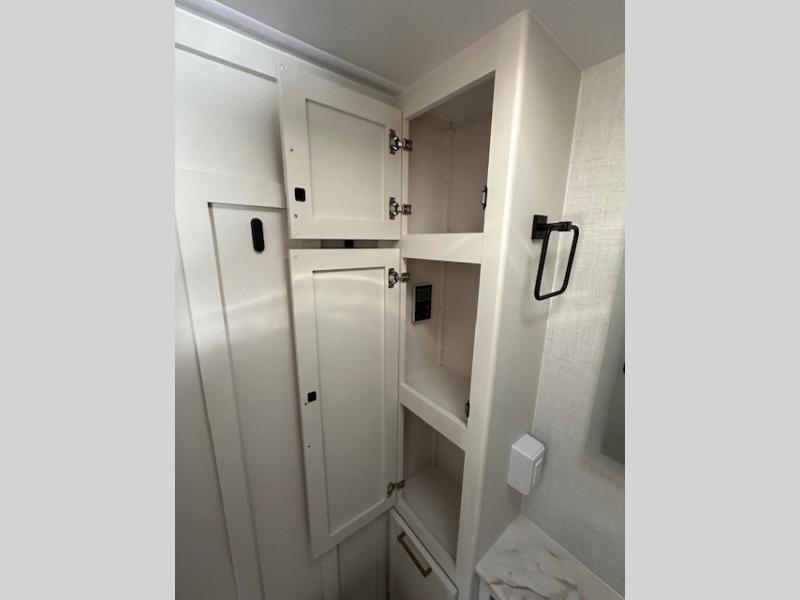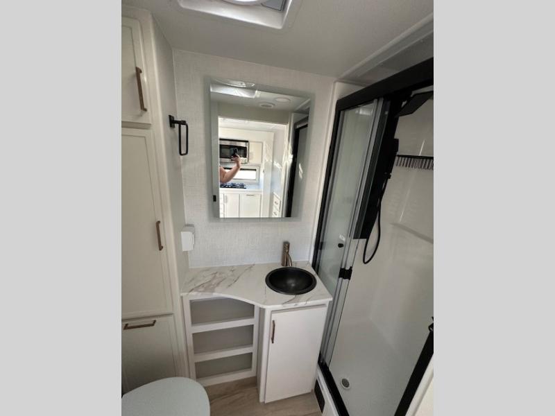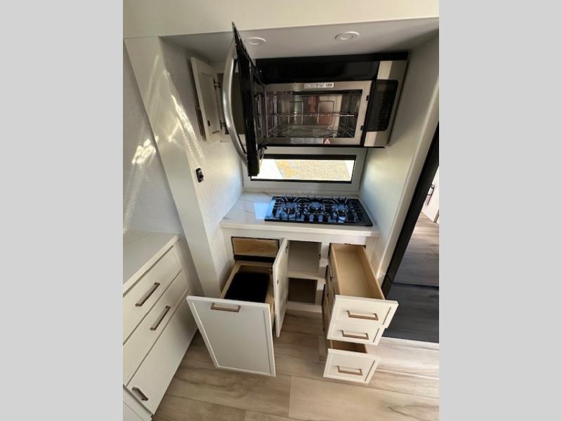 You'll love the amount of space you have in this travel trailer thanks to the large slide out in the main living area. There is comfy theater seating here, along with the kitchen appliances plus a pantry with drawers and an outlet. And a tri-fold sofa option can be chosen in place of theater seating if you're needing sleeping space for guests. You can dine at the pull-out dining table with a drawer, which is right in front of the pull-down interior/exterior screen. A full bath with a 36" x 30" shower will let you freshen up each day, and the king bed in the front bedroom includes a room divider in front for added privacy!