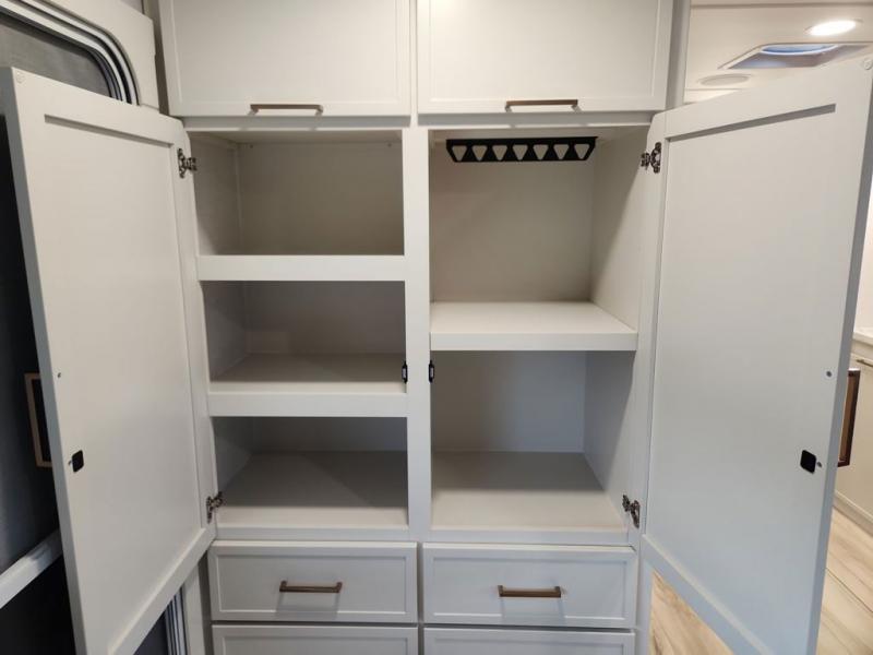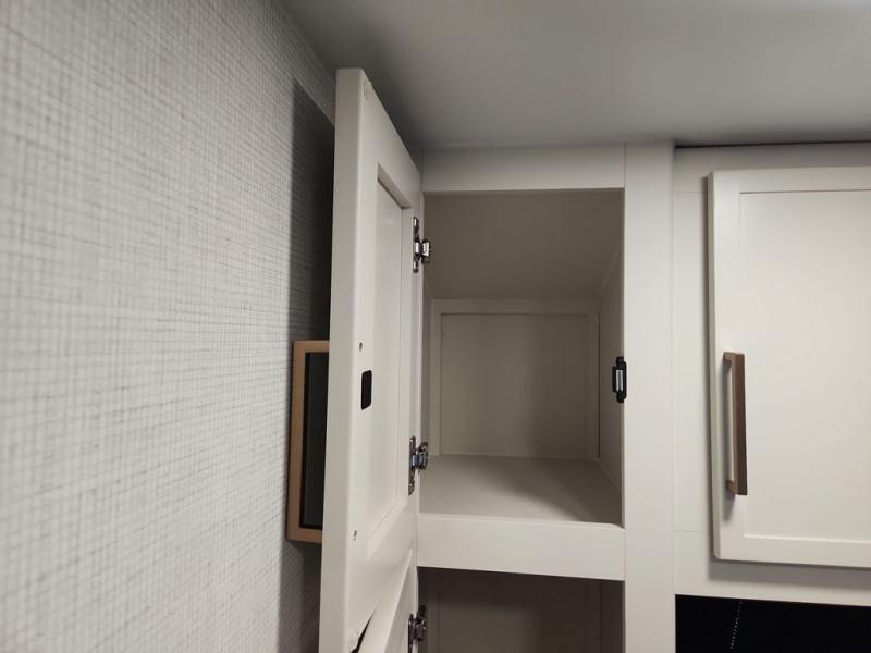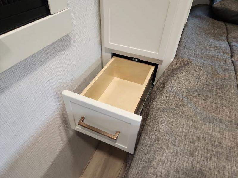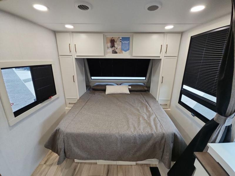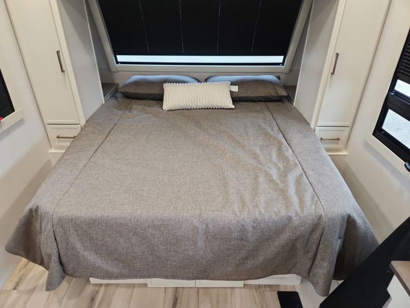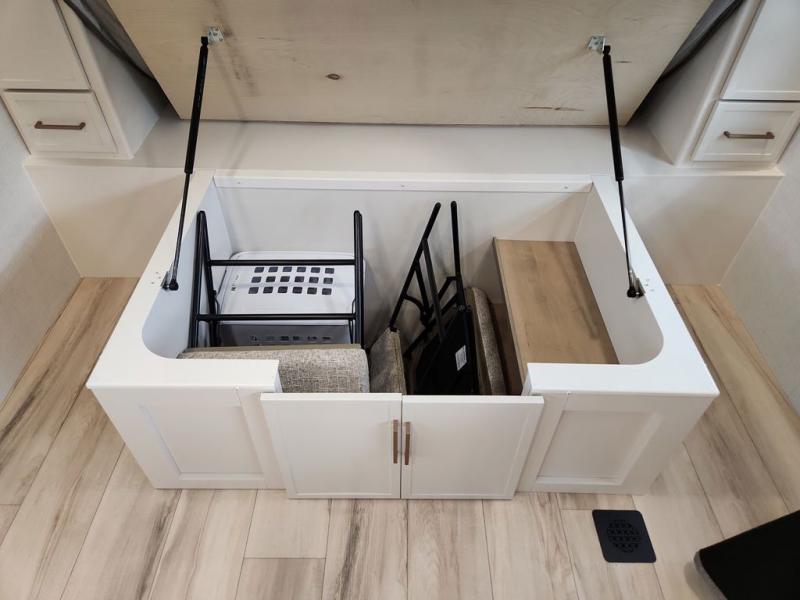 You'll love the amount of space you have in this travel trailer thanks to the large slide out in the main living area. There is comfy theater seating here, along with the kitchen appliances plus a pantry with drawers and an outlet. And a tri-fold sofa option can be chosen in place of theater seating if you're needing sleeping space for guests. You can dine at the pull-out dining table with a drawer, which is right in front of the pull-down interior/exterior screen. A full bath with a 36" x 30" shower will let you freshen up each day, and the king bed in the front bedroom includes a room divider in front for added privacy!