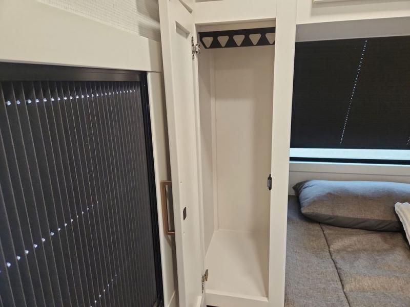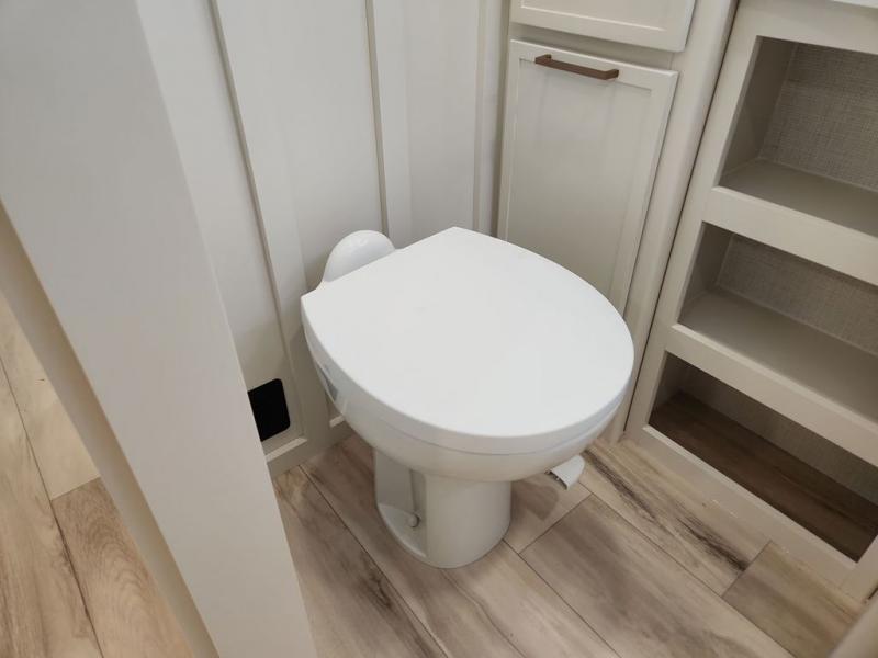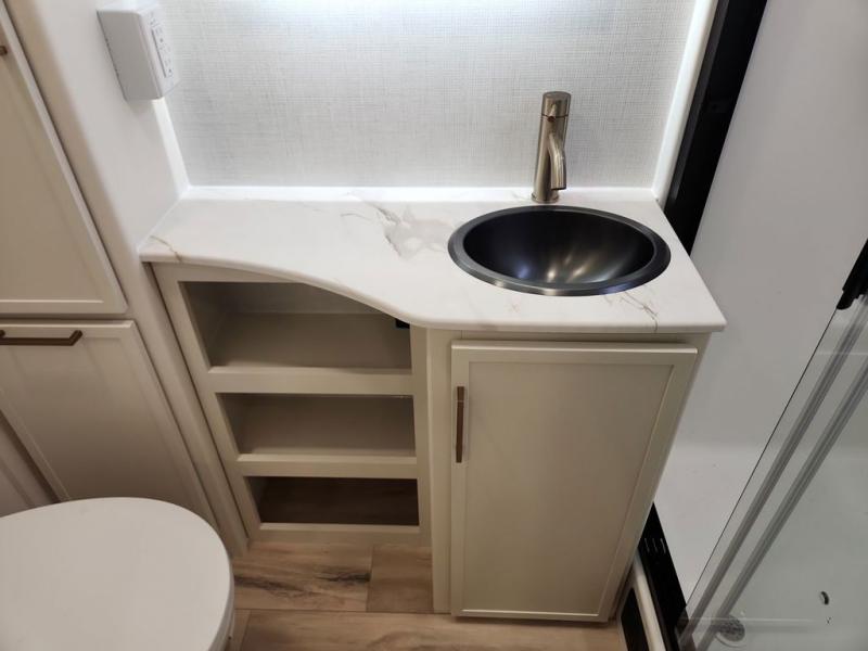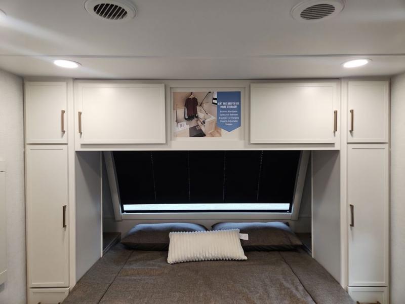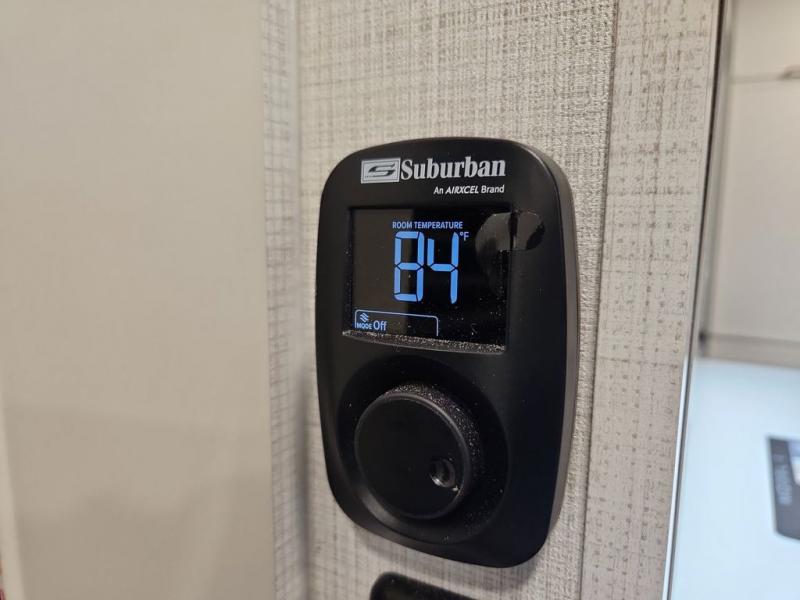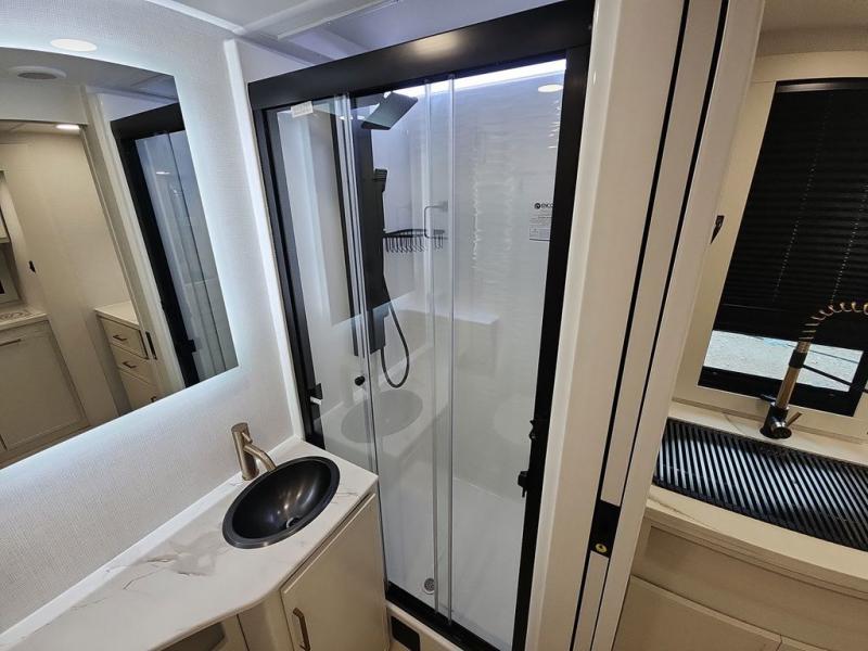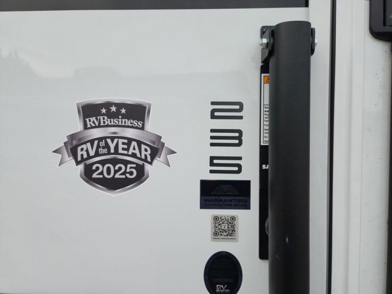 You'll love the amount of space you have in this travel trailer thanks to the large slide out in the main living area. There is comfy theater seating here, along with the kitchen appliances plus a pantry with drawers and an outlet. And a tri-fold sofa option can be chosen in place of theater seating if you're needing sleeping space for guests. You can dine at the pull-out dining table with a drawer, which is right in front of the pull-down interior/exterior screen. A full bath with a 36" x 30" shower will let you freshen up each day, and the king bed in the front bedroom includes a room divider in front for added privacy!