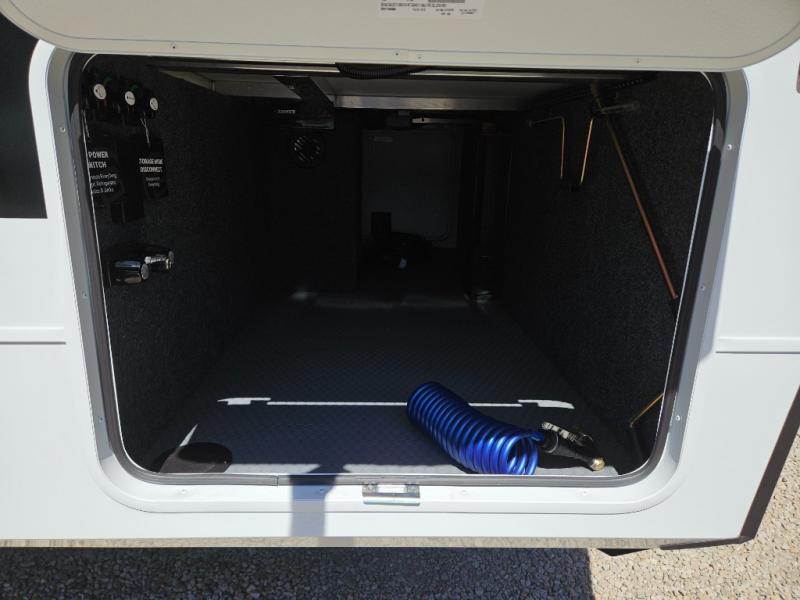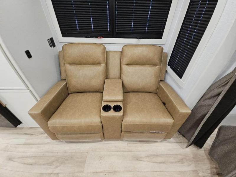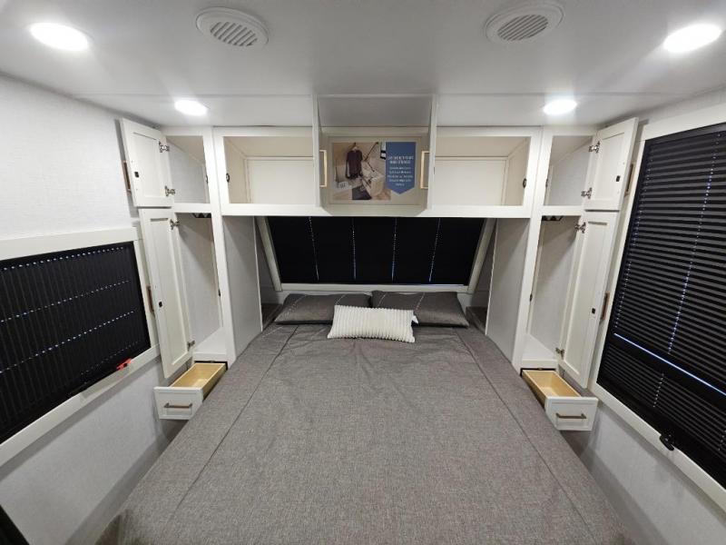You'll love the amount of space you have in this travel trailer thanks to the large slide out in the main living area. There is comfy theater seating here, along with the kitchen appliances plus a pantry with drawers and an outlet. And a tri-fold sofa option can be chosen in place of theater seating if you're needing sleeping space for guests. You can dine at the pull-out dining table with a drawer, which is right in front of the pull-down interior/exterior screen. A full bath with a 36" x 30" shower will let you freshen up each day, and the king bed in the front bedroom includes a room divider in front for added privacy!