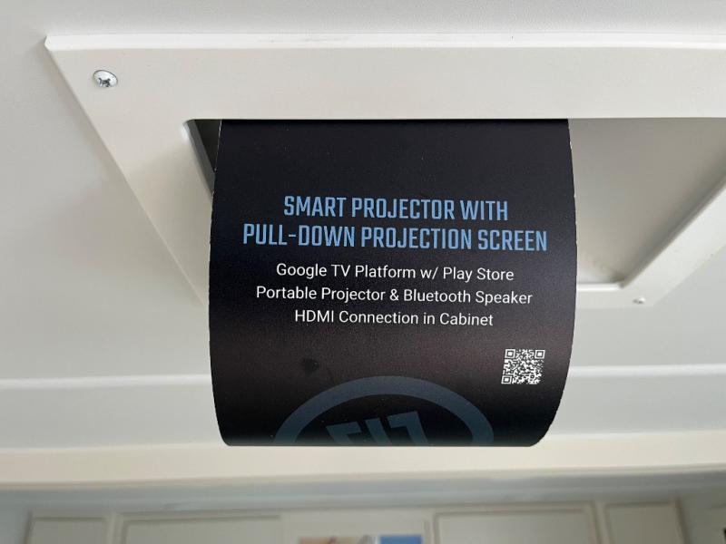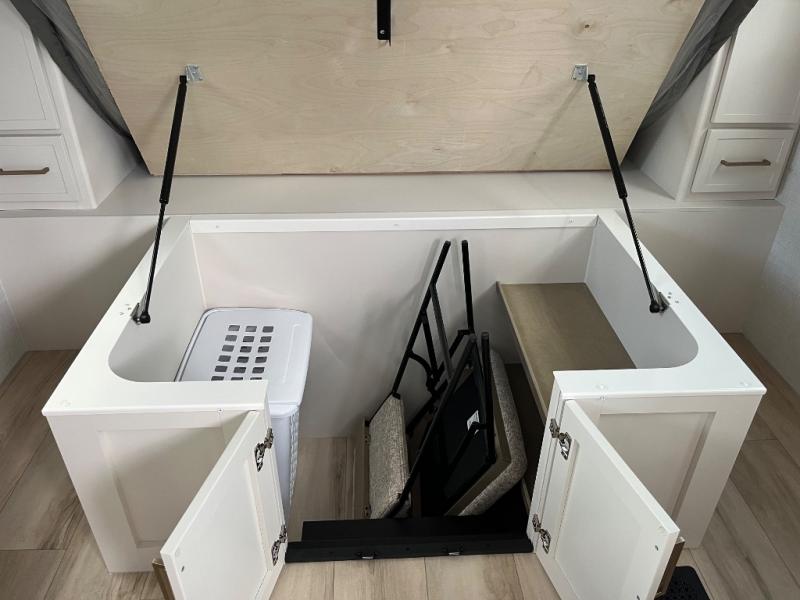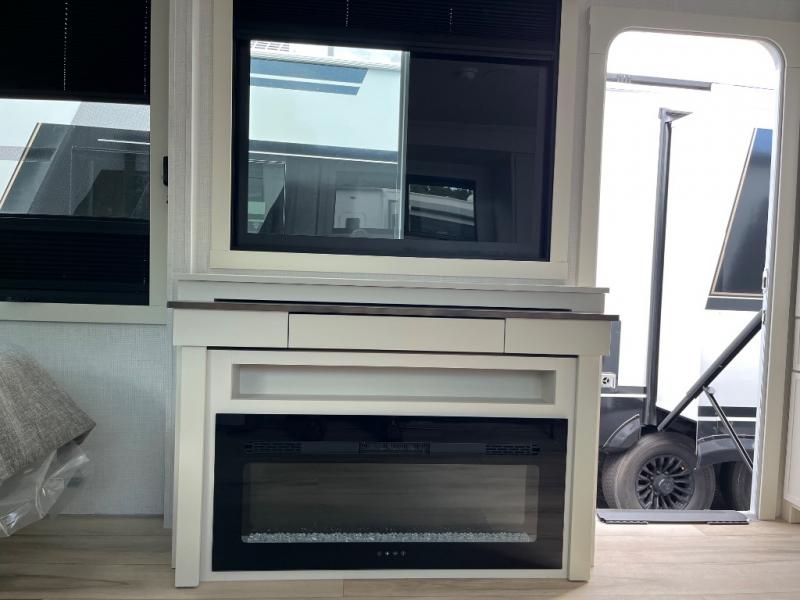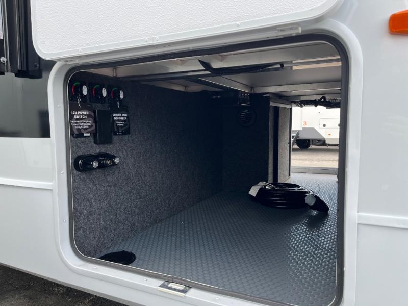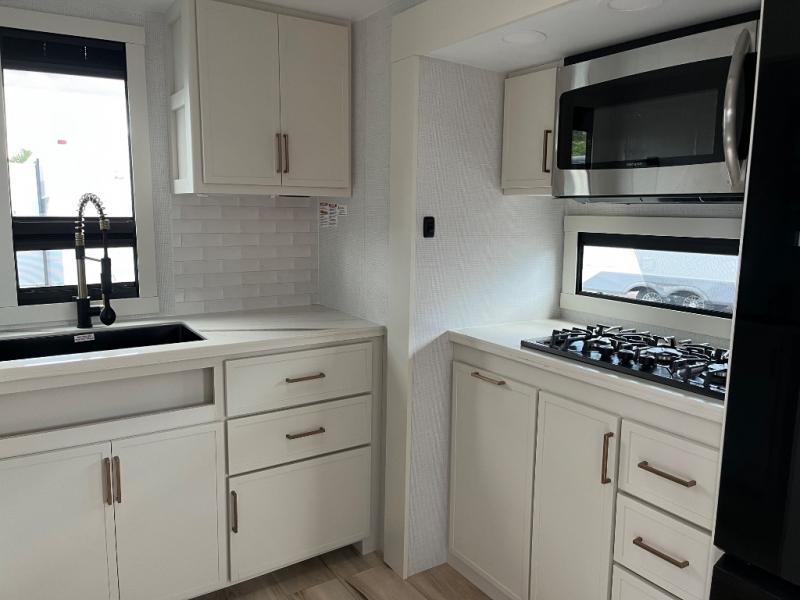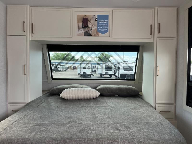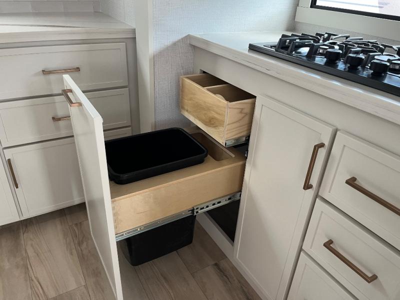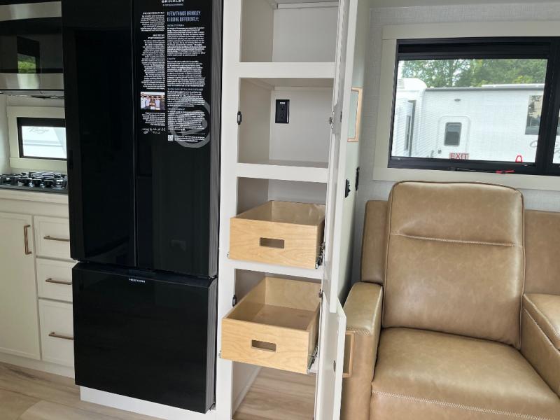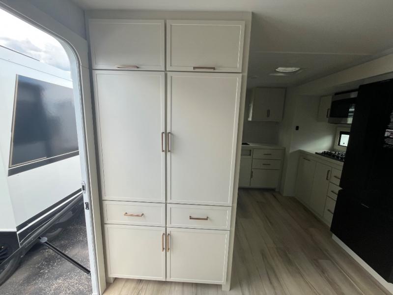 You'll love the amount of space you have in this travel trailer thanks to the large slide out in the main living area. There is comfy theater seating here, along with the kitchen appliances plus a pantry with drawers and an outlet. And a tri-fold sofa option can be chosen in place of theater seating if you're needing sleeping space for guests. You can dine at the pull-out dining table with a drawer, which is right in front of the pull-down interior/exterior screen. A full bath with a 36" x 30" shower will let you freshen up each day, and the king bed in the front bedroom includes a room divider in front for added privacy!