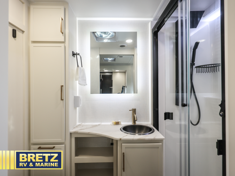 You'll love the amount of space you have in this travel trailer thanks to the large slide out in the main living area. There is comfy theater seating here, along with the kitchen appliances plus a pantry with drawers and an outlet. And a tri-fold sofa option can be chosen in place of theater seating if you're needing sleeping space for guests. You can dine at the pull-out dining table with a drawer, which is right in front of the pull-down interior/exterior screen. A full bath with a 36" x 30" shower will let you freshen up each day, and the king bed in the front bedroom includes a room divider in front for added privacy!