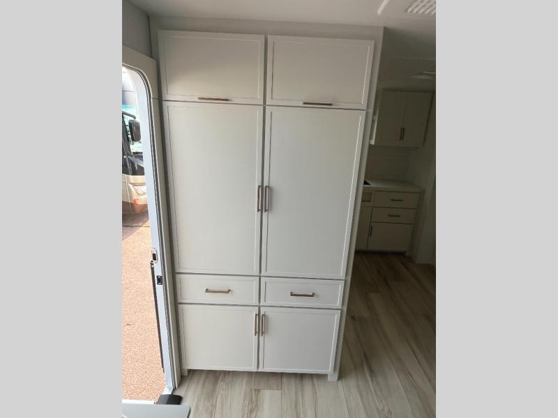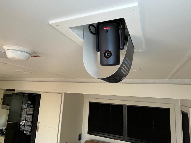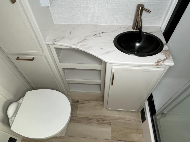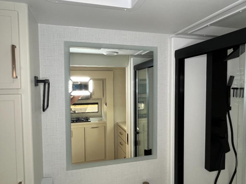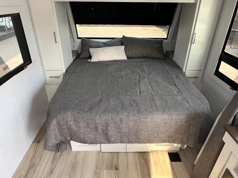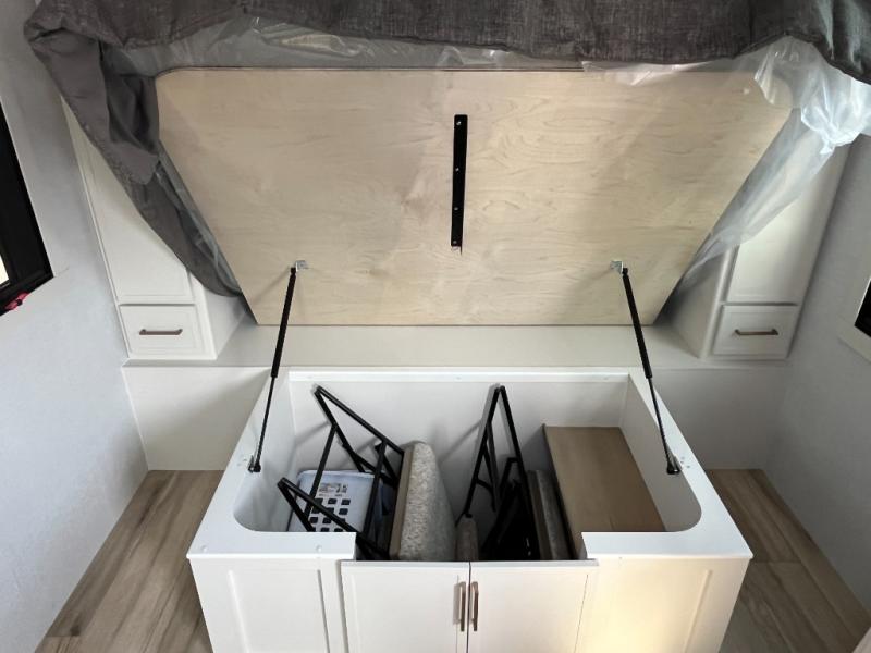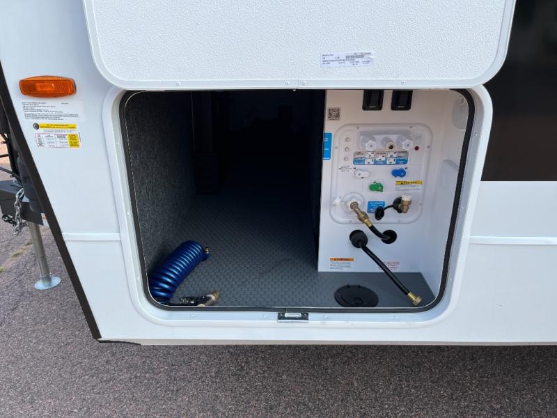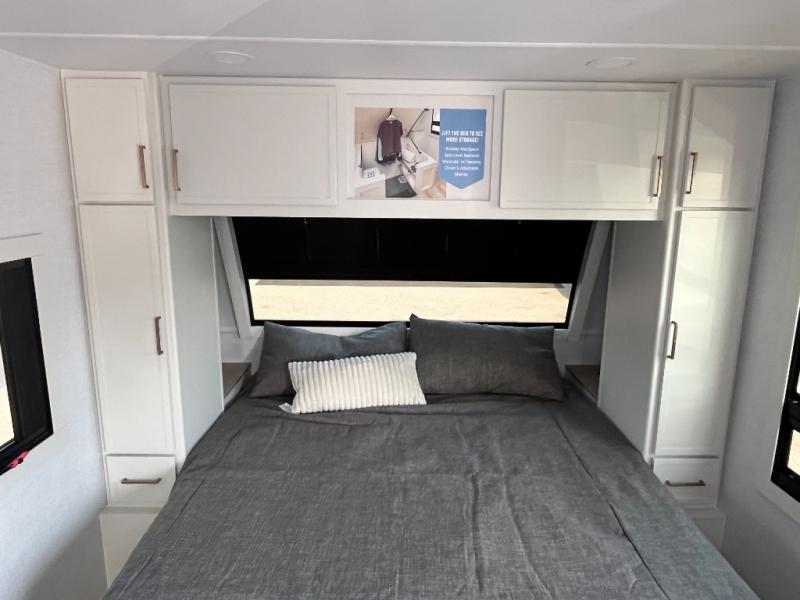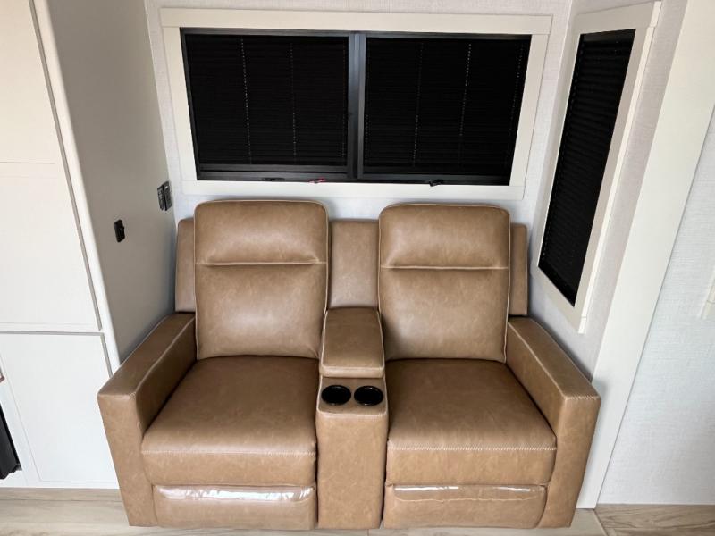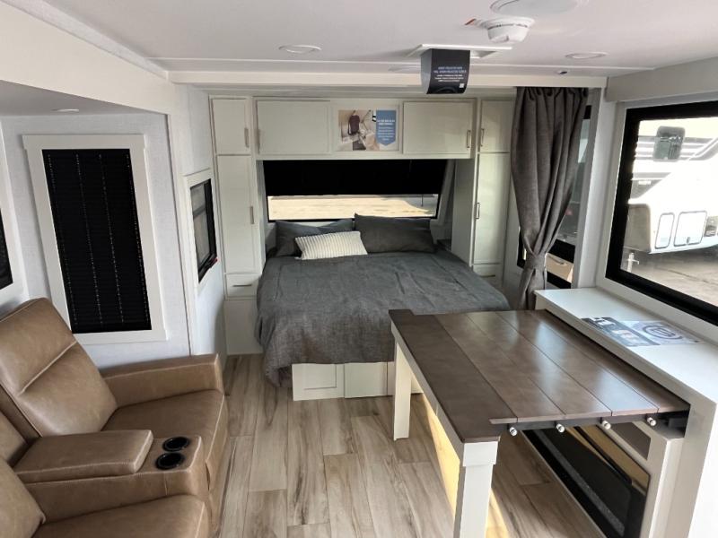 You'll love the amount of space you have in this travel trailer thanks to the large slide out in the main living area. There is comfy theater seating here, along with the kitchen appliances plus a pantry with drawers and an outlet. And a tri-fold sofa option can be chosen in place of theater seating if you're needing sleeping space for guests. You can dine at the pull-out dining table with a drawer, which is right in front of the pull-down interior/exterior screen. A full bath with a 36" x 30" shower will let you freshen up each day, and the king bed in the front bedroom includes a room divider in front for added privacy!