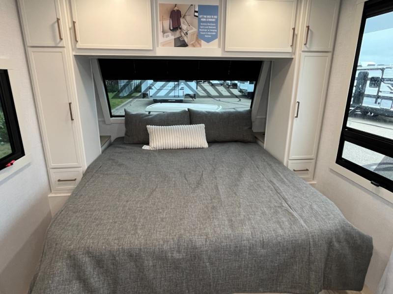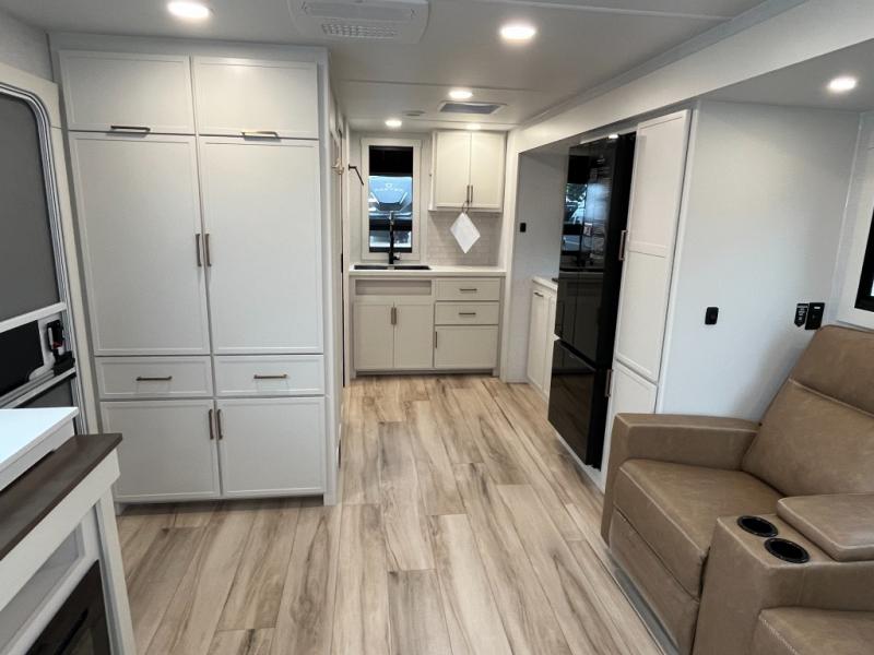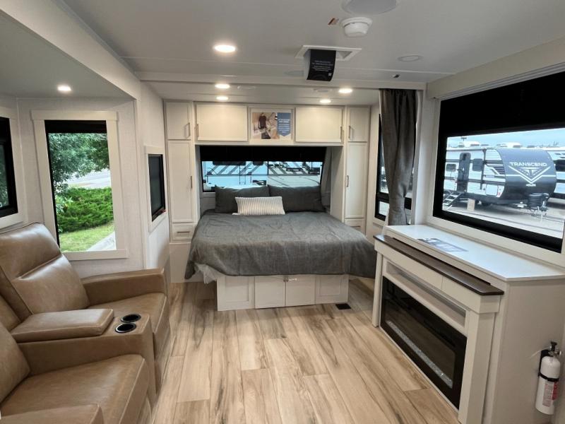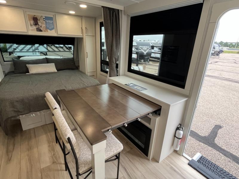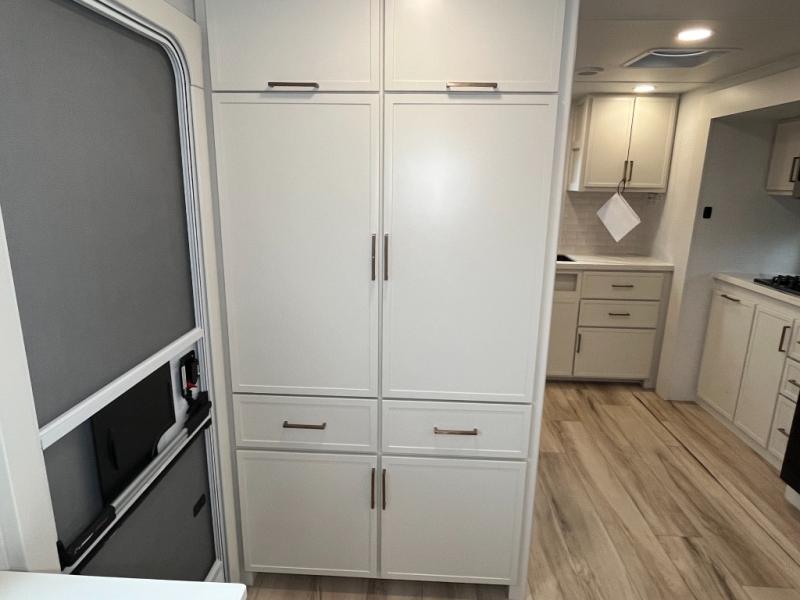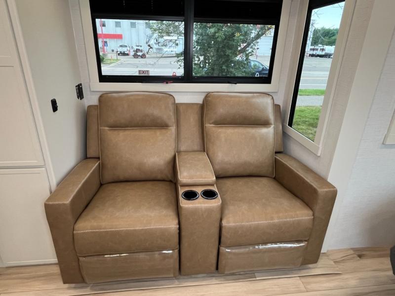 You'll love the amount of space you have in this travel trailer thanks to the large slide out in the main living area. There is comfy theater seating here, along with the kitchen appliances plus a pantry with drawers and an outlet. And a tri-fold sofa option can be chosen in place of theater seating if you're needing sleeping space for guests. You can dine at the pull-out dining table with a drawer, which is right in front of the pull-down interior/exterior screen. A full bath with a 36" x 30" shower will let you freshen up each day, and the king bed in the front bedroom includes a room divider in front for added privacy!