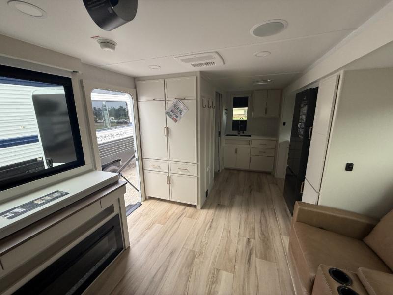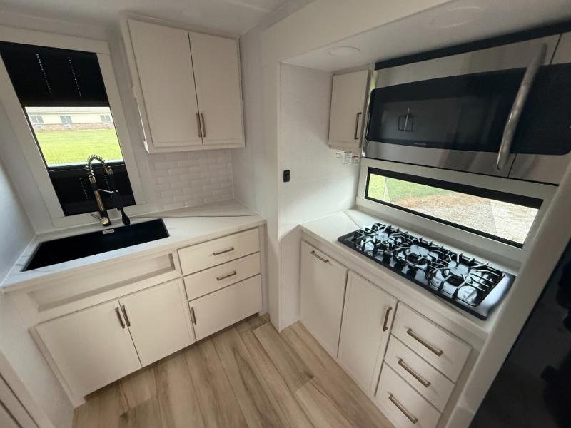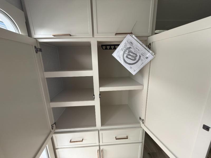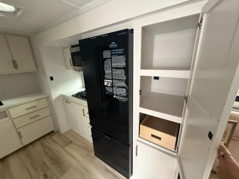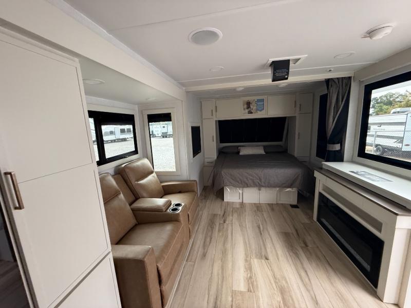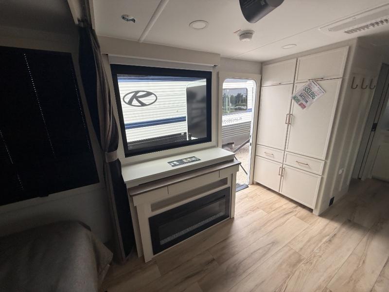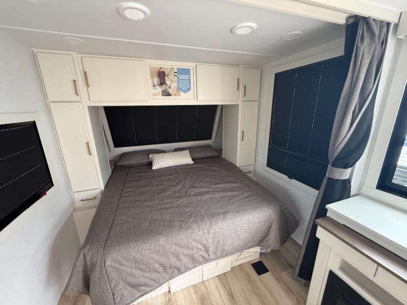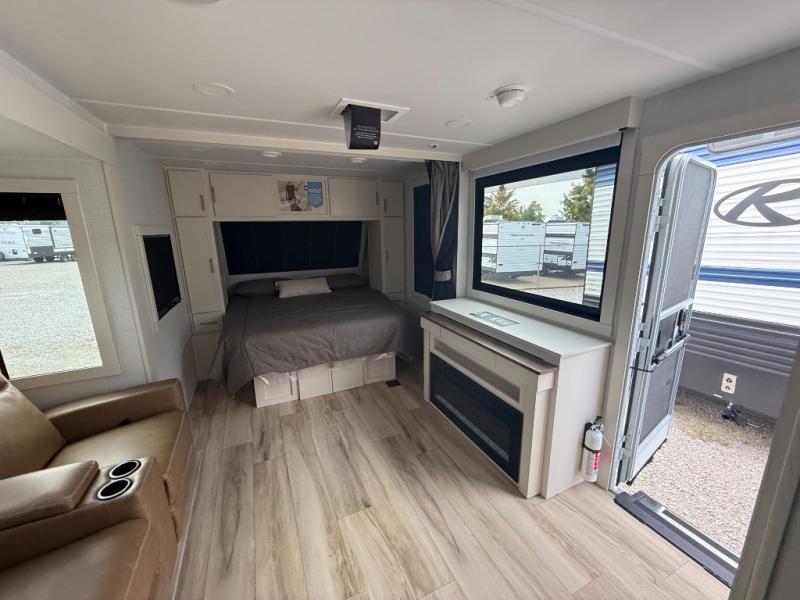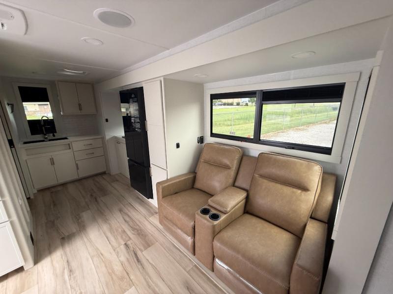 You'll love the amount of space you have in this travel trailer thanks to the large slide out in the main living area. There is comfy theater seating here, along with the kitchen appliances plus a pantry with drawers and an outlet. And a tri-fold sofa option can be chosen in place of theater seating if you're needing sleeping space for guests. You can dine at the pull-out dining table with a drawer, which is right in front of the pull-down interior/exterior screen. A full bath with a 36" x 30" shower will let you freshen up each day, and the king bed in the front bedroom includes a room divider in front for added privacy!