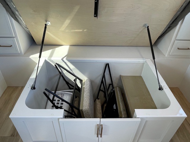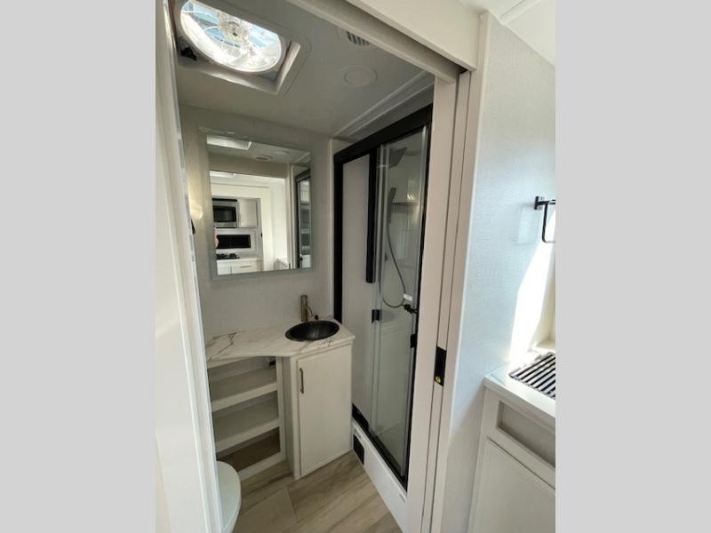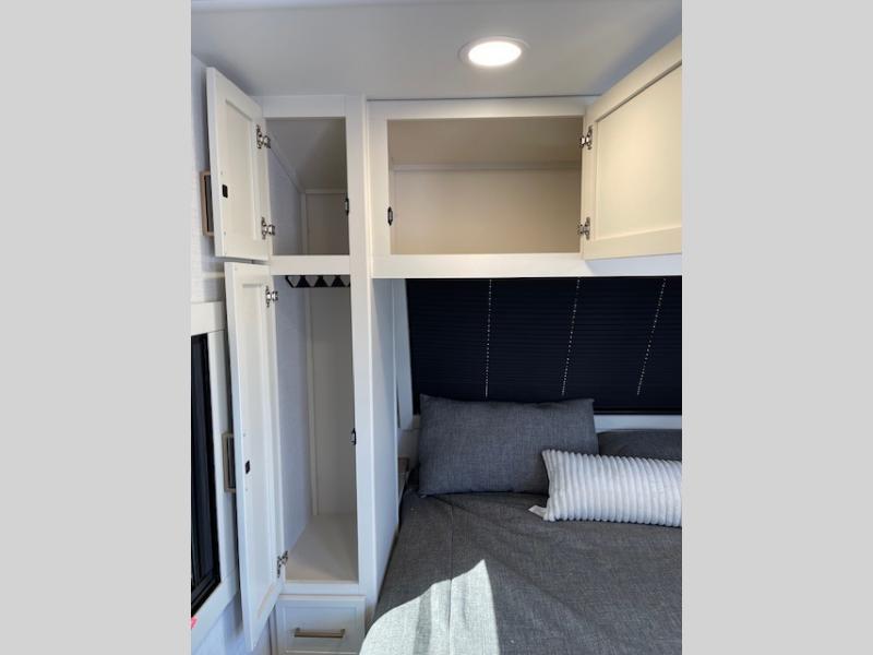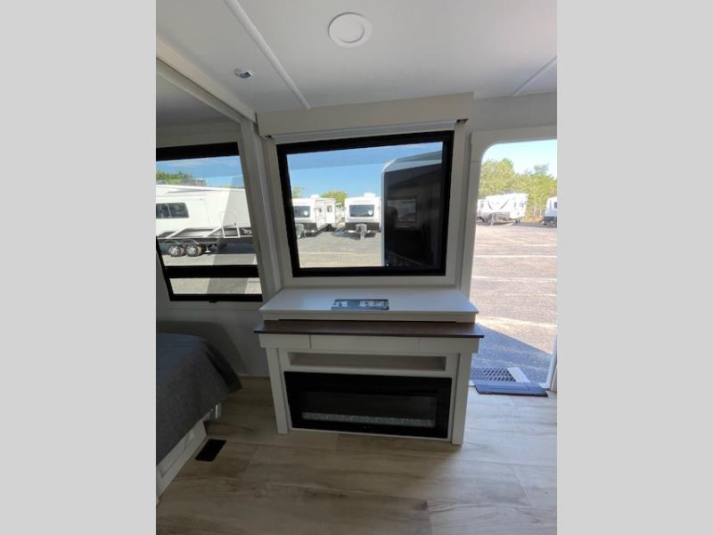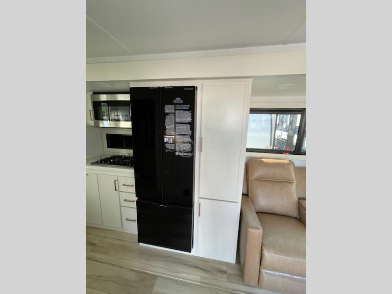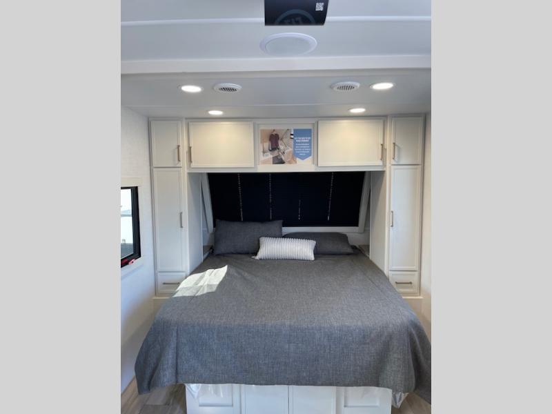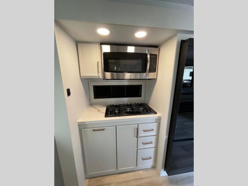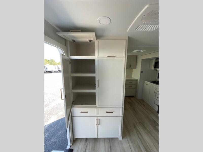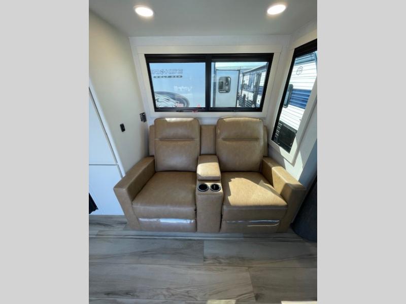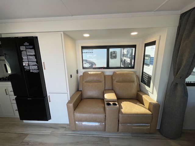 You'll love the amount of space you have in this travel trailer thanks to the large slide out in the main living area. There is comfy theater seating here, along with the kitchen appliances plus a pantry with drawers and an outlet. And a tri-fold sofa option can be chosen in place of theater seating if you're needing sleeping space for guests. You can dine at the pull-out dining table with a drawer, which is right in front of the pull-down interior/exterior screen. A full bath with a 36" x 30" shower will let you freshen up each day, and the king bed in the front bedroom includes a room divider in front for added privacy!