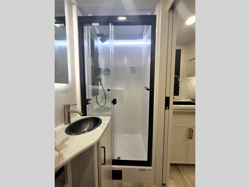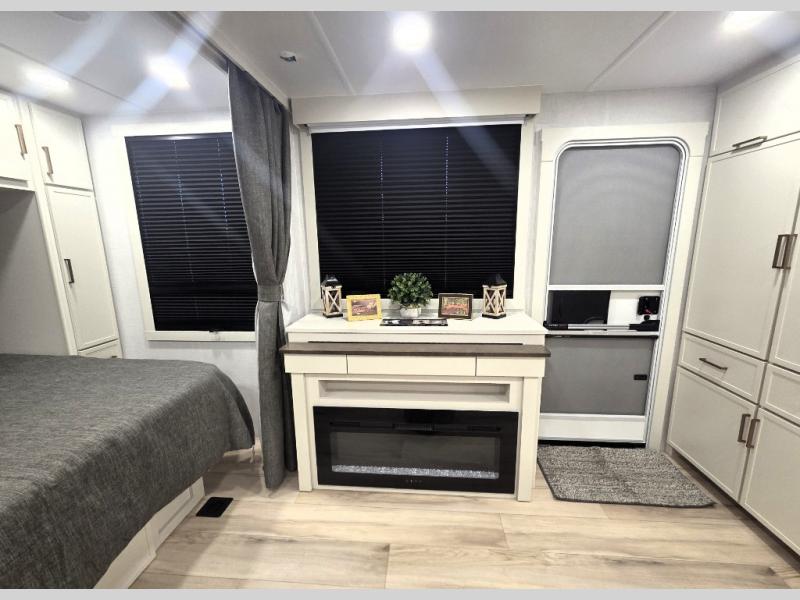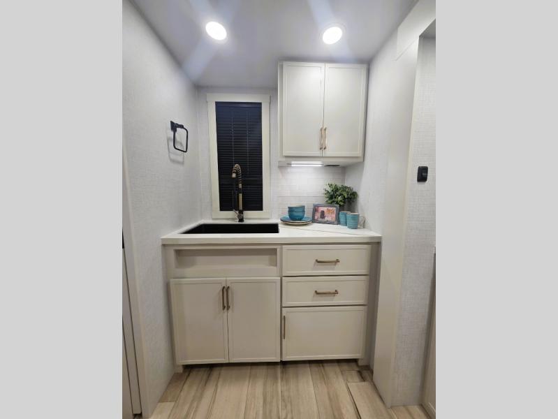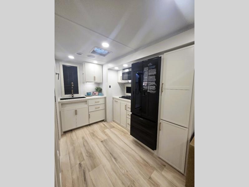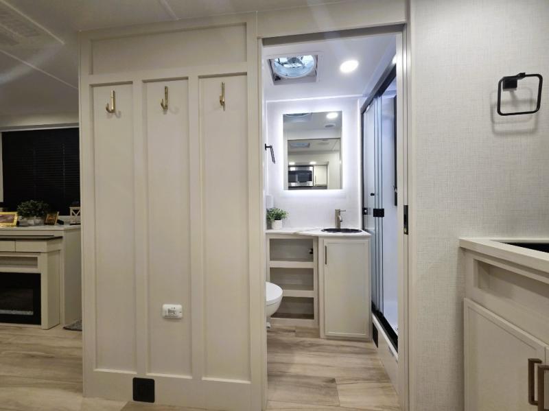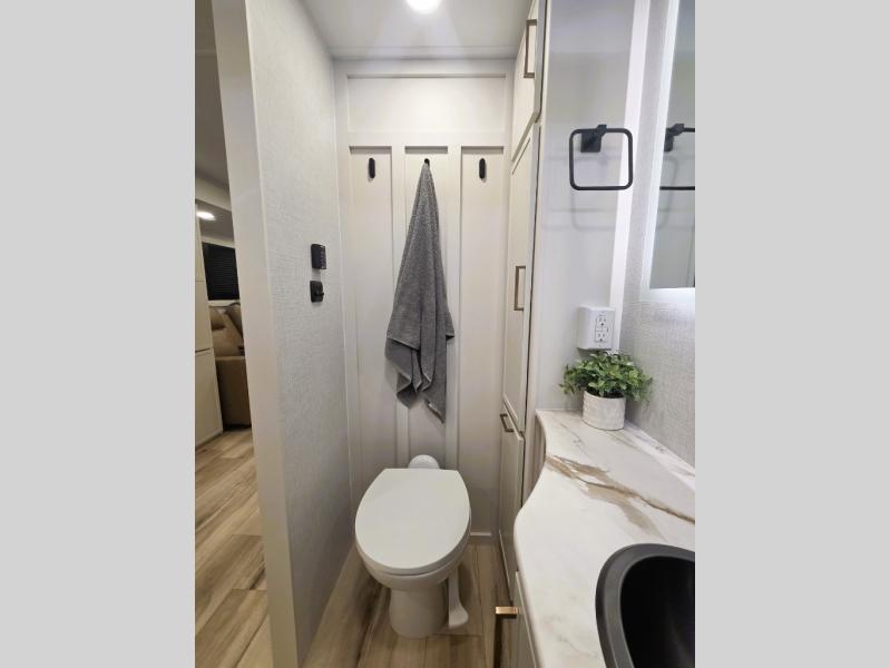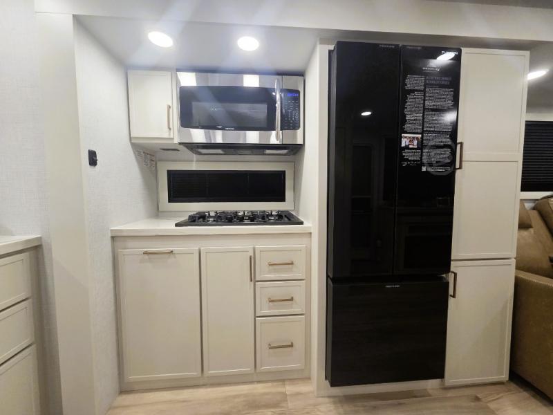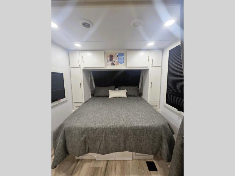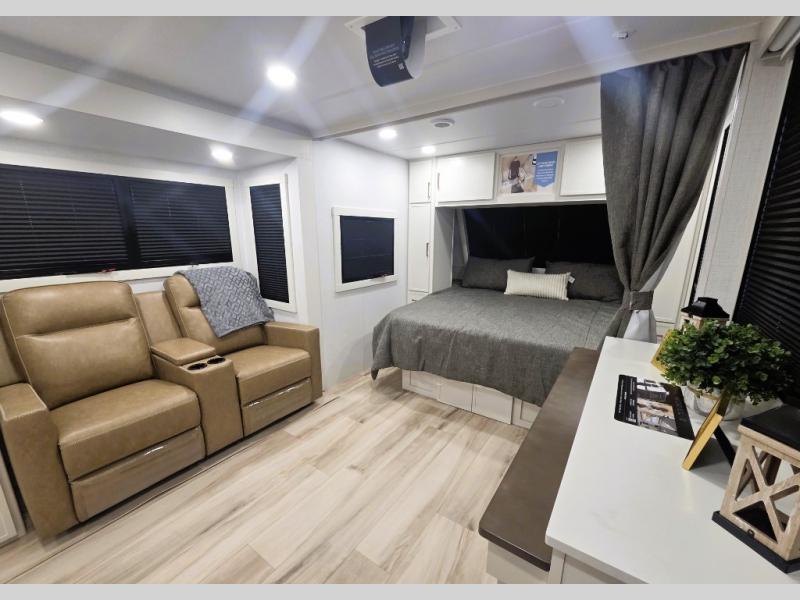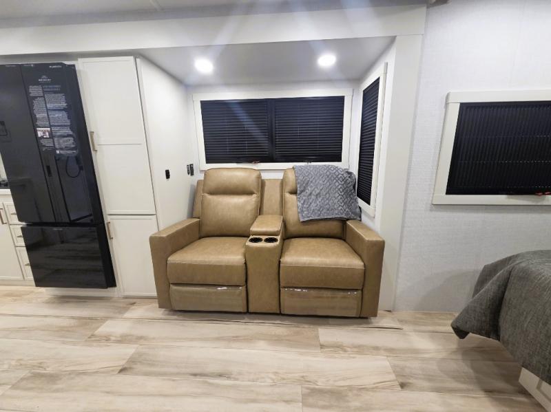 You'll love the amount of space you have in this travel trailer thanks to the large slide out in the main living area. There is comfy theater seating here, along with the kitchen appliances plus a pantry with drawers and an outlet. And a tri-fold sofa option can be chosen in place of theater seating if you're needing sleeping space for guests. You can dine at the pull-out dining table with a drawer, which is right in front of the pull-down interior/exterior screen. A full bath with a 36" x 30" shower will let you freshen up each day, and the king bed in the front bedroom includes a room divider in front for added privacy!