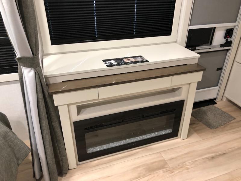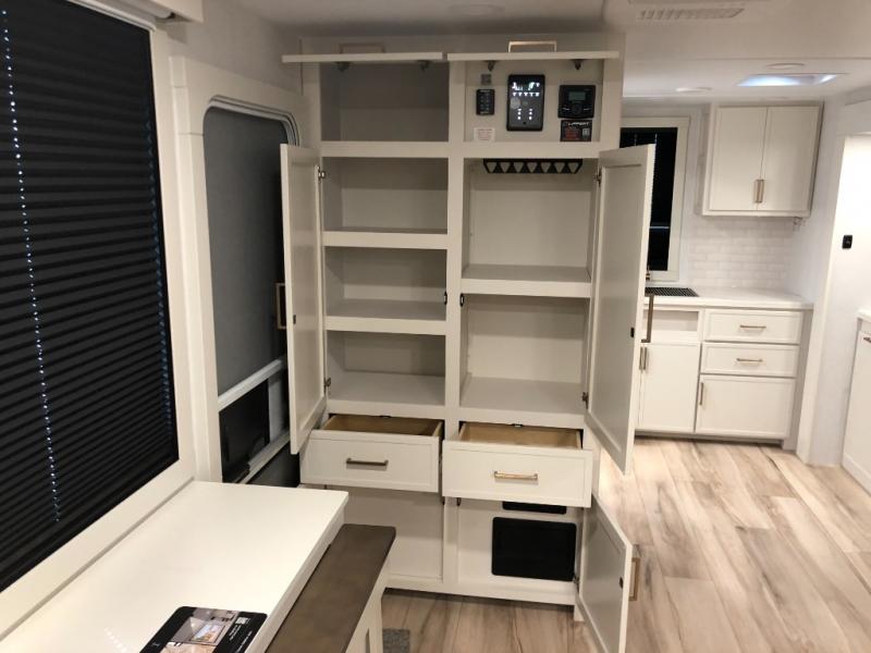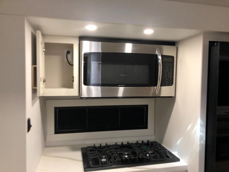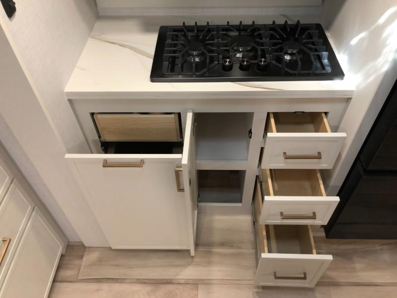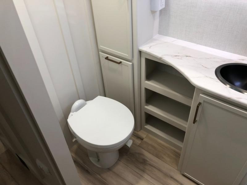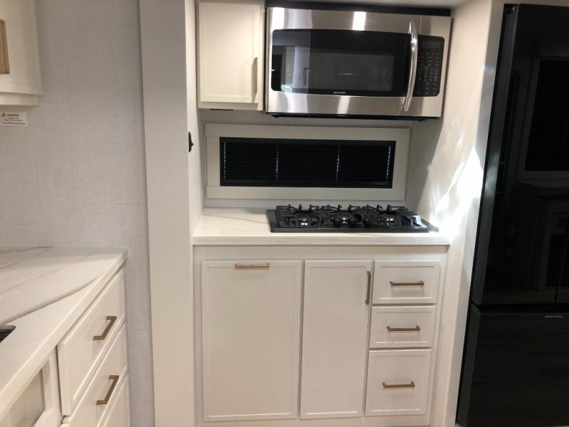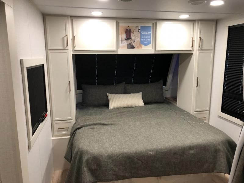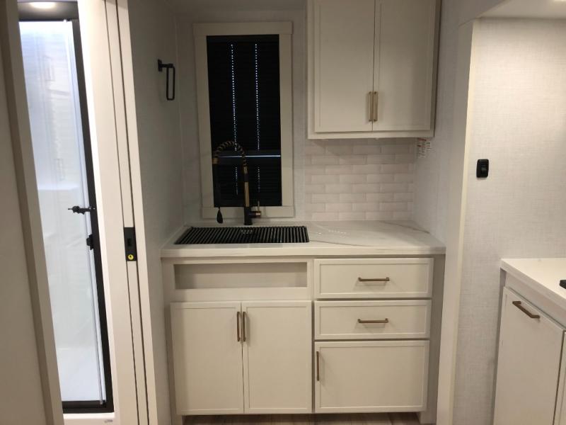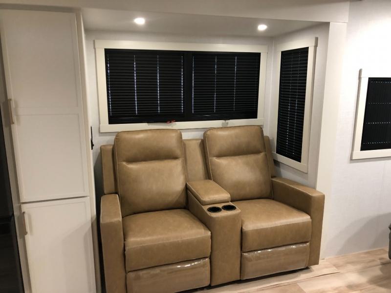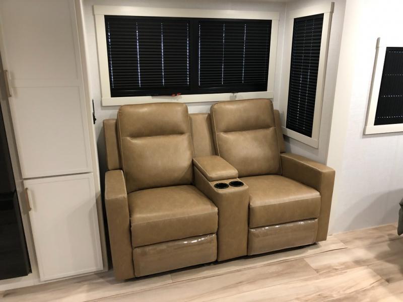 You'll love the amount of space you have in this travel trailer thanks to the large slide out in the main living area. There is comfy theater seating here, along with the kitchen appliances plus a pantry with drawers and an outlet. And a tri-fold sofa option can be chosen in place of theater seating if you're needing sleeping space for guests. You can dine at the pull-out dining table with a drawer, which is right in front of the pull-down interior/exterior screen. A full bath with a 36" x 30" shower will let you freshen up each day, and the king bed in the front bedroom includes a room divider in front for added privacy!
