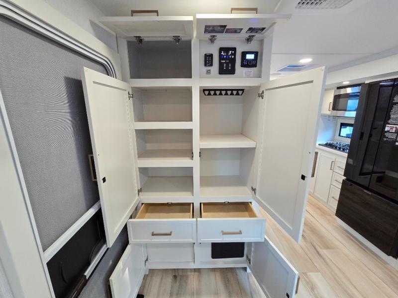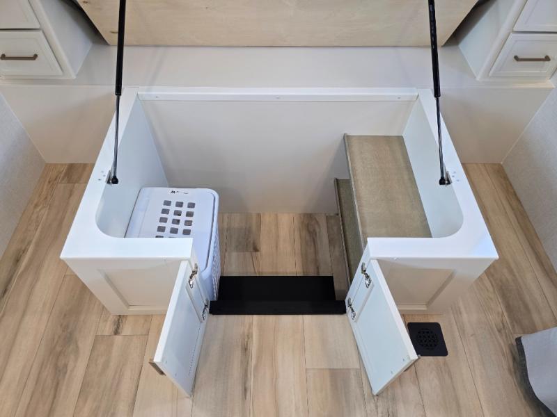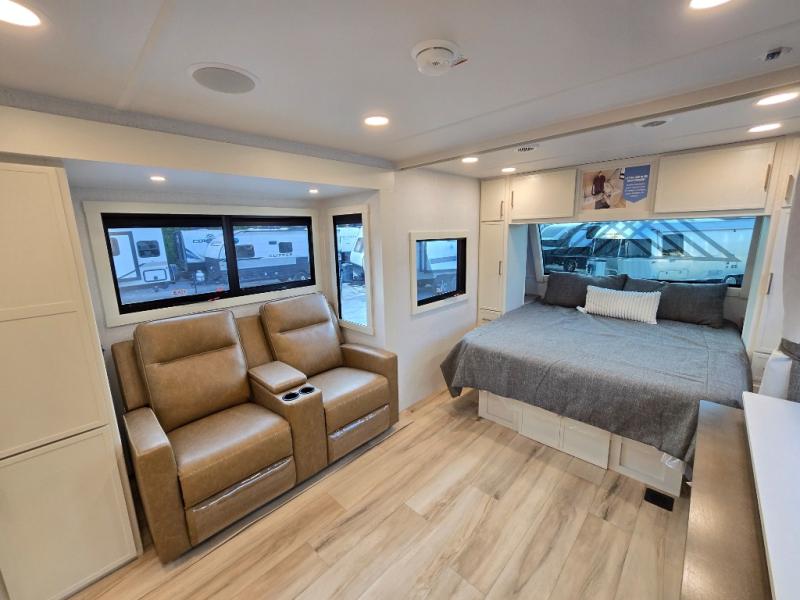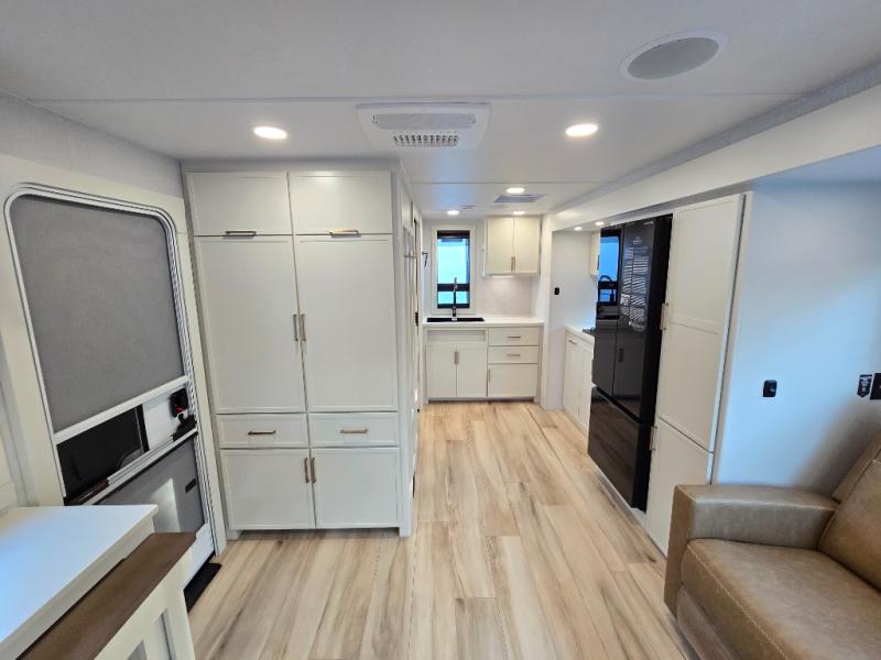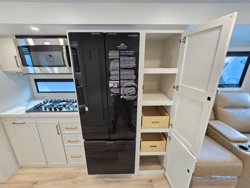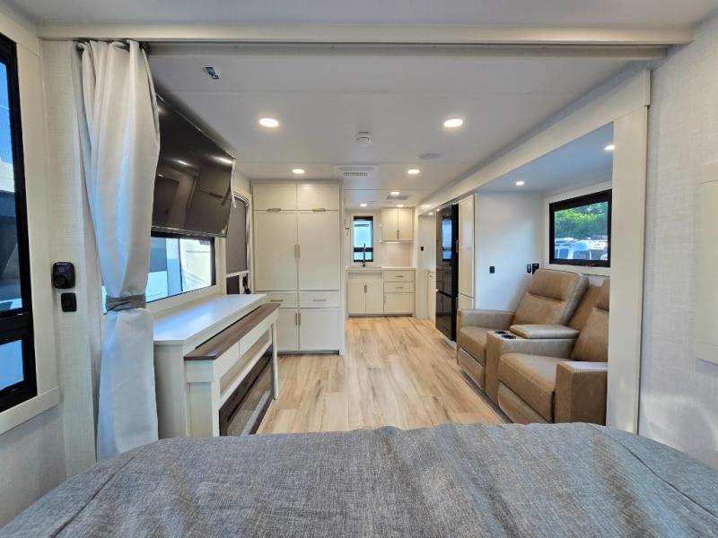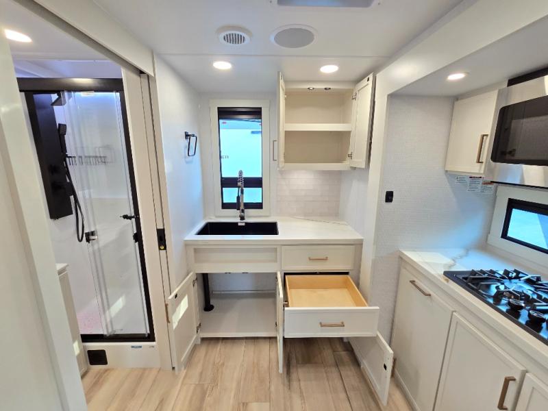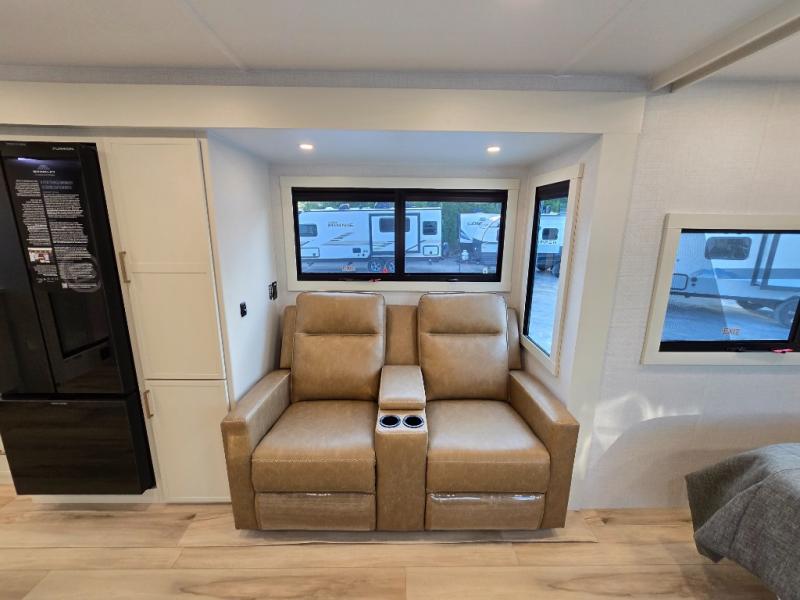 You'll love the amount of space you have in this travel trailer thanks to the large slide out in the main living area. There is comfy theater seating here, along with the kitchen appliances plus a pantry with drawers and an outlet. And a tri-fold sofa option can be chosen in place of theater seating if you're needing sleeping space for guests. You can dine at the pull-out dining table with a drawer, which is right in front of the pull-down interior/exterior screen. A full bath with a 36" x 30" shower will let you freshen up each day, and the king bed in the front bedroom includes a room divider in front for added privacy!