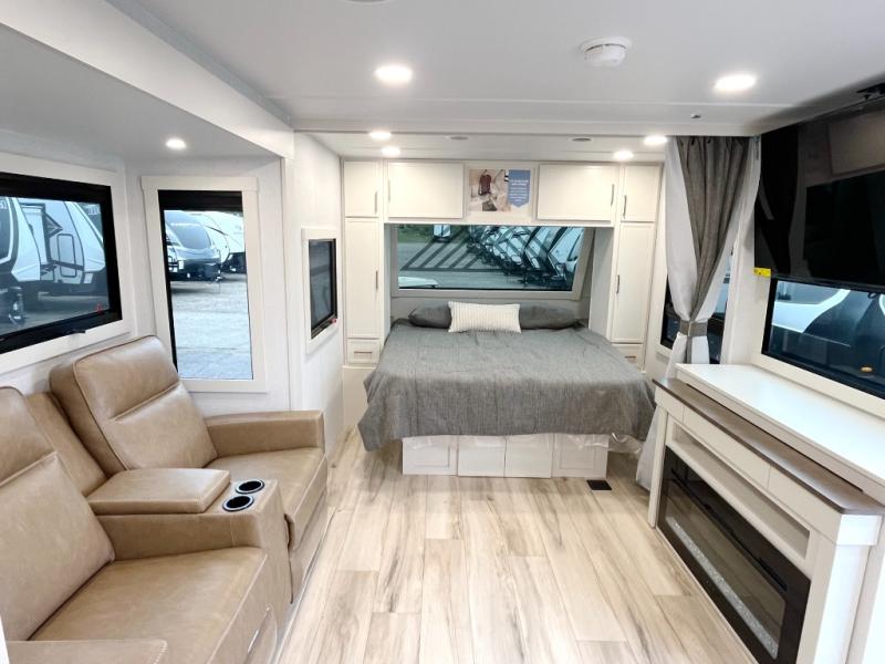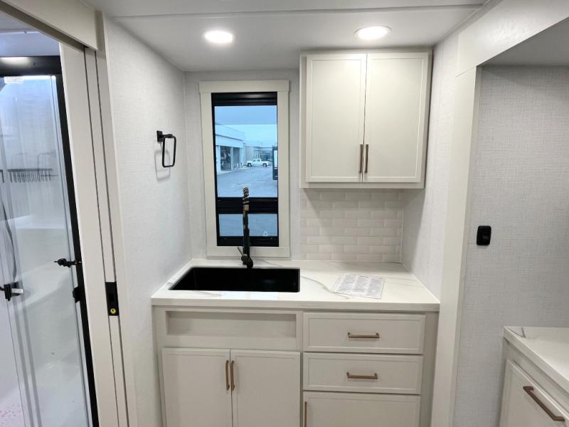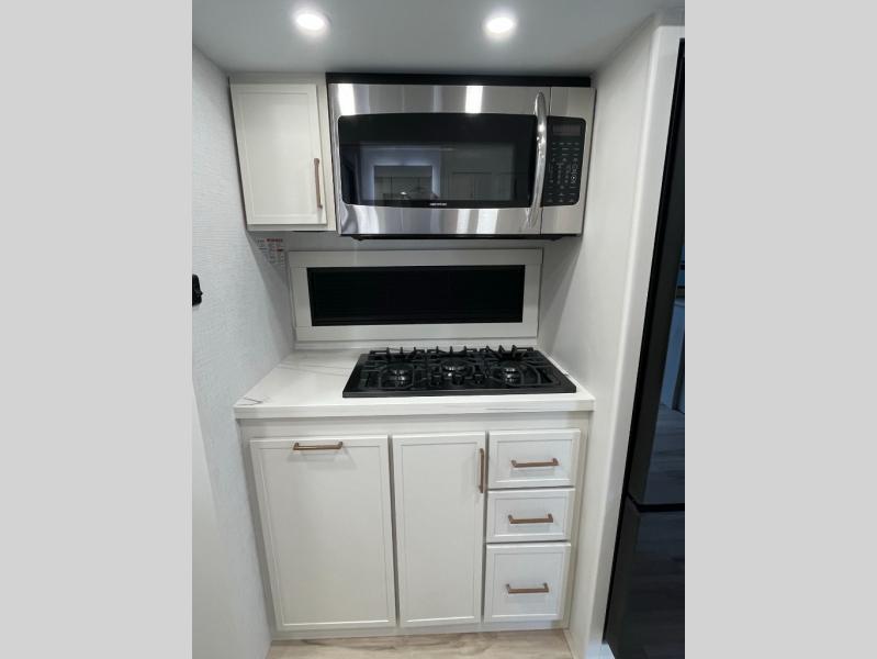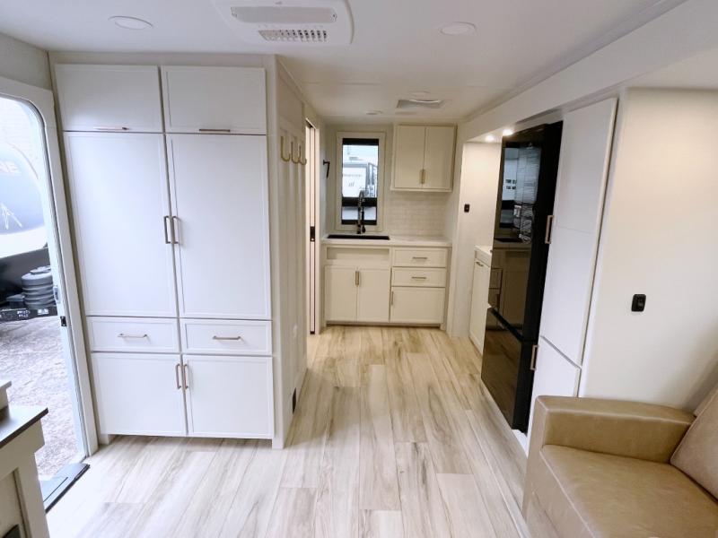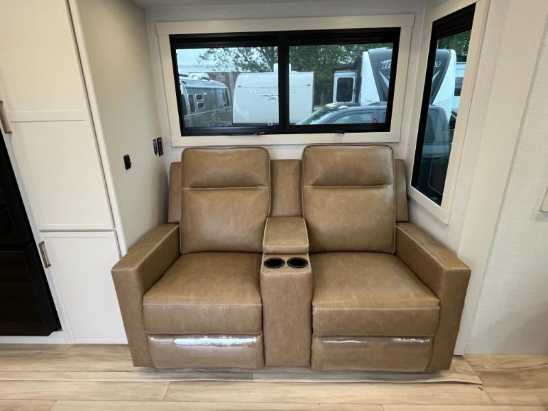 You'll love the amount of space you have in this travel trailer thanks to the large slide out in the main living area. There is comfy theater seating here, along with the kitchen appliances plus a pantry with drawers and an outlet. And a tri-fold sofa option can be chosen in place of theater seating if you're needing sleeping space for guests. You can dine at the pull-out dining table with a drawer, which is right in front of the pull-down interior/exterior screen. A full bath with a 36" x 30" shower will let you freshen up each day, and the king bed in the front bedroom includes a room divider in front for added privacy!