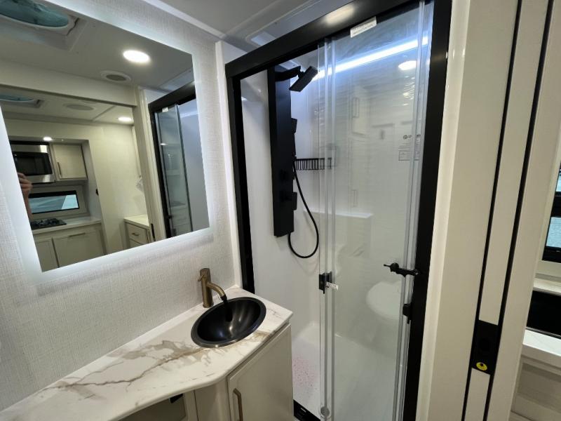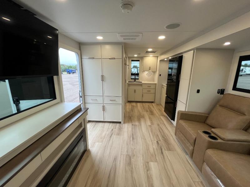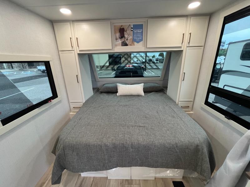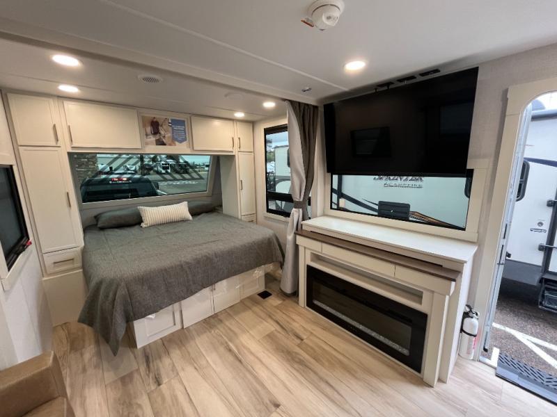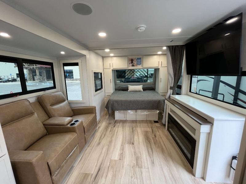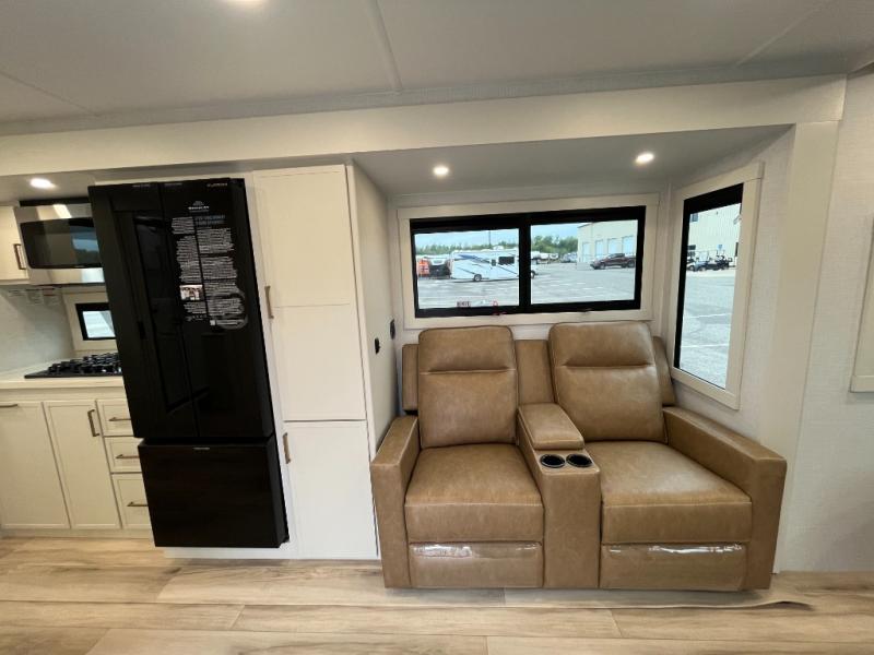 You'll love the amount of space you have in this travel trailer thanks to the large slide out in the main living area. There is comfy theater seating here, along with the kitchen appliances plus a pantry with drawers and an outlet. And a tri-fold sofa option can be chosen in place of theater seating if you're needing sleeping space for guests. You can dine at the pull-out dining table with a drawer, which is right in front of the pull-down interior/exterior screen. A full bath with a 36" x 30" shower will let you freshen up each day, and the king bed in the front bedroom includes a room divider in front for added privacy!