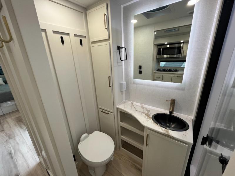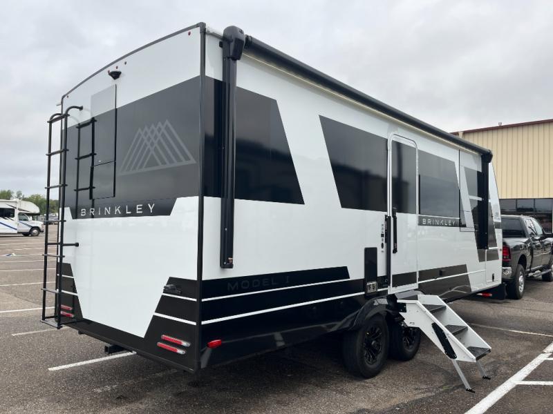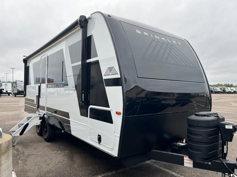 The lightweight Model I travel trailer by Brinkley is the perfect choice for those looking for an easy tow and at-home comforts! There is a drop-frame chassis, high-performance Road Armor suspension equalizer system, and Demco EZ Latch trailer coupler that automatically latches when dropped onto a hitch ball without the need of a safety pin. Additional exterior features include square Euro frameless windows, automotive-grade paint, full-width LED strip lighting in the pass-thru, and a pet & property security campside tie-down to keep your gear and furry friends safe. Inside, you'll be wowed by Brinkley's CraftSense wood trim construction, residential solid surface kitchen countertops, dimmable bedroom lights, and marine-grade neon LED shower lighting to name a few stand-out features!