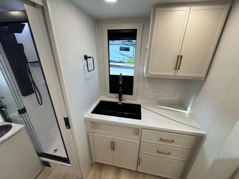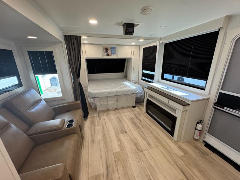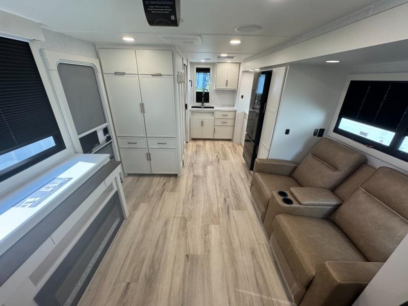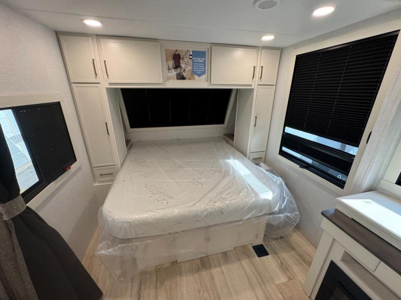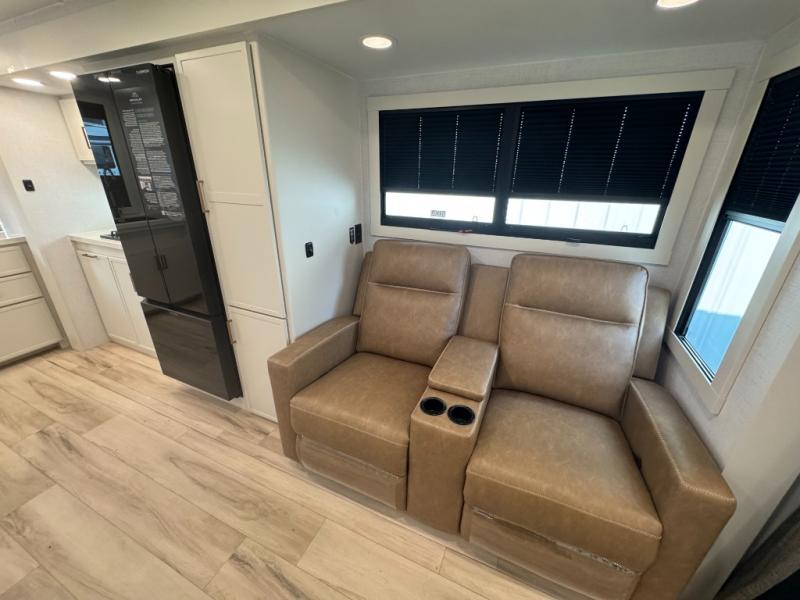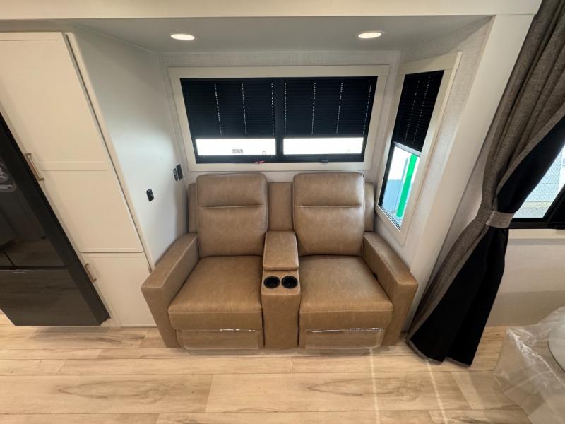 You'll love the amount of space you have in this travel trailer thanks to the large slide out in the main living area. There is comfy theater seating here, along with the kitchen appliances plus a pantry with drawers and an outlet. And a tri-fold sofa option can be chosen in place of theater seating if you're needing sleeping space for guests. You can dine at the pull-out dining table with a drawer, which is right in front of the pull-down interior/exterior screen. A full bath with a 36" x 30" shower will let you freshen up each day, and the king bed in the front bedroom includes a room divider in front for added privacy!