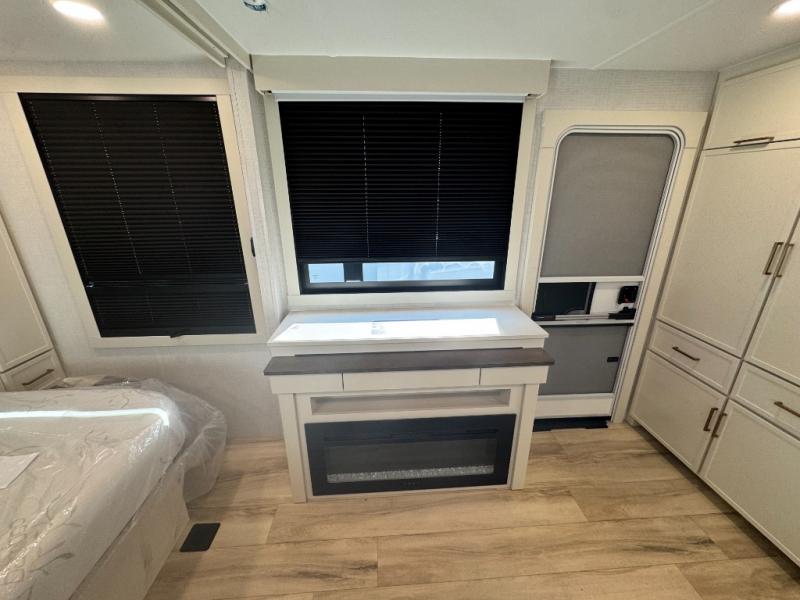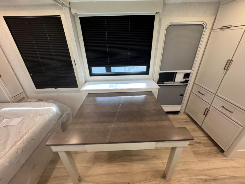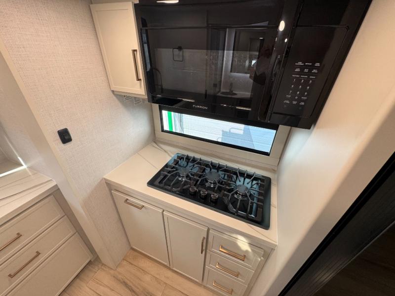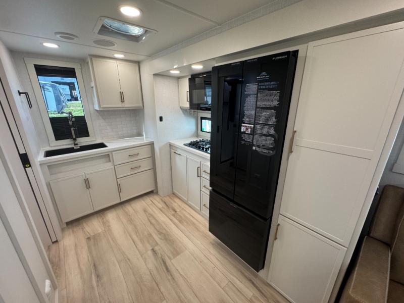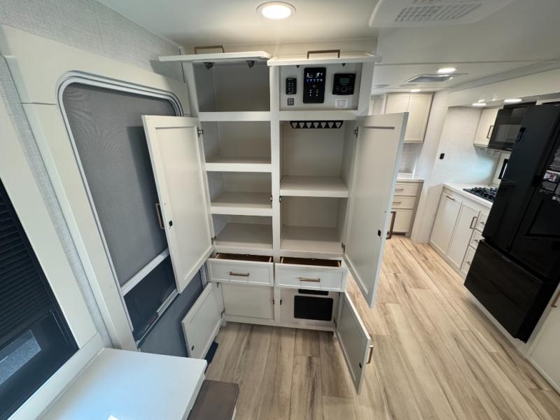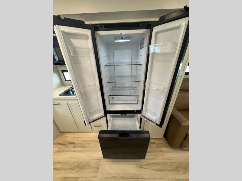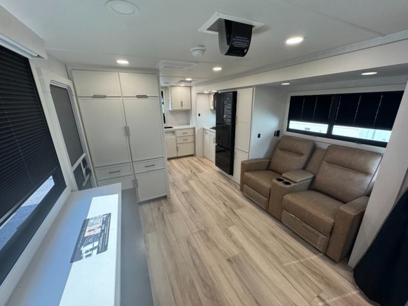 You'll love the amount of space you have in this travel trailer thanks to the large slide out in the main living area. There is comfy theater seating here, along with the kitchen appliances plus a pantry with drawers and an outlet. And a tri-fold sofa option can be chosen in place of theater seating if you're needing sleeping space for guests. You can dine at the pull-out dining table with a drawer, which is right in front of the pull-down interior/exterior screen. A full bath with a 36" x 30" shower will let you freshen up each day, and the king bed in the front bedroom includes a room divider in front for added privacy!