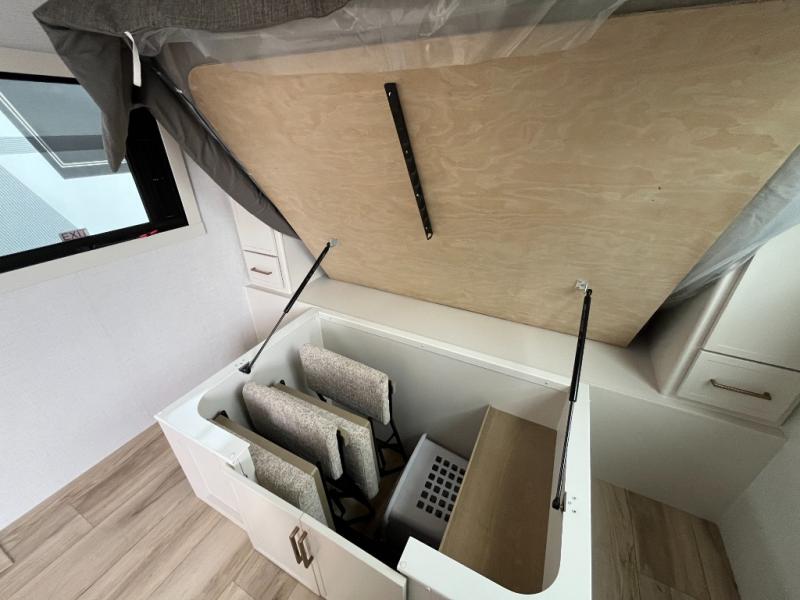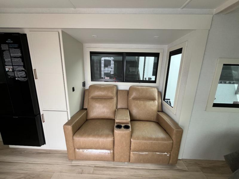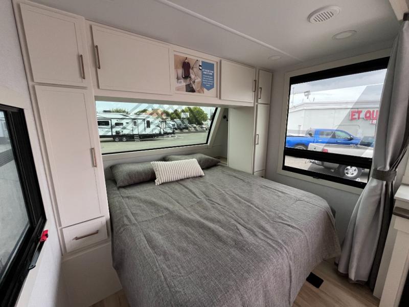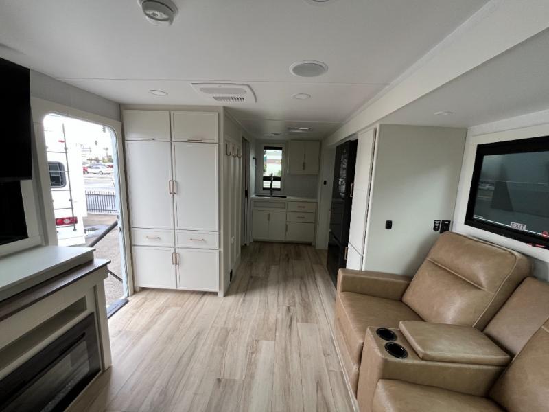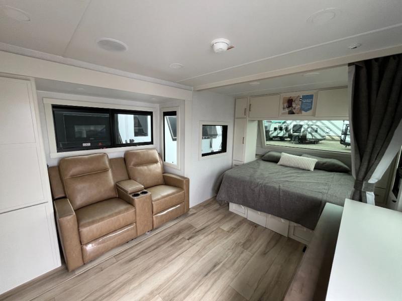 You'll love the amount of space you have in this travel trailer thanks to the large slide out in the main living area. There is comfy theater seating here, along with the kitchen appliances plus a pantry with drawers and an outlet. And a tri-fold sofa option can be chosen in place of theater seating if you're needing sleeping space for guests. You can dine at the pull-out dining table with a drawer, which is right in front of the pull-down interior/exterior screen. A full bath with a 36" x 30" shower will let you freshen up each day, and the king bed in the front bedroom includes a room divider in front for added privacy!