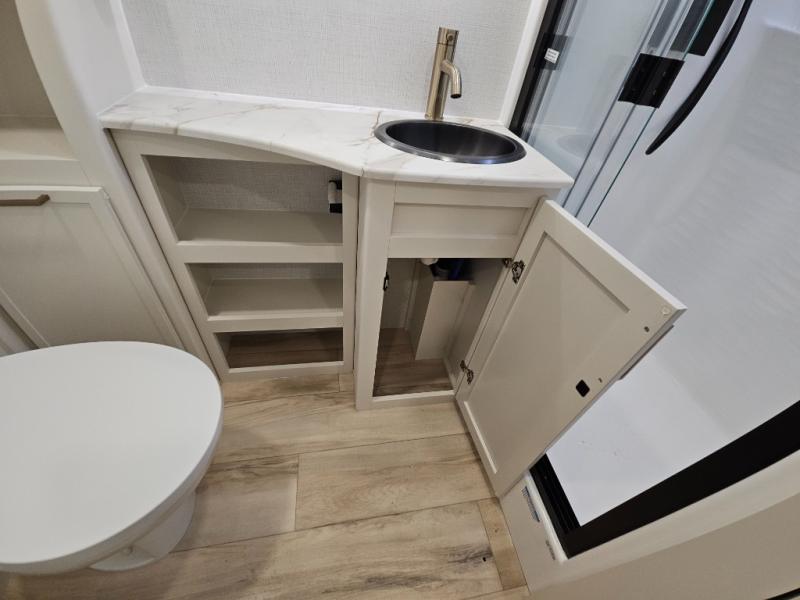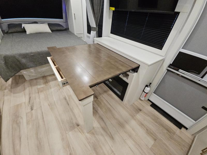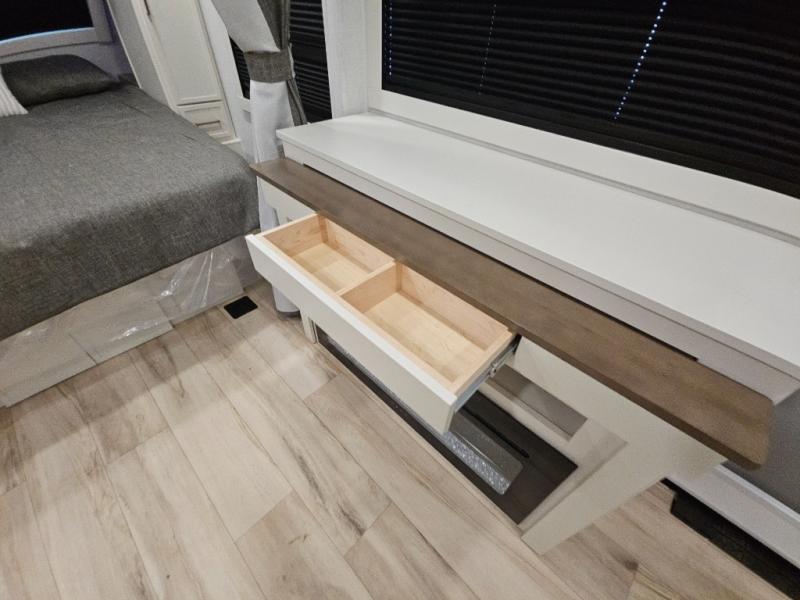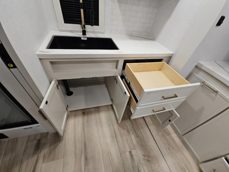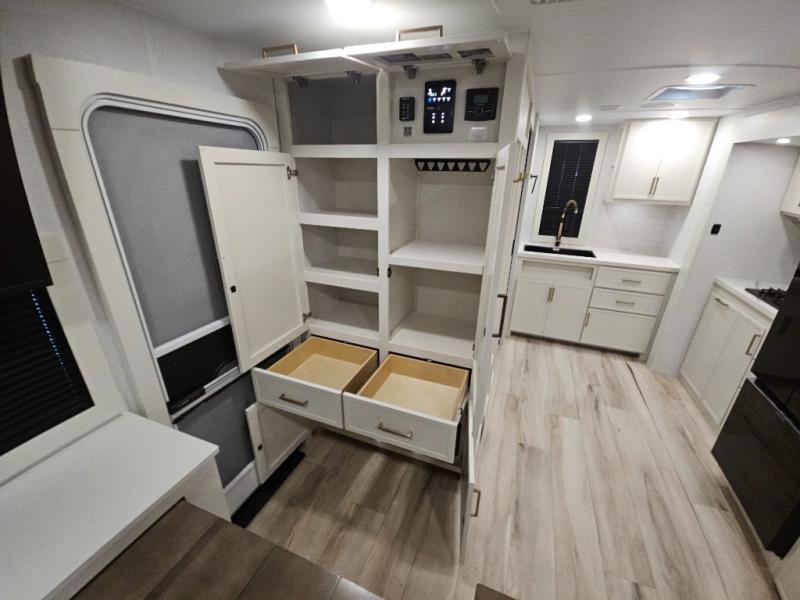 You'll love the amount of space you have in this travel trailer thanks to the large slide out in the main living area. There is comfy theater seating here, along with the kitchen appliances plus a pantry with drawers and an outlet. And a tri-fold sofa option can be chosen in place of theater seating if you're needing sleeping space for guests. You can dine at the pull-out dining table with a drawer, which is right in front of the pull-down interior/exterior screen. A full bath with a 36" x 30" shower will let you freshen up each day, and the king bed in the front bedroom includes a room divider in front for added privacy!