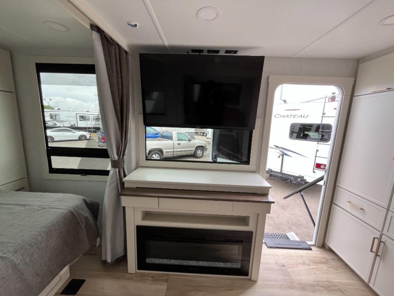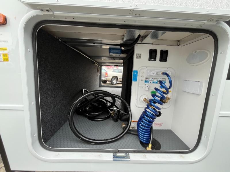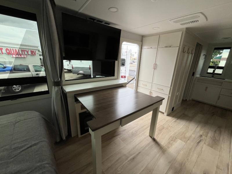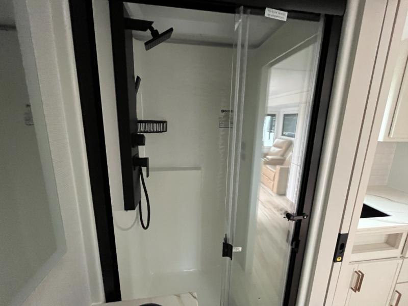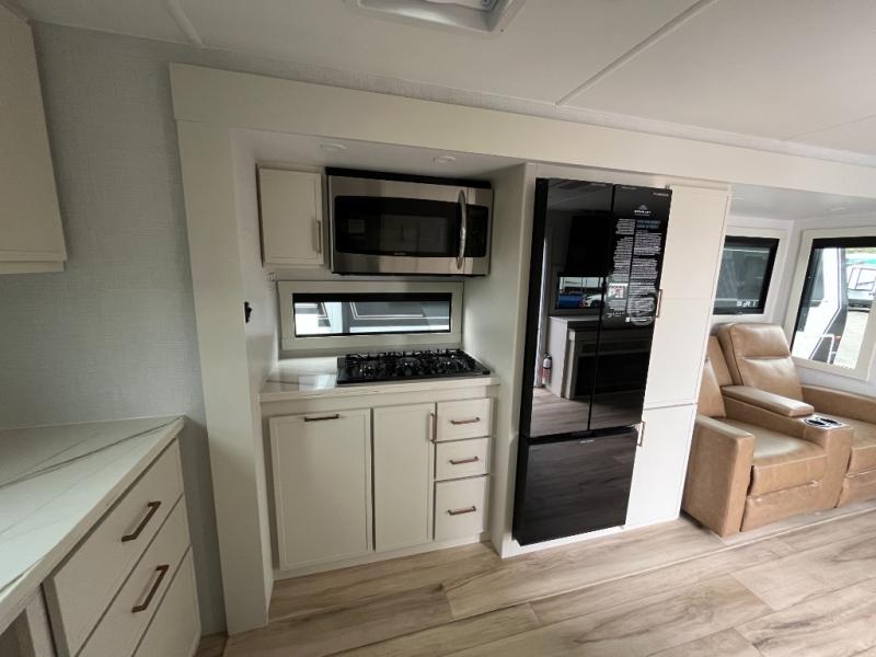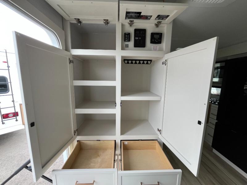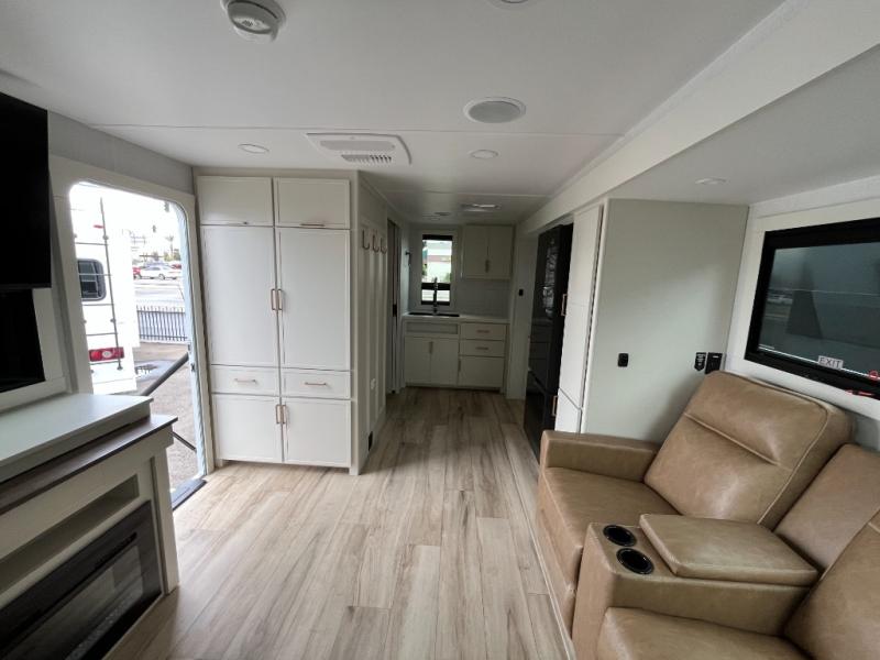You'll love the amount of space you have in this travel trailer thanks to the large slide out in the main living area. There is comfy theater seating here, along with the kitchen appliances plus a pantry with drawers and an outlet. And a tri-fold sofa option can be chosen in place of theater seating if you're needing sleeping space for guests. You can dine at the pull-out dining table with a drawer, which is right in front of the pull-down interior/exterior screen. A full bath with a 36" x 30" shower will let you freshen up each day, and the king bed in the front bedroom includes a room divider in front for added privacy!