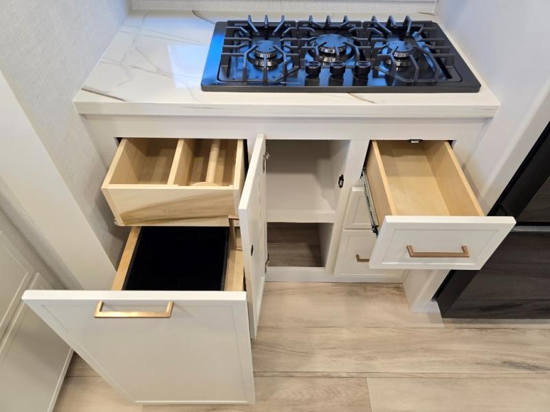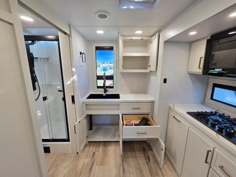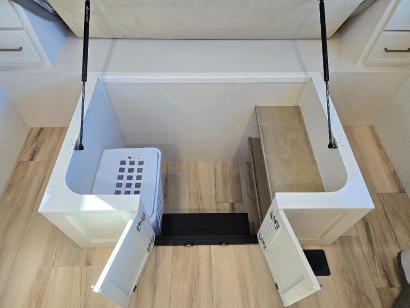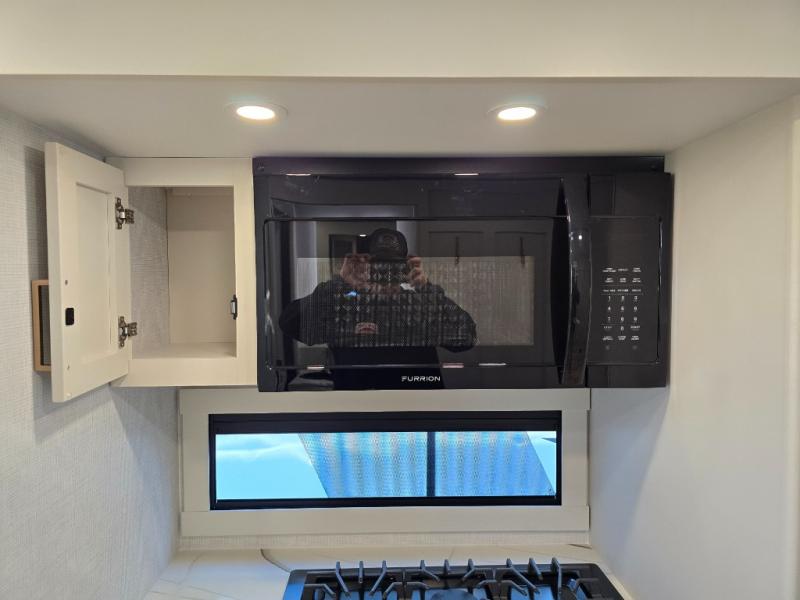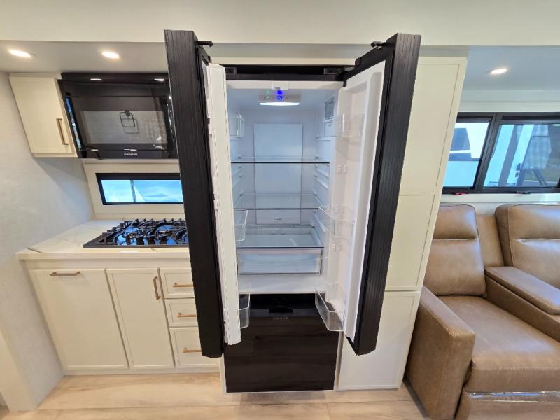 You'll love the amount of space you have in this travel trailer thanks to the large slide out in the main living area. There is comfy theater seating here, along with the kitchen appliances plus a pantry with drawers and an outlet. And a tri-fold sofa option can be chosen in place of theater seating if you're needing sleeping space for guests. You can dine at the pull-out dining table with a drawer, which is right in front of the pull-down interior/exterior screen. A full bath with a 36" x 30" shower will let you freshen up each day, and the king bed in the front bedroom includes a room divider in front for added privacy!