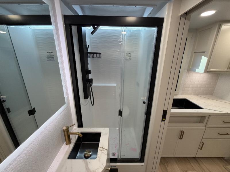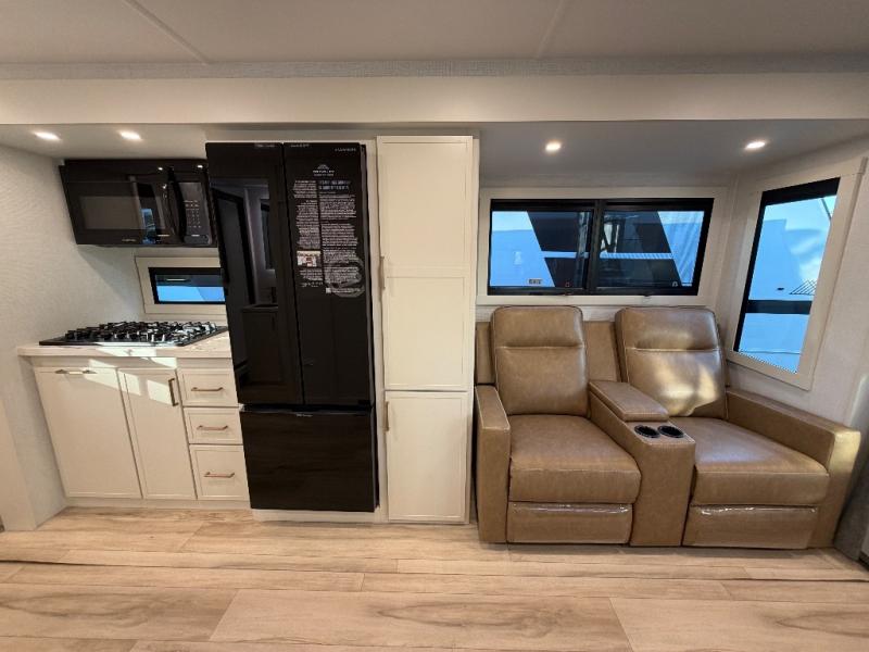 You'll love the amount of space you have in this travel trailer thanks to the large slide out in the main living area. There is comfy theater seating here, along with the kitchen appliances plus a pantry with drawers and an outlet. And a tri-fold sofa option can be chosen in place of theater seating if you're needing sleeping space for guests. You can dine at the pull-out dining table with a drawer, which is right in front of the pull-down interior/exterior screen. A full bath with a 36" x 30" shower will let you freshen up each day, and the king bed in the front bedroom includes a room divider in front for added privacy!