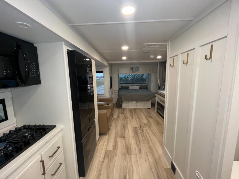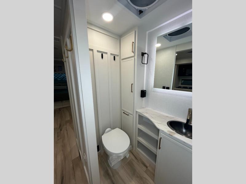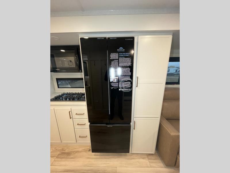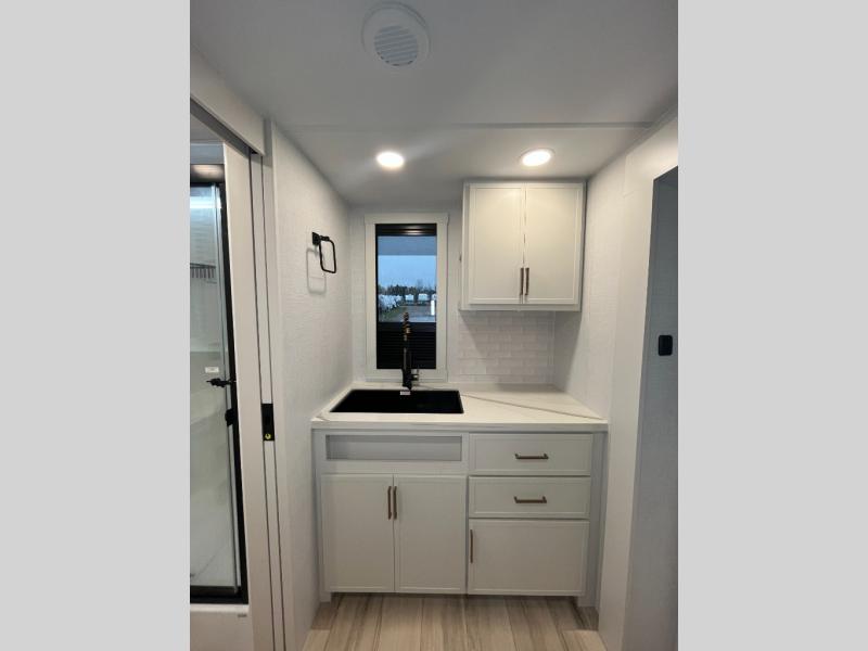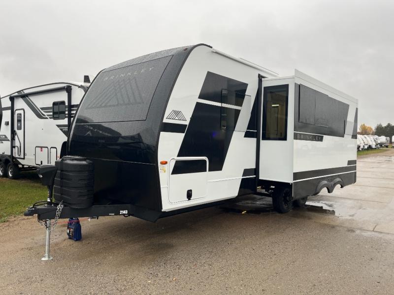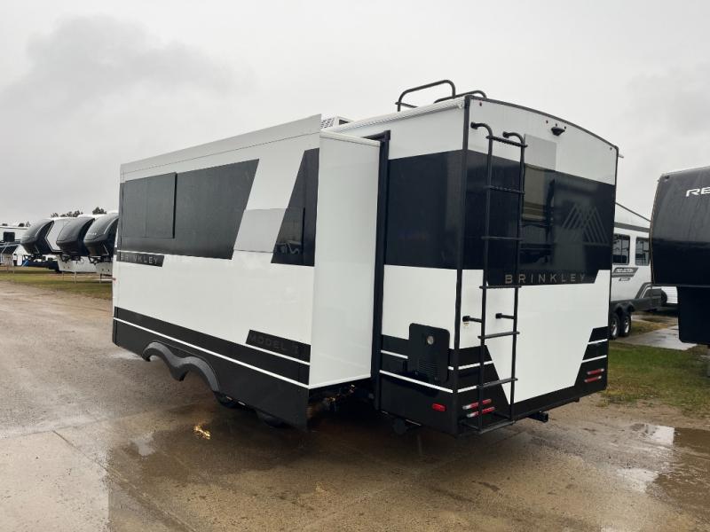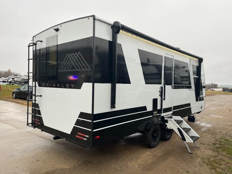 The lightweight Model I travel trailer by Brinkley is the perfect choice for those looking for an easy tow and at-home comforts! There is a drop-frame chassis, high-performance Road Armor suspension equalizer system, and Demco EZ Latch trailer coupler that automatically latches when dropped onto a hitch ball without the need of a safety pin. Additional exterior features include square Euro frameless windows, automotive-grade paint, full-width LED strip lighting in the pass-thru, and a pet & property security campside tie-down to keep your gear and furry friends safe. Inside, you'll be wowed by Brinkley's CraftSense wood trim construction, residential solid surface kitchen countertops, dimmable bedroom lights, and marine-grade neon LED shower lighting to name a few stand-out features!