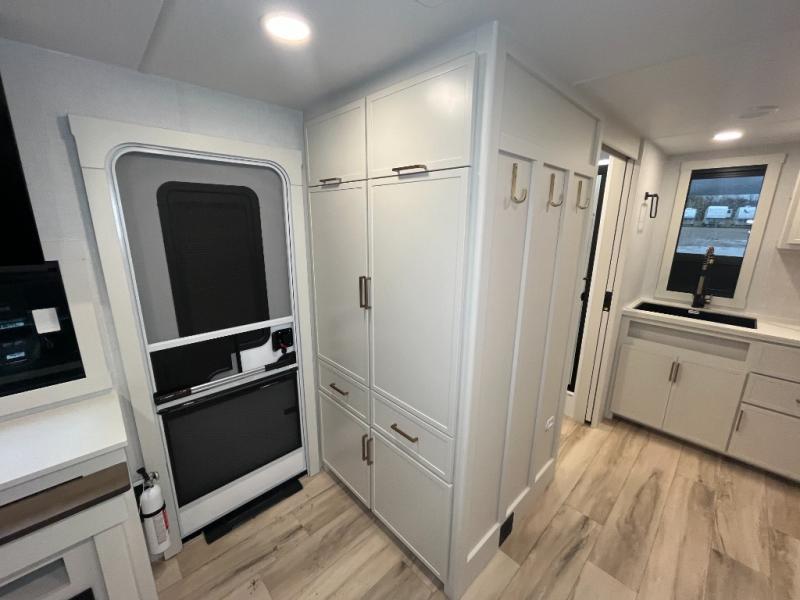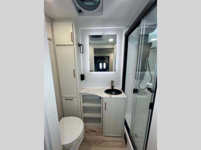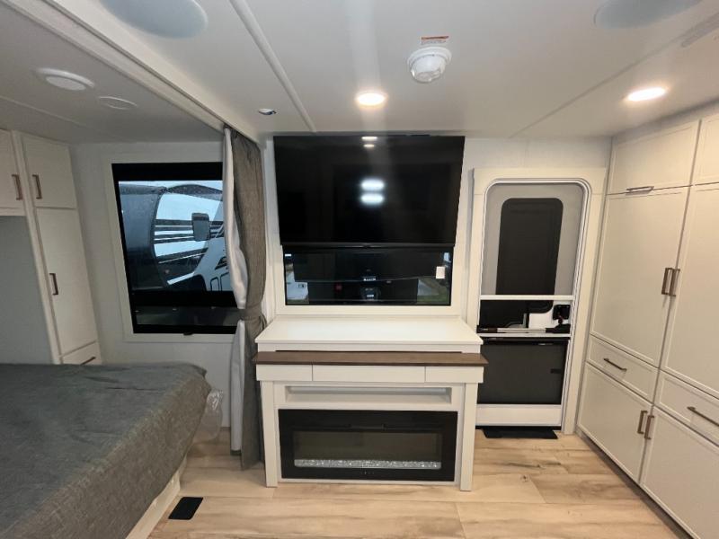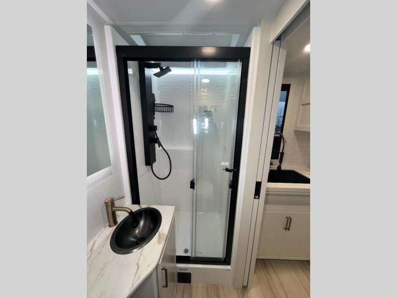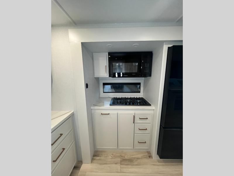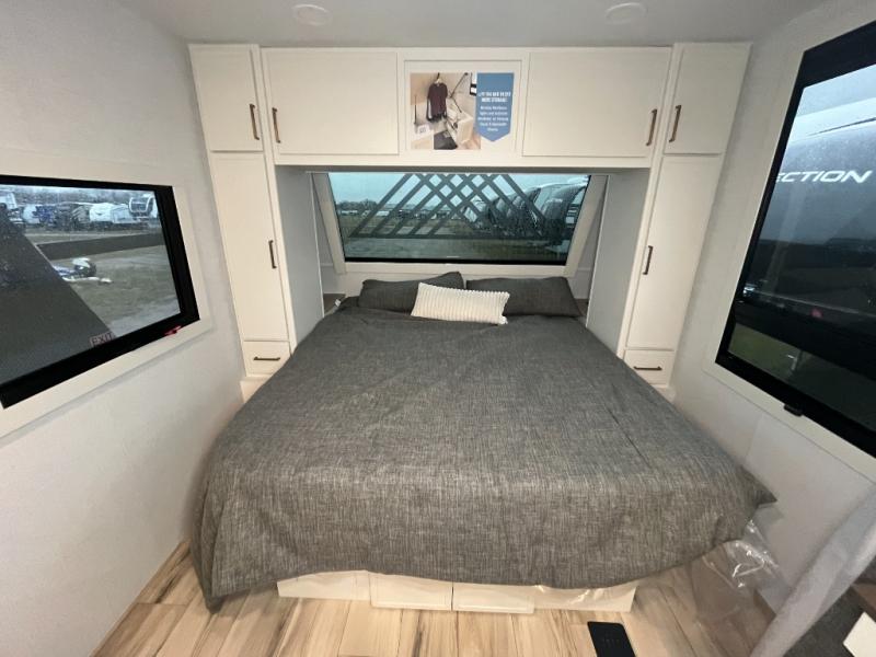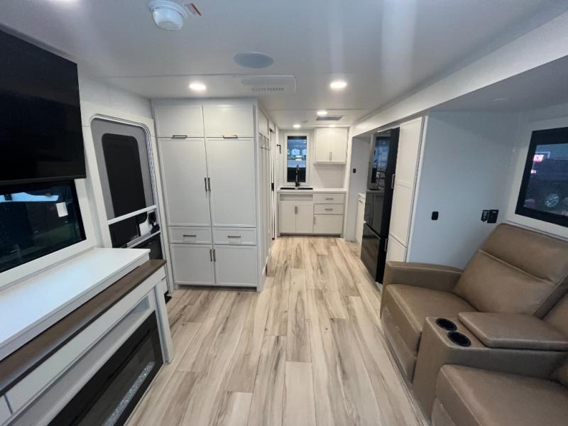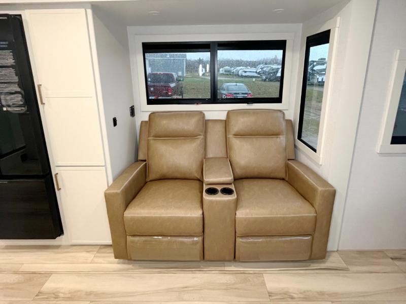 You'll love the amount of space you have in this travel trailer thanks to the large slide out in the main living area. There is comfy theater seating here, along with the kitchen appliances plus a pantry with drawers and an outlet. And a tri-fold sofa option can be chosen in place of theater seating if you're needing sleeping space for guests. You can dine at the pull-out dining table with a drawer, which is right in front of the pull-down interior/exterior screen. A full bath with a 36" x 30" shower will let you freshen up each day, and the king bed in the front bedroom includes a room divider in front for added privacy!