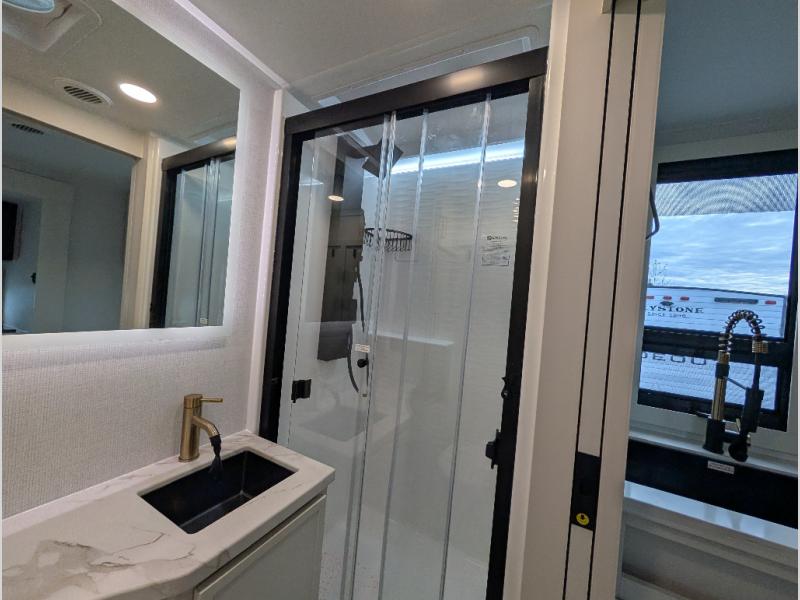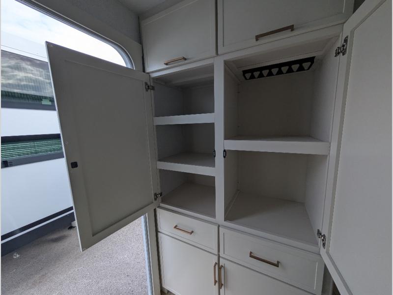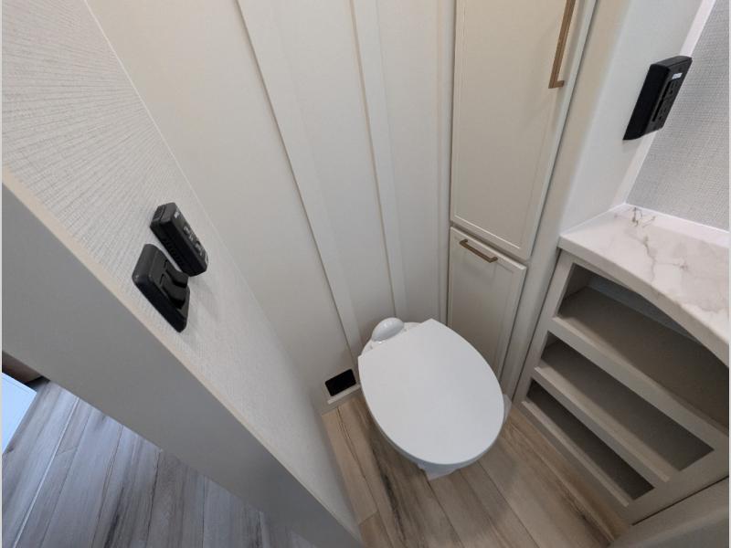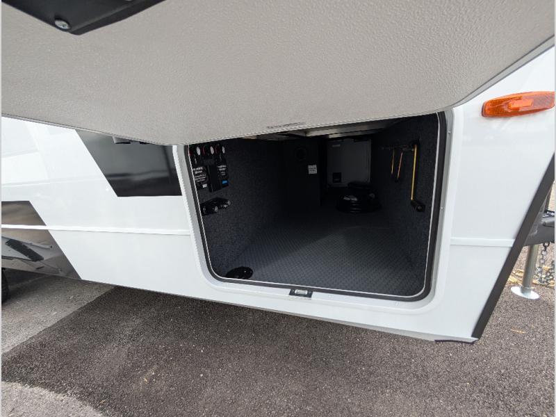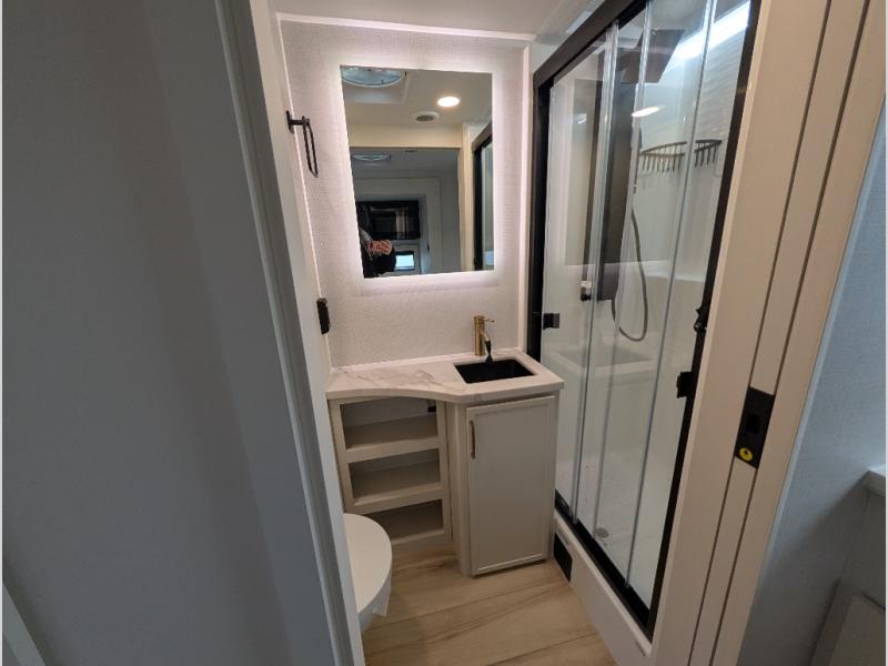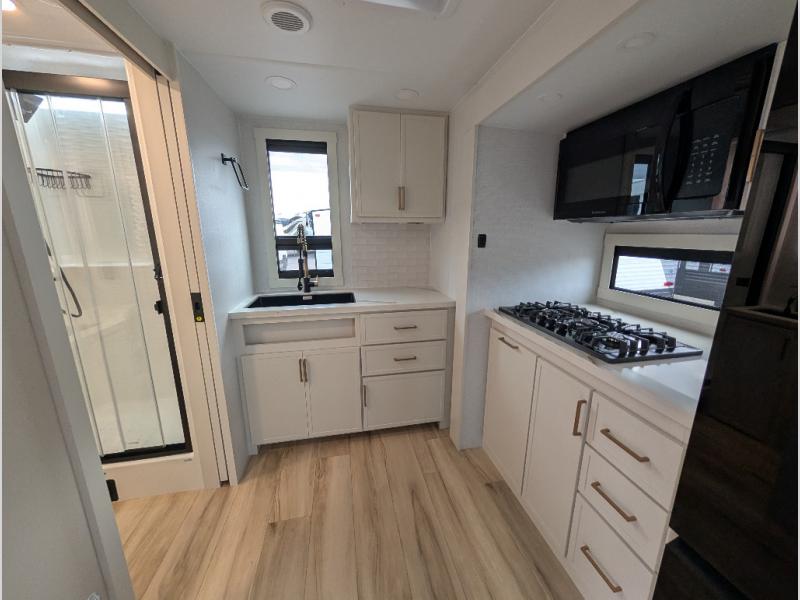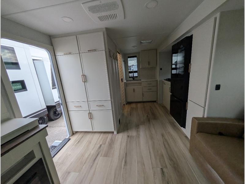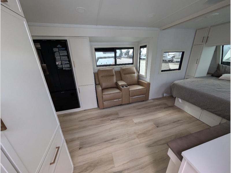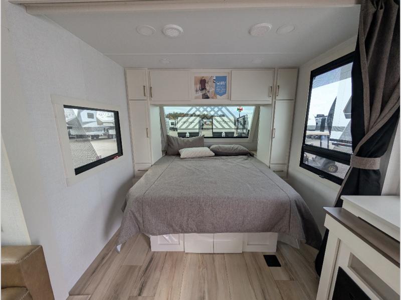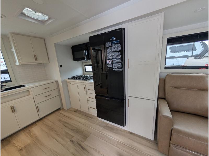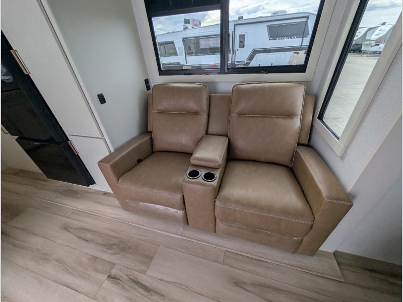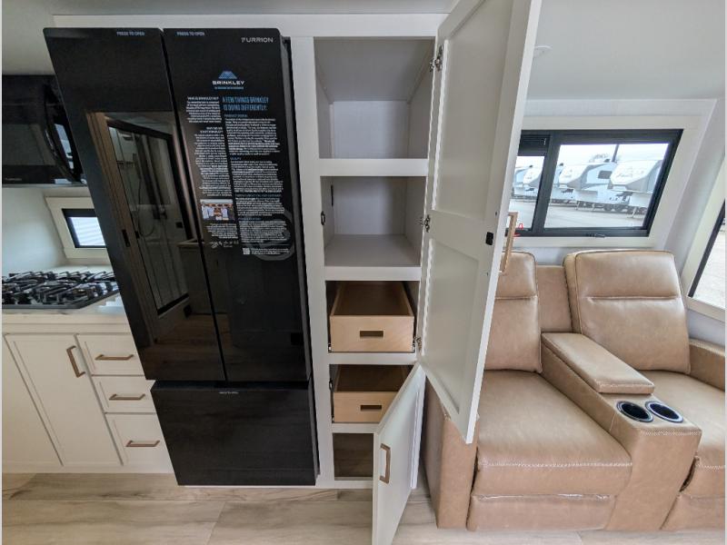 You'll love the amount of space you have in this travel trailer thanks to the large slide out in the main living area. There is comfy theater seating here, along with the kitchen appliances plus a pantry with drawers and an outlet. And a tri-fold sofa option can be chosen in place of theater seating if you're needing sleeping space for guests. You can dine at the pull-out dining table with a drawer, which is right in front of the pull-down interior/exterior screen. A full bath with a 36" x 30" shower will let you freshen up each day, and the king bed in the front bedroom includes a room divider in front for added privacy!