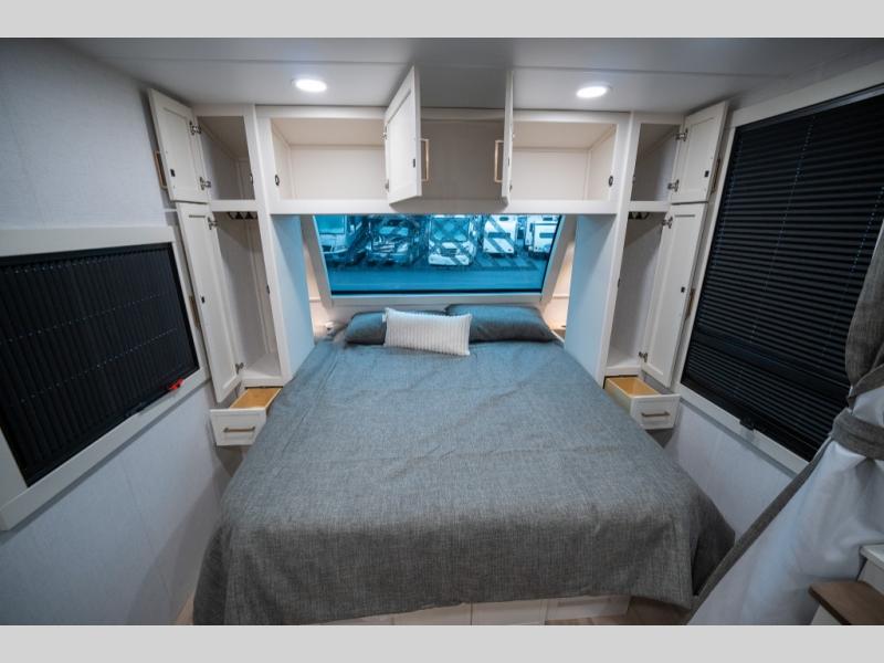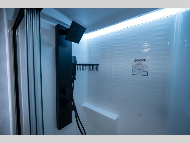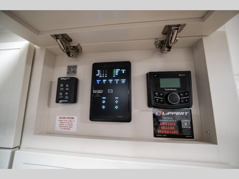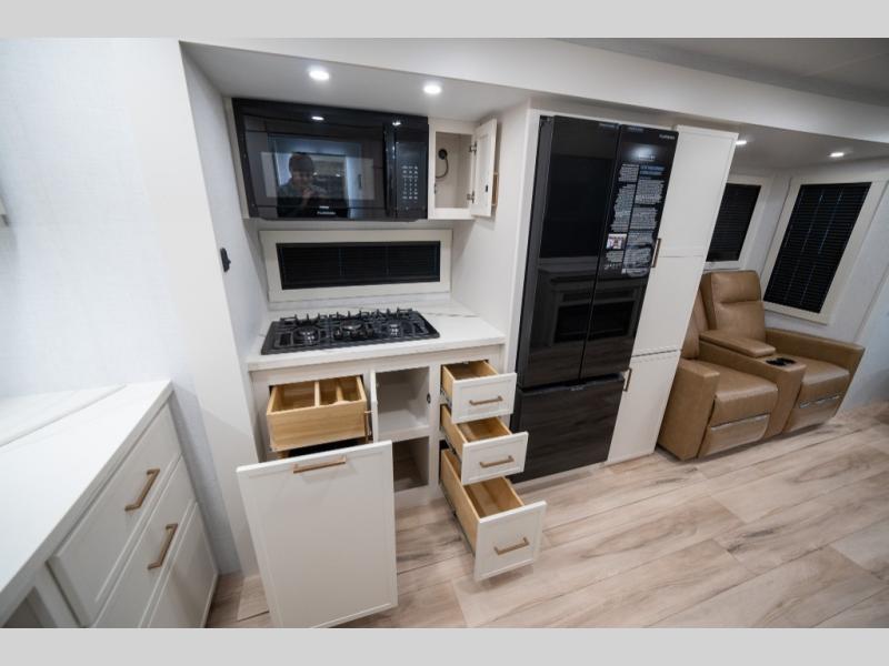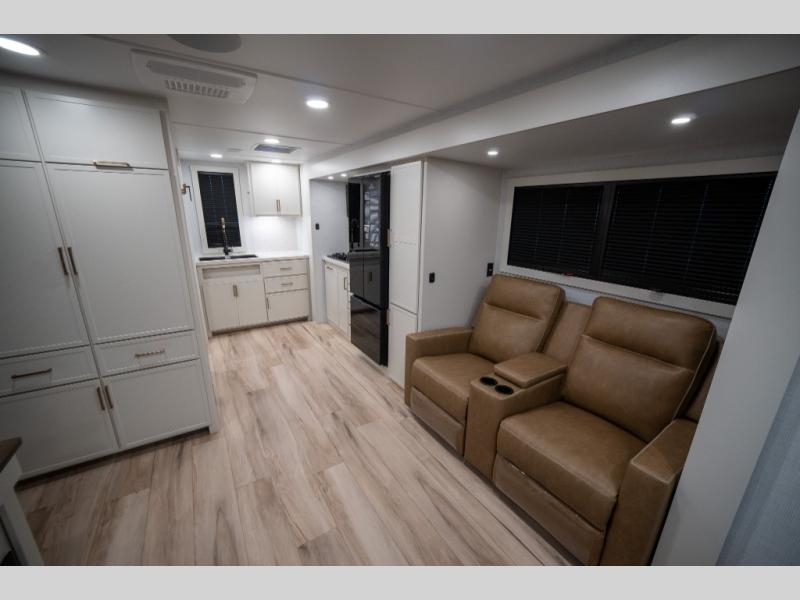 You'll love the amount of space you have in this travel trailer thanks to the large slide out in the main living area. There is comfy theater seating here, along with the kitchen appliances plus a pantry with drawers and an outlet. And a tri-fold sofa option can be chosen in place of theater seating if you're needing sleeping space for guests. You can dine at the pull-out dining table with a drawer, which is right in front of the pull-down interior/exterior screen. A full bath with a 36" x 30" shower will let you freshen up each day, and the king bed in the front bedroom includes a room divider in front for added privacy!