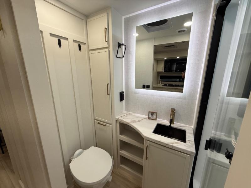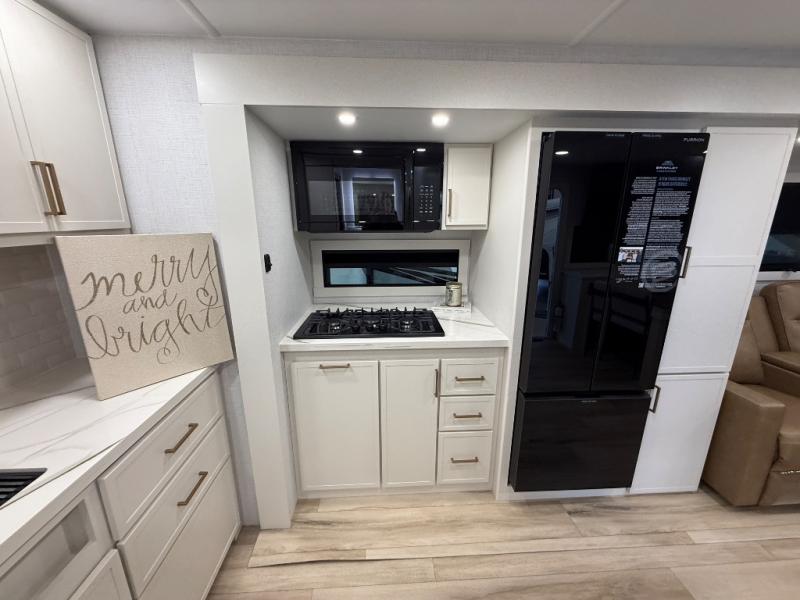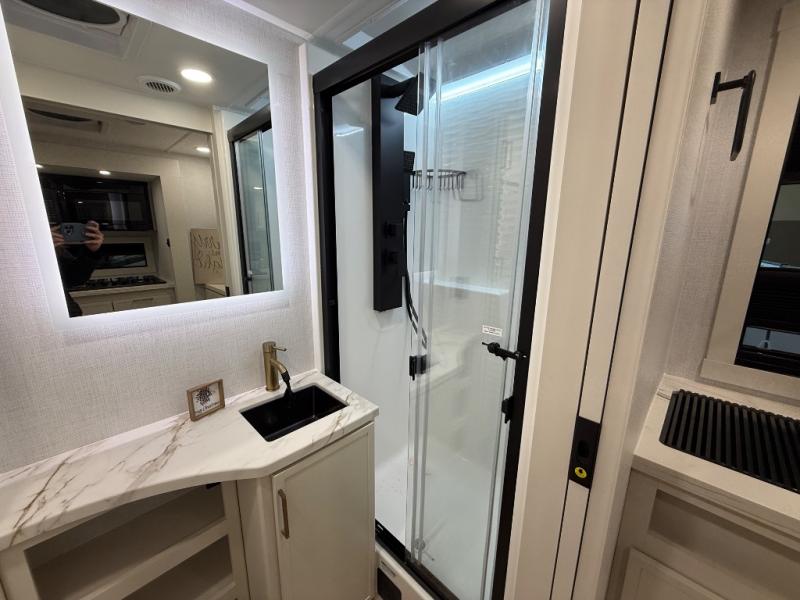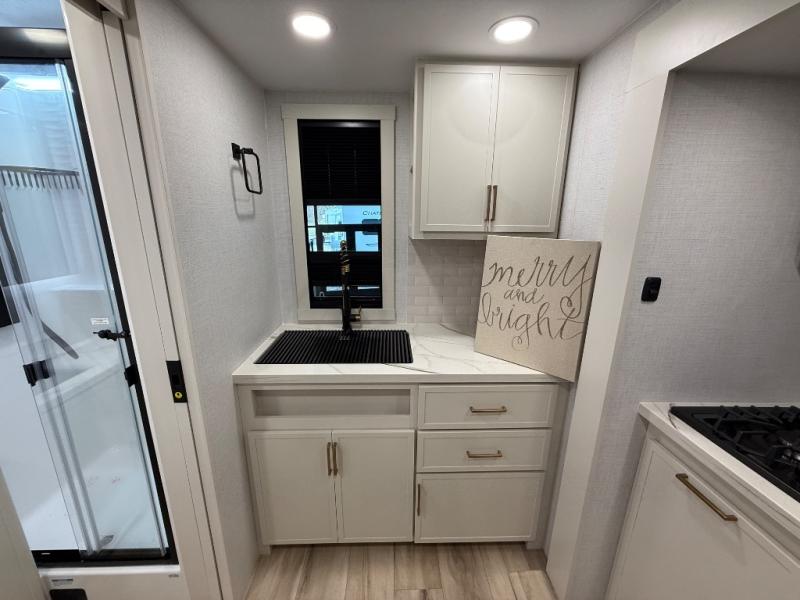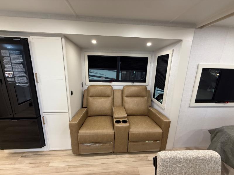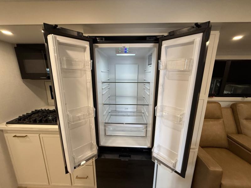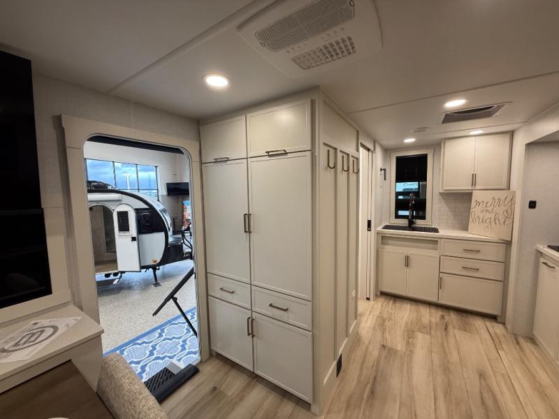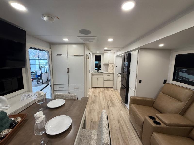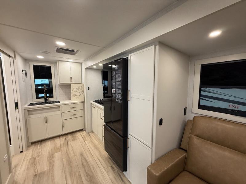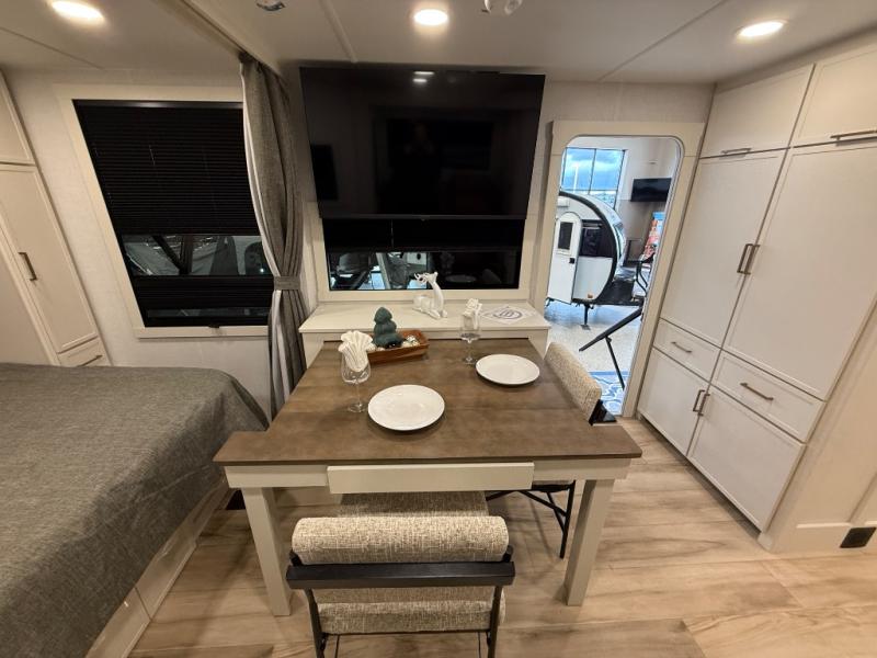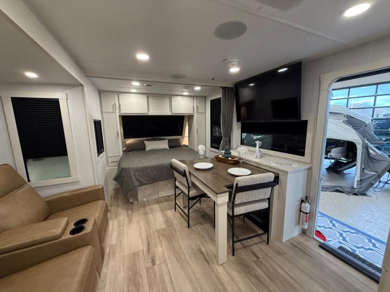 You'll love the amount of space you have in this travel trailer thanks to the large slide out in the main living area. There is comfy theater seating here, along with the kitchen appliances plus a pantry with drawers and an outlet. And a tri-fold sofa option can be chosen in place of theater seating if you're needing sleeping space for guests. You can dine at the pull-out dining table with a drawer, which is right in front of the pull-down interior/exterior screen. A full bath with a 36" x 30" shower will let you freshen up each day, and the king bed in the front bedroom includes a room divider in front for added privacy!