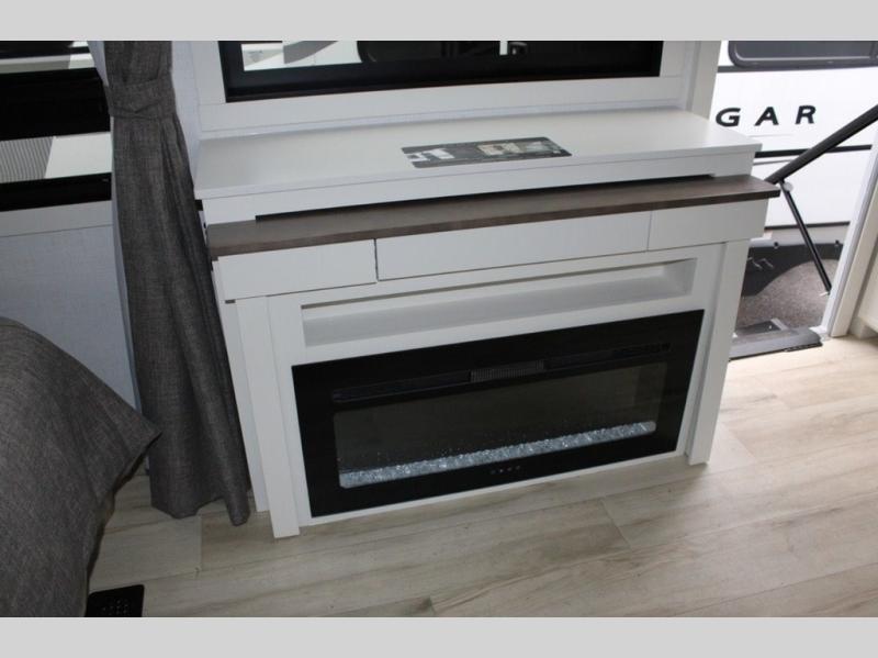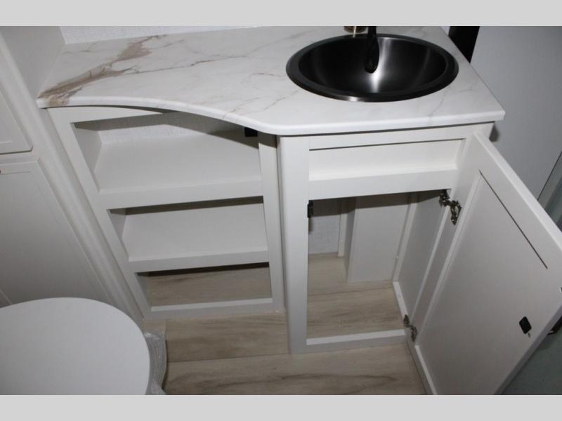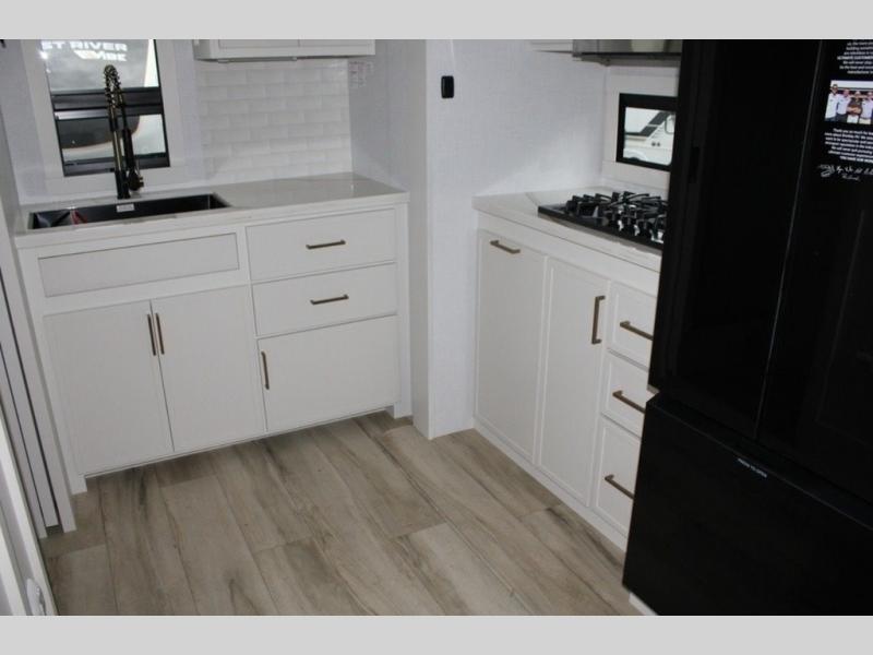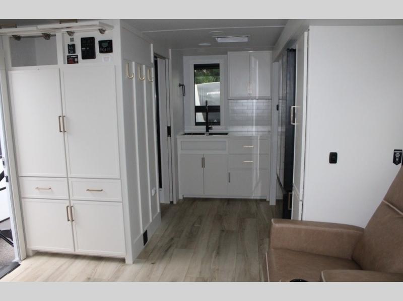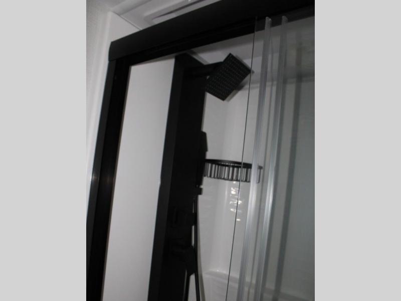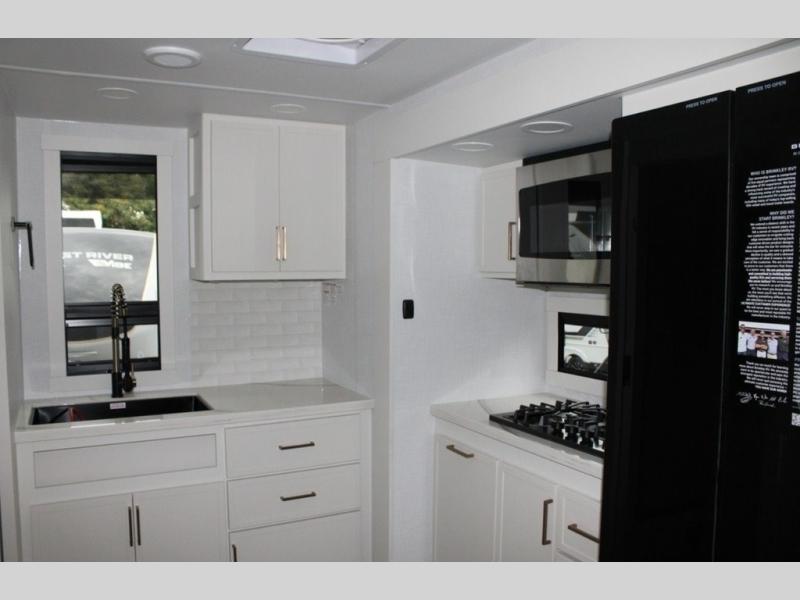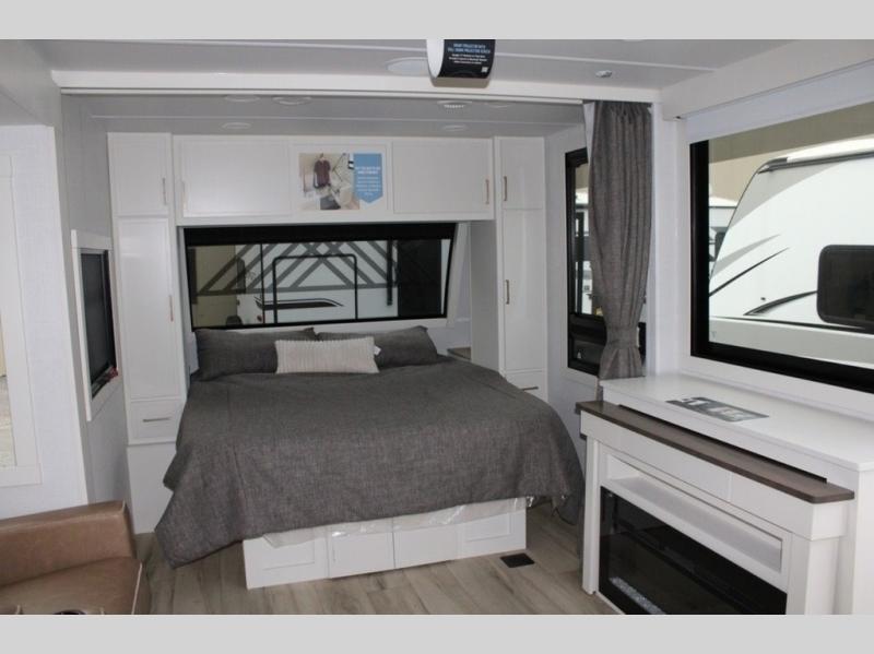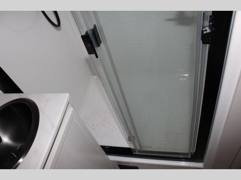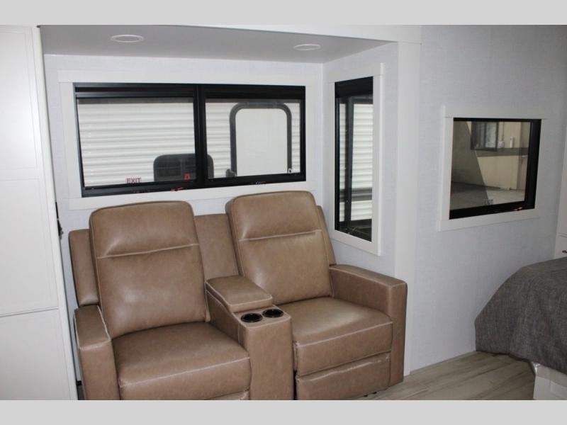 You'll love the amount of space you have in this travel trailer thanks to the large slide out in the main living area. There is comfy theater seating here, along with the kitchen appliances plus a pantry with drawers and an outlet. And a tri-fold sofa option can be chosen in place of theater seating if you're needing sleeping space for guests. You can dine at the pull-out dining table with a drawer, which is right in front of the pull-down interior/exterior screen. A full bath with a 36" x 30" shower will let you freshen up each day, and the king bed in the front bedroom includes a room divider in front for added privacy!