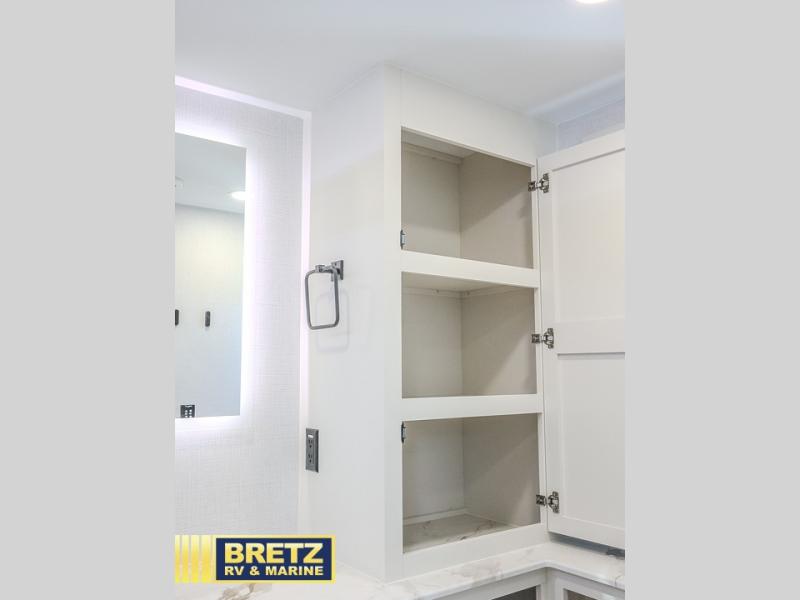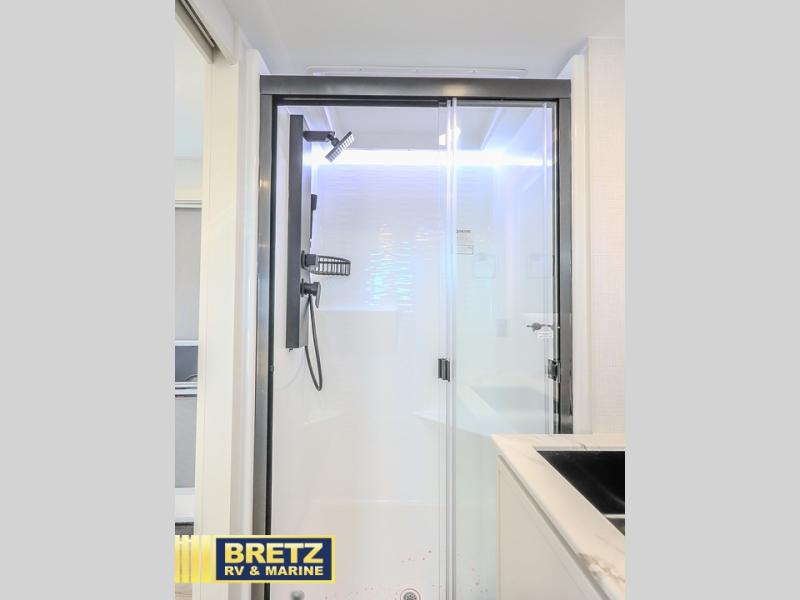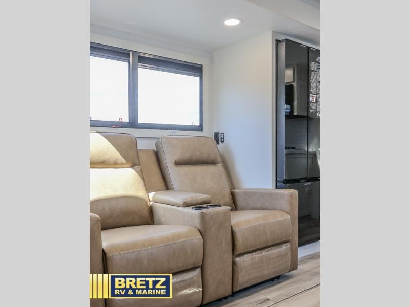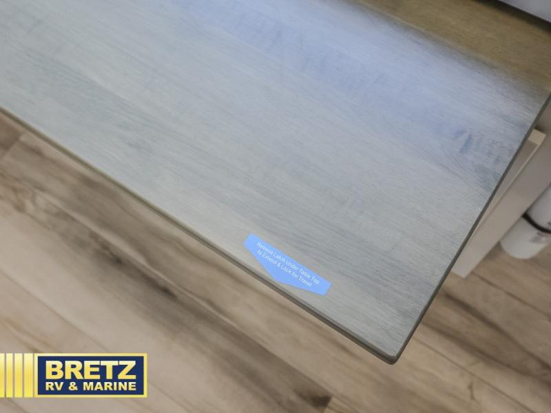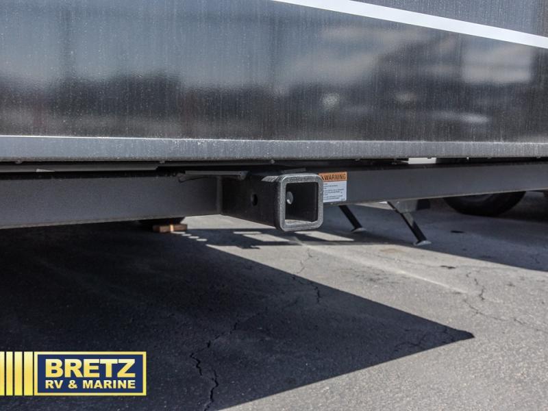 One look at this travel trailer and you'll be sold! The full rear bath features a spacious 42" x 30" shower with a built-in seat and Maxxair fan to name a few comforts. The front private bedroom features a 66" x 80" king bed with a MaxSpace Split-Level Wardrobe underneath to store shoes, clothes, and more! A slide out in the combined living area and kitchen makes your space more open, and you'll enjoy relaxing on the theater seating here in the evenings. The full kitchen includes a three burner stovetop, residential 30" convection microwave, 12 cu. ft. 12V refrigerator, plus a trash bin and Stow N' Go paper towel holder for added convenience. You can choose to eat outdoors under the 19' electric awning with LED lights or stay inside to dine at the pull-out dining table with a drawer for added storage! And if you're needing more sleeping space, just choose the optional tri-fold sofa in place of the theater seating!