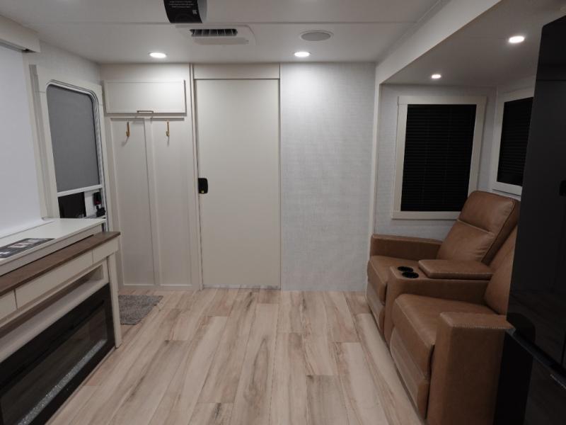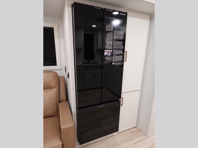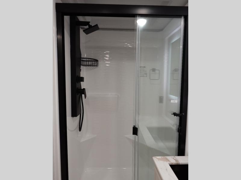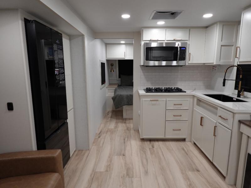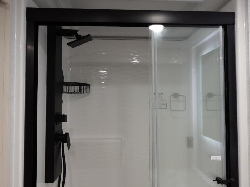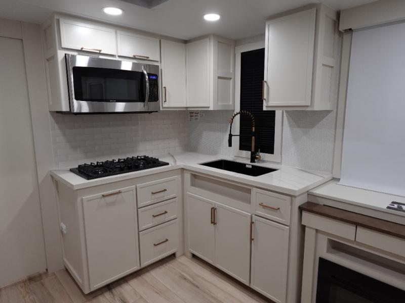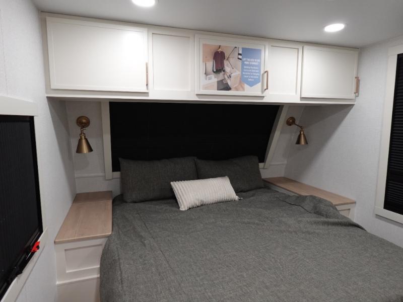 One look at this travel trailer and you'll be sold! The full rear bath features a spacious 42" x 30" shower with a built-in seat and Maxxair fan to name a few comforts. The front private bedroom features a 66" x 80" king bed with a MaxSpace Split-Level Wardrobe underneath to store shoes, clothes, and more! A slide out in the combined living area and kitchen makes your space more open, and you'll enjoy relaxing on the theater seating here in the evenings. The full kitchen includes a three burner stovetop, residential 30" convection microwave, 12 cu. ft. 12V refrigerator, plus a trash bin and Stow N' Go paper towel holder for added convenience. You can choose to eat outdoors under the 19' electric awning with LED lights or stay inside to dine at the pull-out dining table with a drawer for added storage! And if you're needing more sleeping space, just choose the optional tri-fold sofa in place of the theater seating!