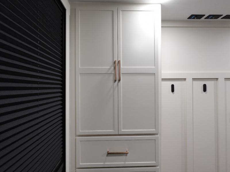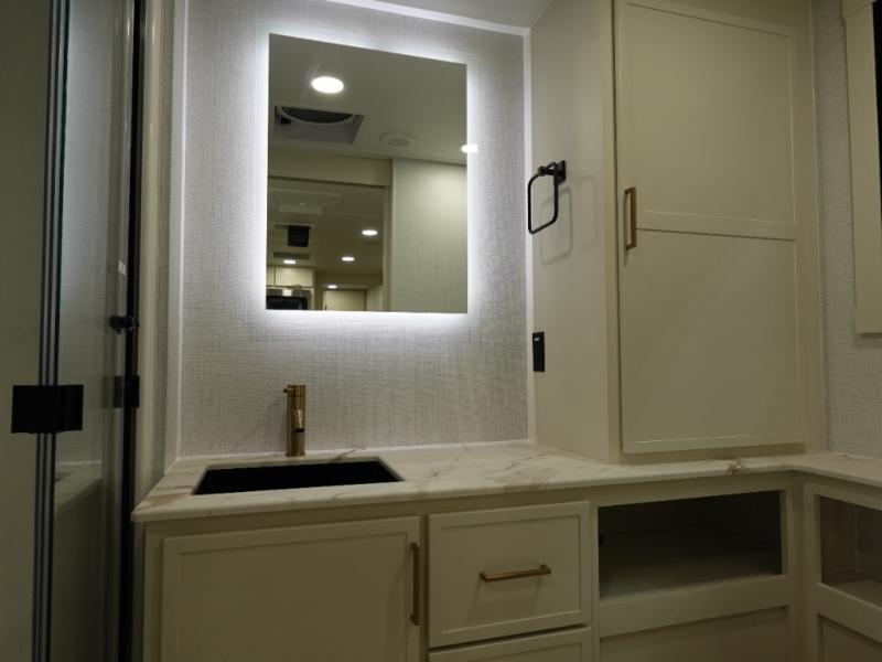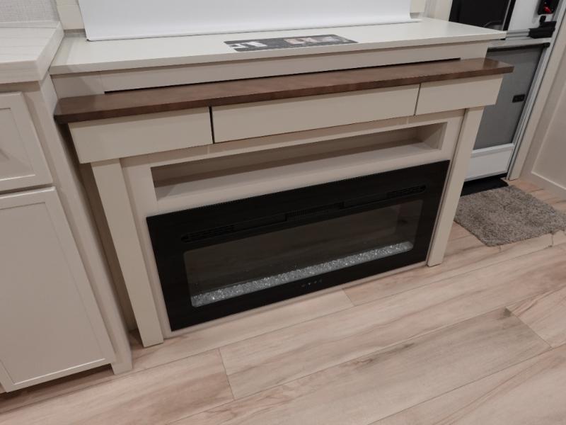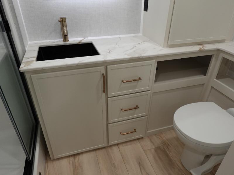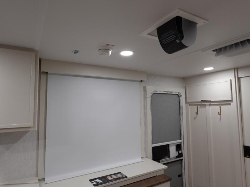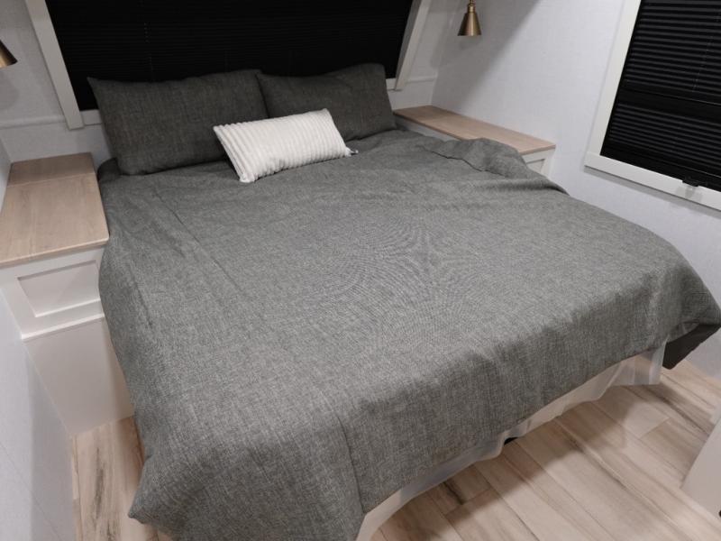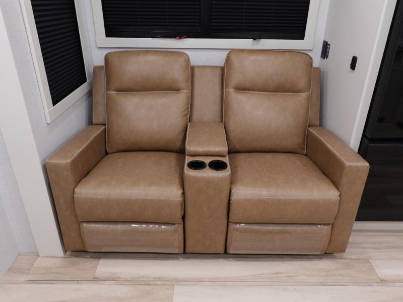 One look at this travel trailer and you'll be sold! The full rear bath features a spacious 42" x 30" shower with a built-in seat and Maxxair fan to name a few comforts. The front private bedroom features a 66" x 80" king bed with a MaxSpace Split-Level Wardrobe underneath to store shoes, clothes, and more! A slide out in the combined living area and kitchen makes your space more open, and you'll enjoy relaxing on the theater seating here in the evenings. The full kitchen includes a three burner stovetop, residential 30" convection microwave, 12 cu. ft. 12V refrigerator, plus a trash bin and Stow N' Go paper towel holder for added convenience. You can choose to eat outdoors under the 19' electric awning with LED lights or stay inside to dine at the pull-out dining table with a drawer for added storage! And if you're needing more sleeping space, just choose the optional tri-fold sofa in place of the theater seating!