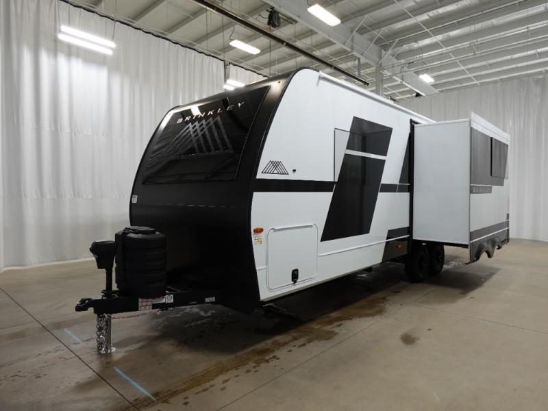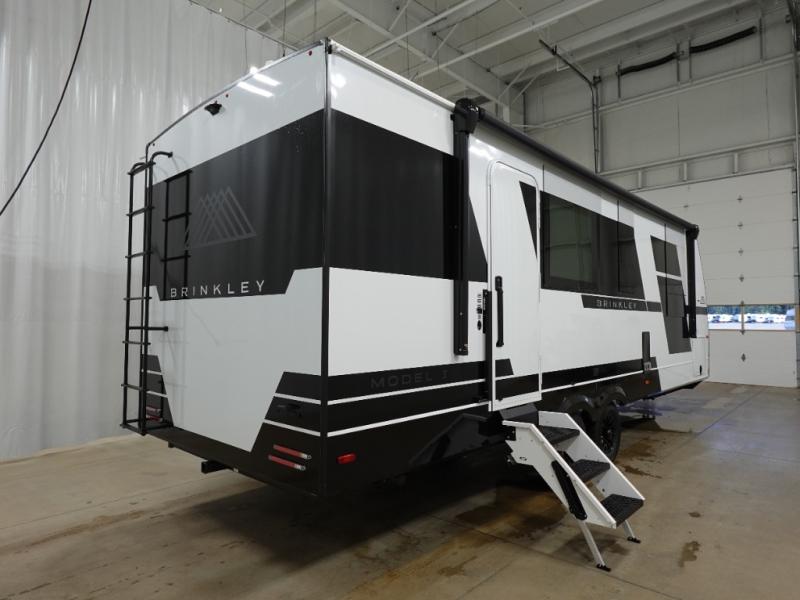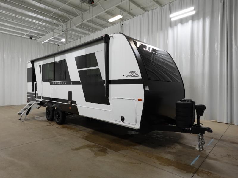 The lightweight Model I travel trailer by Brinkley is the perfect choice for those looking for an easy tow and at-home comforts! There is a drop-frame chassis, high-performance Road Armor suspension equalizer system, and Demco EZ Latch trailer coupler that automatically latches when dropped onto a hitch ball without the need of a safety pin. Additional exterior features include square Euro frameless windows, automotive-grade paint, full-width LED strip lighting in the pass-thru, and a pet & property security campside tie-down to keep your gear and furry friends safe. Inside, you'll be wowed by Brinkley's CraftSense wood trim construction, residential solid surface kitchen countertops, dimmable bedroom lights, and marine-grade neon LED shower lighting to name a few stand-out features!