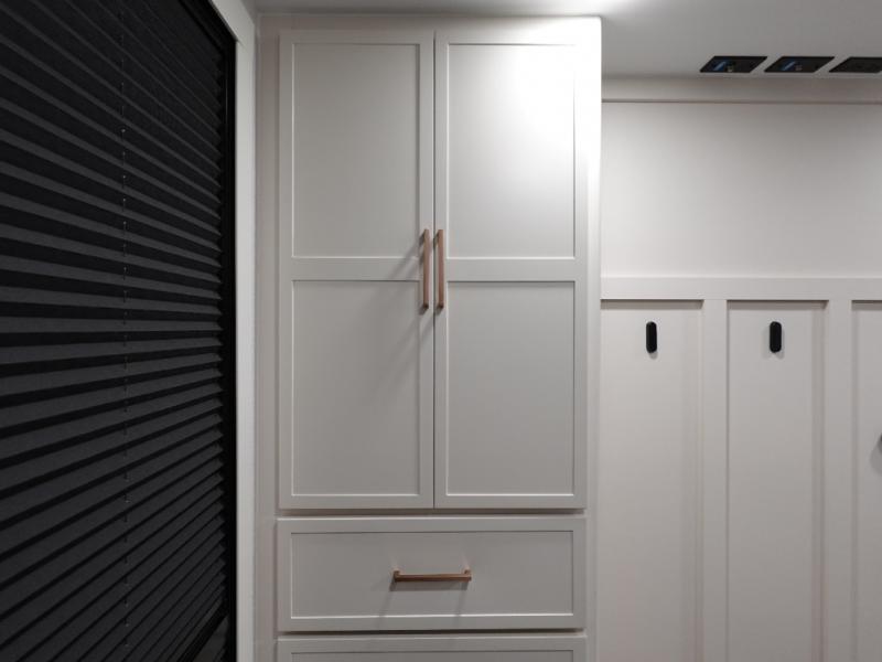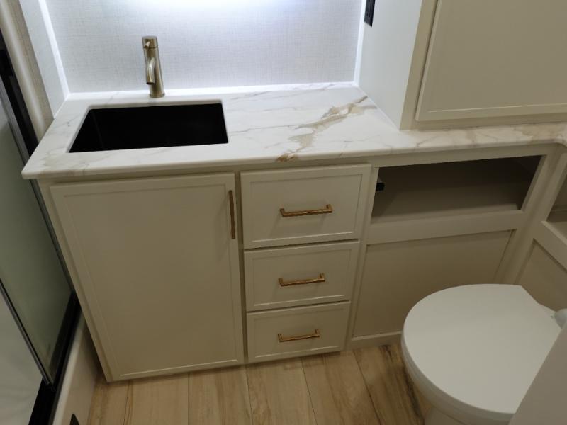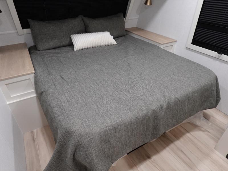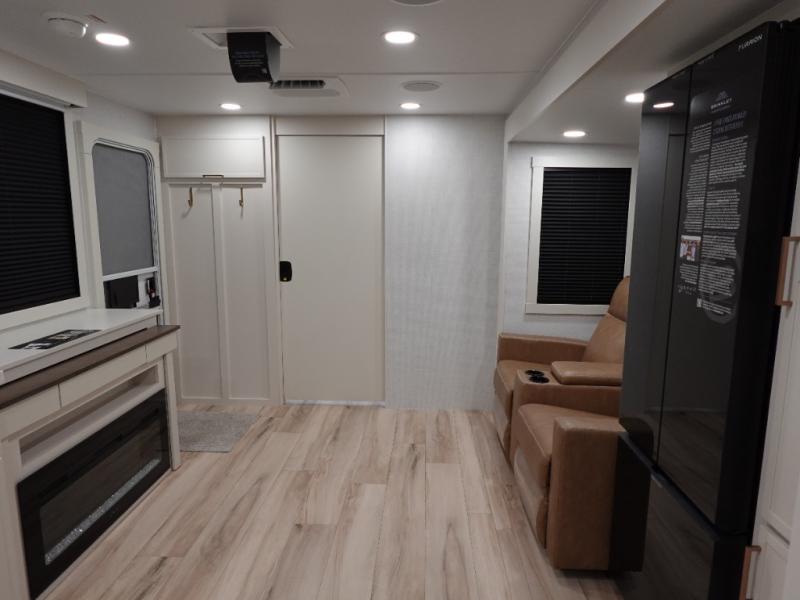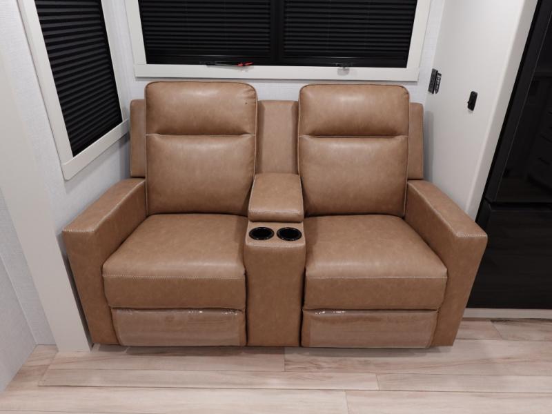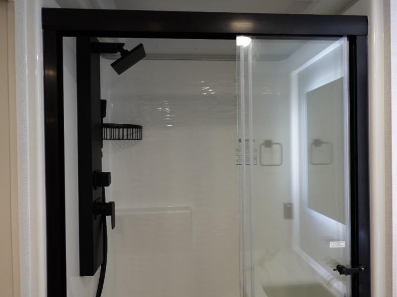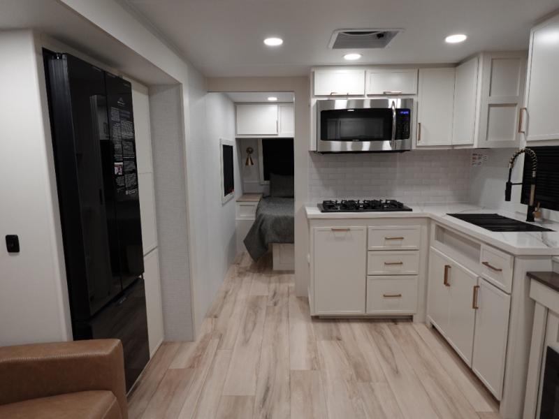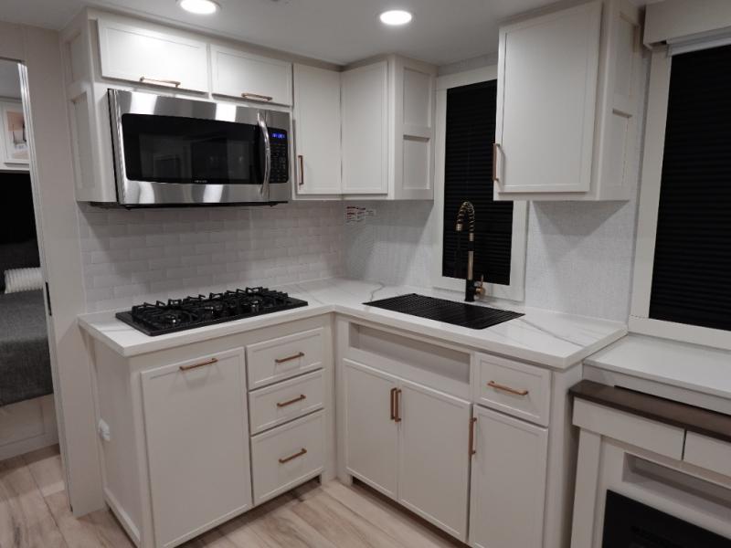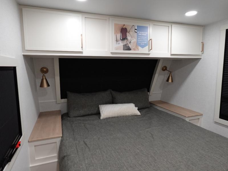 One look at this travel trailer and you'll be sold! The full rear bath features a spacious 42" x 30" shower with a built-in seat and Maxxair fan to name a few comforts. The front private bedroom features a 66" x 80" king bed with a MaxSpace Split-Level Wardrobe underneath to store shoes, clothes, and more! A slide out in the combined living area and kitchen makes your space more open, and you'll enjoy relaxing on the theater seating here in the evenings. The full kitchen includes a three burner stovetop, residential 30" convection microwave, 12 cu. ft. 12V refrigerator, plus a trash bin and Stow N' Go paper towel holder for added convenience. You can choose to eat outdoors under the 19' electric awning with LED lights or stay inside to dine at the pull-out dining table with a drawer for added storage!