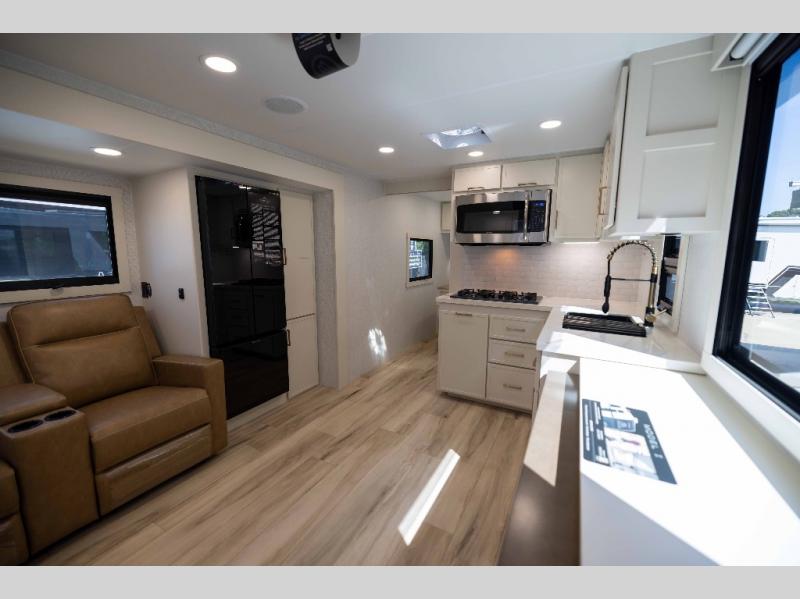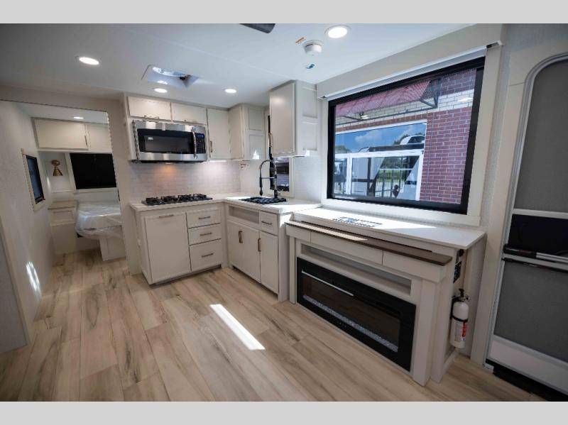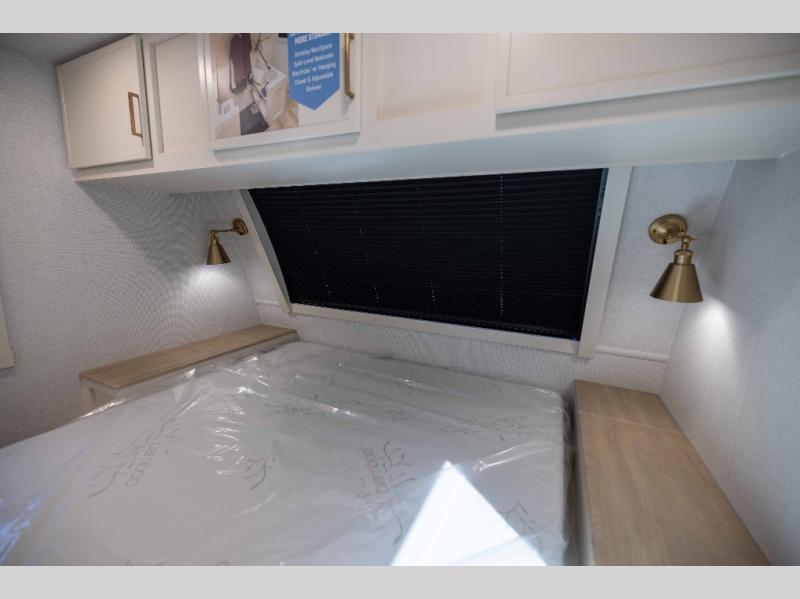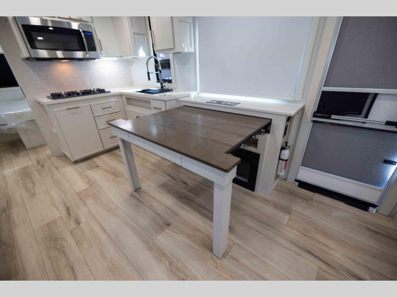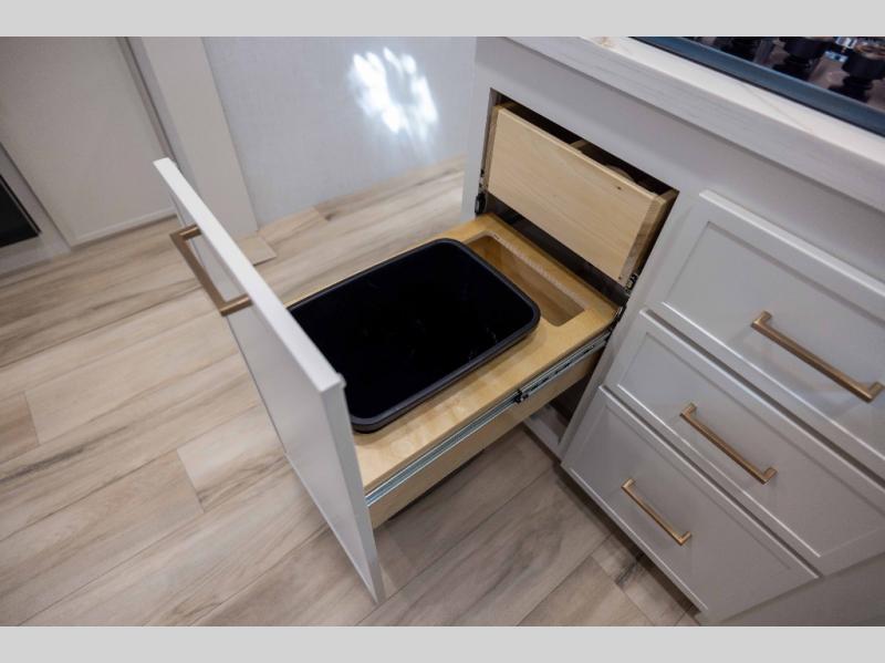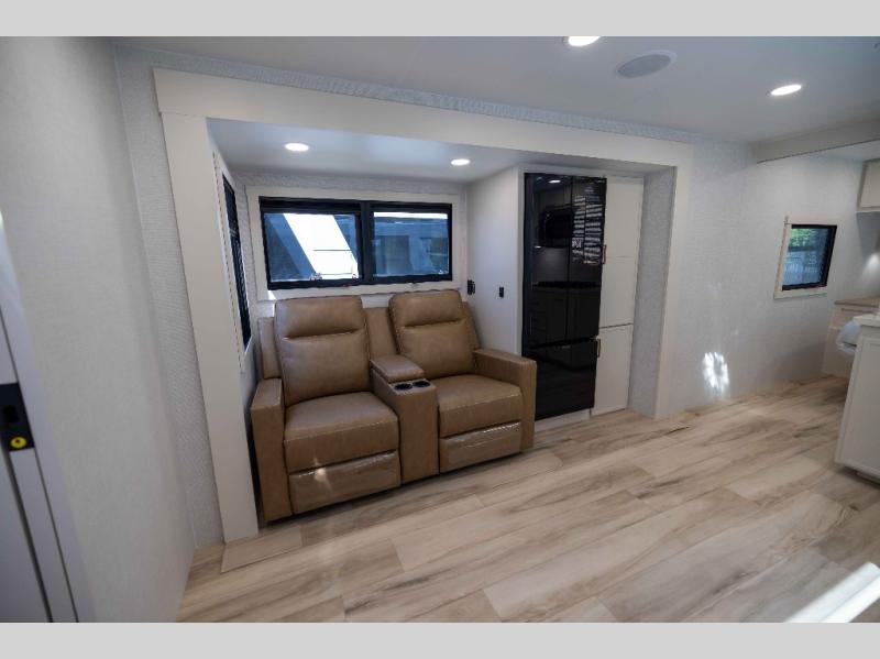 One look at this travel trailer and you'll be sold! The full rear bath features a spacious 42" x 30" shower with a built-in seat and Maxxair fan to name a few comforts. The front private bedroom features a 66" x 80" king bed with a MaxSpace Split-Level Wardrobe underneath to store shoes, clothes, and more! A slide out in the combined living area and kitchen makes your space more open, and you'll enjoy relaxing on the theater seating here in the evenings. The full kitchen includes a three burner stovetop, residential 30" convection microwave, 12 cu. ft. 12V refrigerator, plus a trash bin and Stow N' Go paper towel holder for added convenience. You can choose to eat outdoors under the 19' electric awning with LED lights or stay inside to dine at the pull-out dining table with a drawer for added storage! And if you're needing more sleeping space, just choose the optional tri-fold sofa in place of the theater seating!