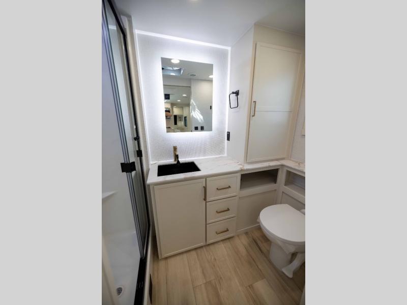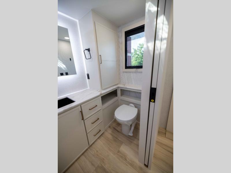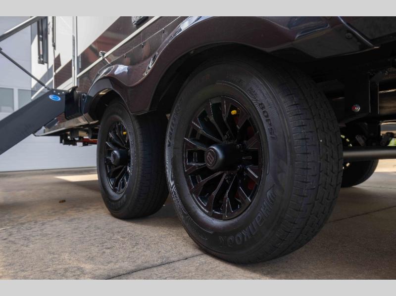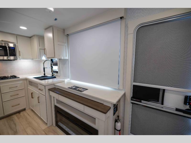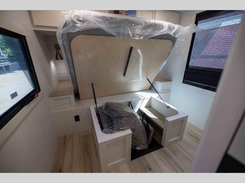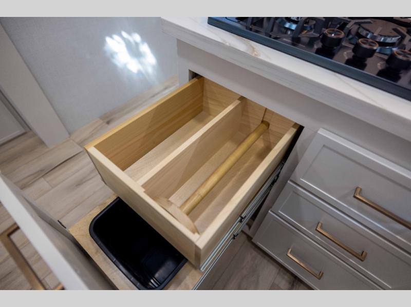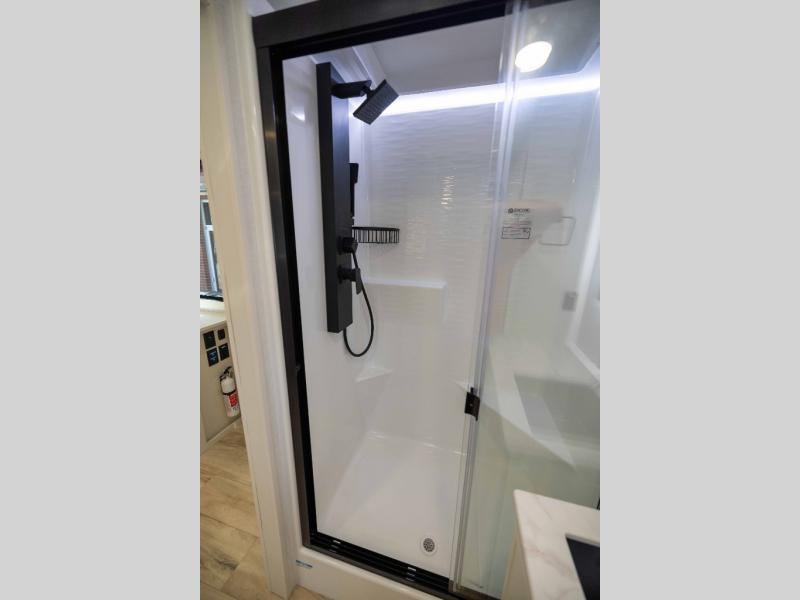 One look at this travel trailer and you'll be sold! The full rear bath features a spacious 42" x 30" shower with a built-in seat and Maxxair fan to name a few comforts. The front private bedroom features a 66" x 80" king bed with a MaxSpace Split-Level Wardrobe underneath to store shoes, clothes, and more! A slide out in the combined living area and kitchen makes your space more open, and you'll enjoy relaxing on the theater seating here in the evenings. The full kitchen includes a three burner stovetop, residential 30" convection microwave, 12 cu. ft. 12V refrigerator, plus a trash bin and Stow N' Go paper towel holder for added convenience. You can choose to eat outdoors under the 19' electric awning with LED lights or stay inside to dine at the pull-out dining table with a drawer for added storage! And if you're needing more sleeping space, just choose the optional tri-fold sofa in place of the theater seating!