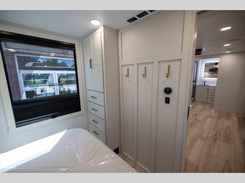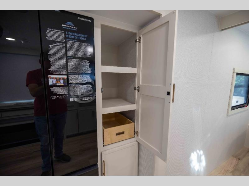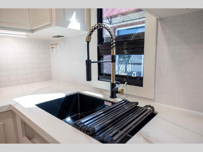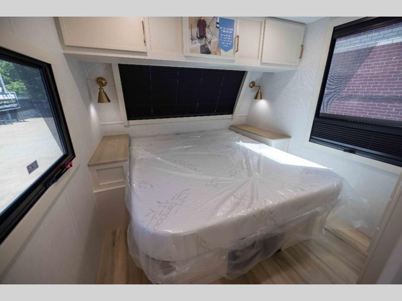 The lightweight Model I travel trailer by Brinkley is the perfect choice for those looking for an easy tow and at-home comforts! There is a drop-frame chassis, high-performance Road Armor suspension equalizer system, and Demco EZ Latch trailer coupler that automatically latches when dropped onto a hitch ball without the need of a safety pin. Additional exterior features include square Euro frameless windows, automotive-grade paint, full-width LED strip lighting in the pass-thru, and a pet & property security campside tie-down to keep your gear and furry friends safe. Inside, you'll be wowed by Brinkley's CraftSense wood trim construction, residential solid surface kitchen countertops, dimmable bedroom lights, and marine-grade neon LED shower lighting to name a few stand-out features!