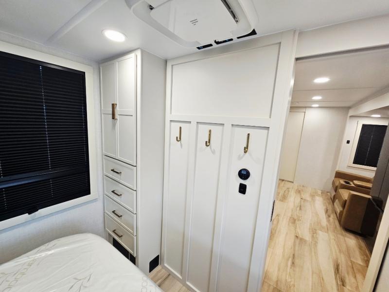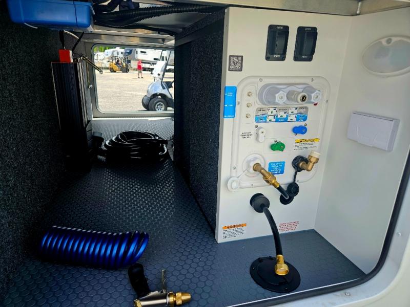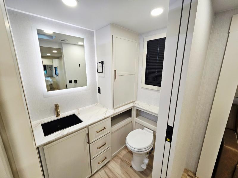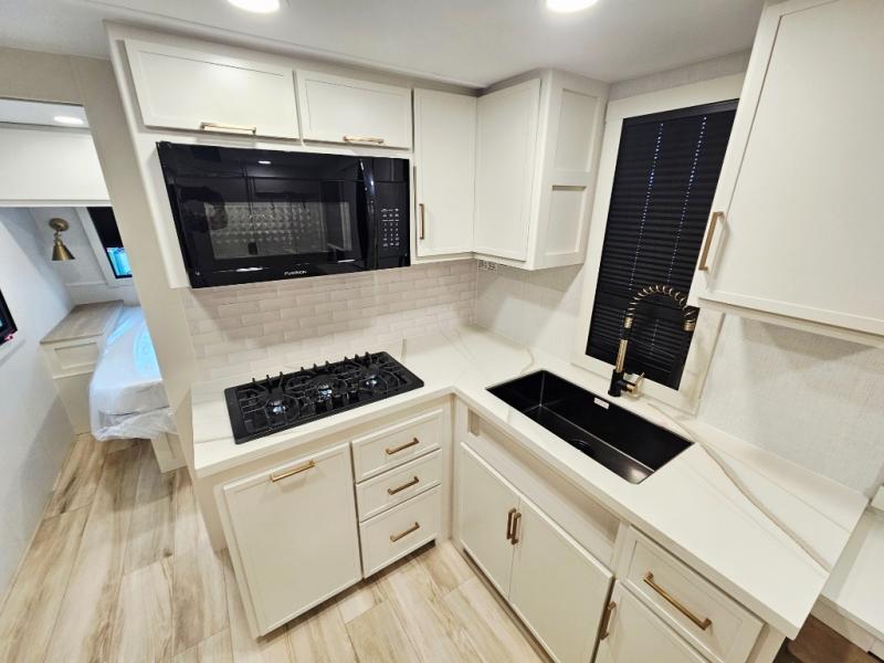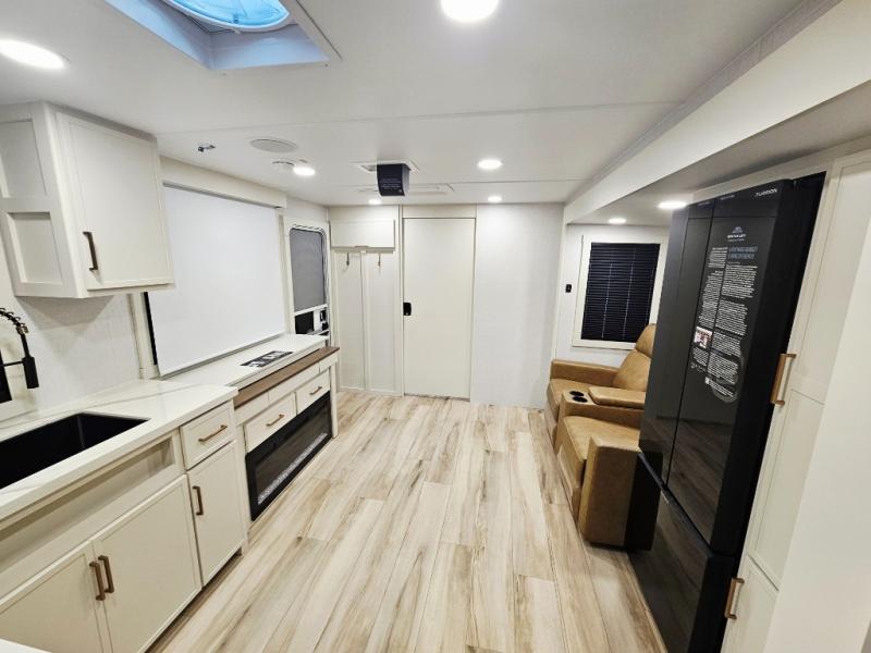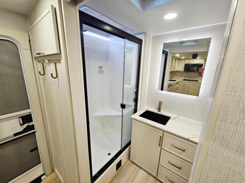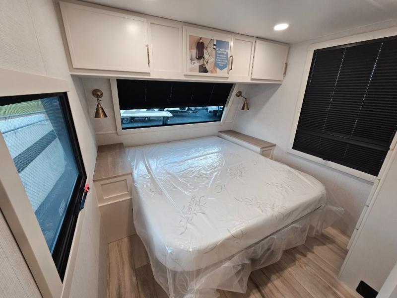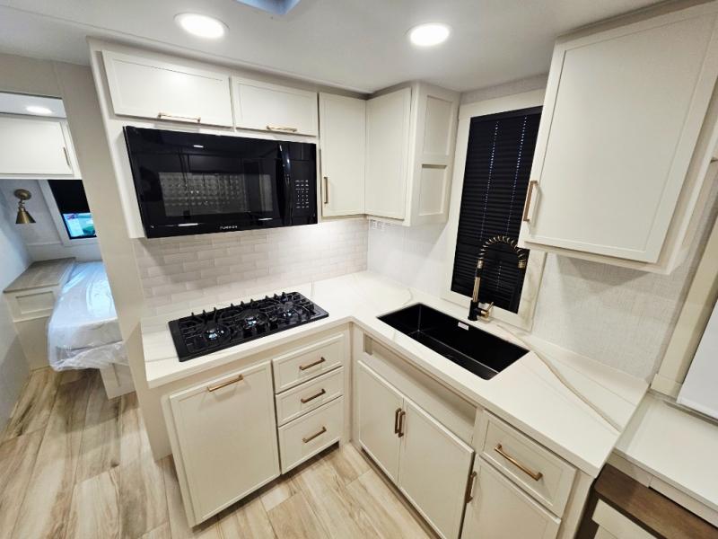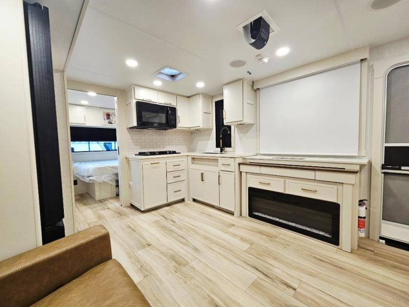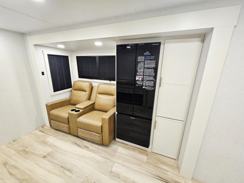 One look at this travel trailer and you'll be sold! The full rear bath features a spacious 42" x 30" shower with a built-in seat and Maxxair fan to name a few comforts. The front private bedroom features a 66" x 80" king bed with a MaxSpace Split-Level Wardrobe underneath to store shoes, clothes, and more! A slide out in the combined living area and kitchen makes your space more open, and you'll enjoy relaxing on the theater seating here in the evenings. The full kitchen includes a three burner stovetop, residential 30" convection microwave, 12 cu. ft. 12V refrigerator, plus a trash bin and Stow N' Go paper towel holder for added convenience. You can choose to eat outdoors under the 19' electric awning with LED lights or stay inside to dine at the pull-out dining table with a drawer for added storage! And if you're needing more sleeping space, just choose the optional tri-fold sofa in place of the theater seating!