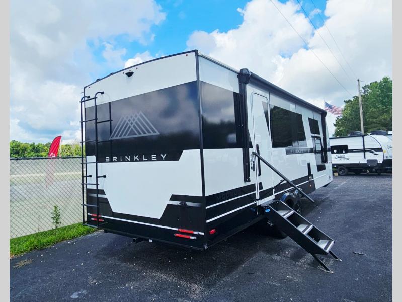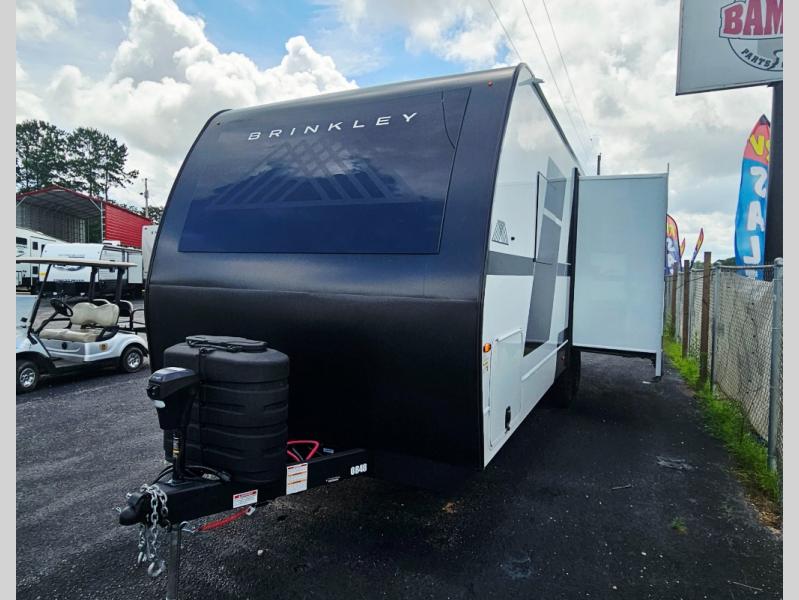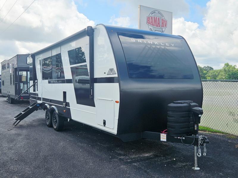 The lightweight Model I travel trailer by Brinkley is the perfect choice for those looking for an easy tow and at-home comforts! There is a drop-frame chassis, high-performance Road Armor suspension equalizer system, and Demco EZ Latch trailer coupler that automatically latches when dropped onto a hitch ball without the need of a safety pin. Additional exterior features include square Euro frameless windows, automotive-grade paint, full-width LED strip lighting in the pass-thru, and a pet & property security campside tie-down to keep your gear and furry friends safe. Inside, you'll be wowed by Brinkley's CraftSense wood trim construction, residential solid surface kitchen countertops, dimmable bedroom lights, and marine-grade neon LED shower lighting to name a few stand-out features!