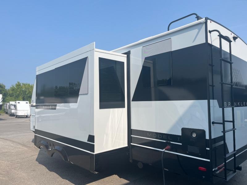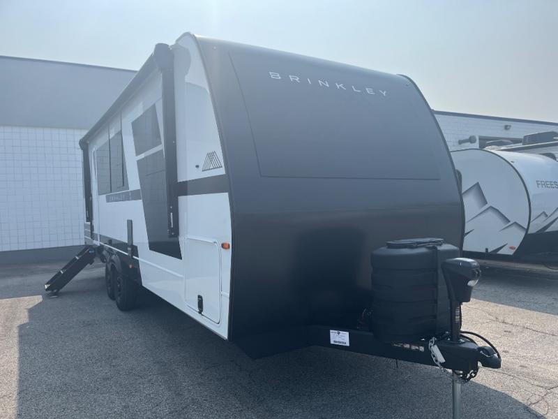 The lightweight Model I travel trailer by Brinkley is the perfect choice for those looking for an easy tow and at-home comforts! There is a drop-frame chassis, high-performance Road Armor suspension equalizer system, and Demco EZ Latch trailer coupler that automatically latches when dropped onto a hitch ball without the need of a safety pin. Additional exterior features include square Euro frameless windows, automotive-grade paint, full-width LED strip lighting in the pass-thru, and a pet & property security campside tie-down to keep your gear and furry friends safe. Inside, you'll be wowed by Brinkley's CraftSense wood trim construction, residential solid surface kitchen countertops, dimmable bedroom lights, and marine-grade neon LED shower lighting to name a few stand-out features!