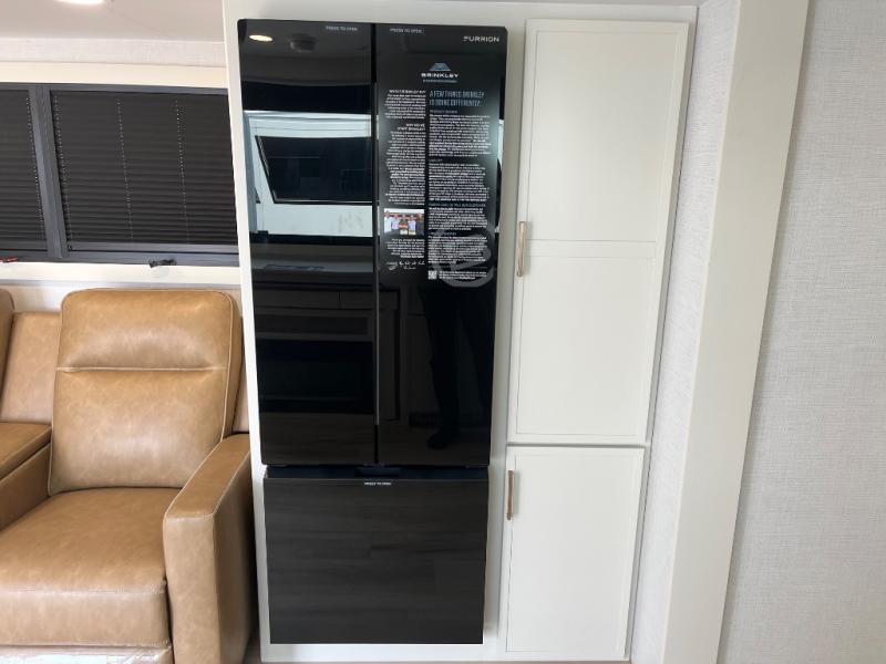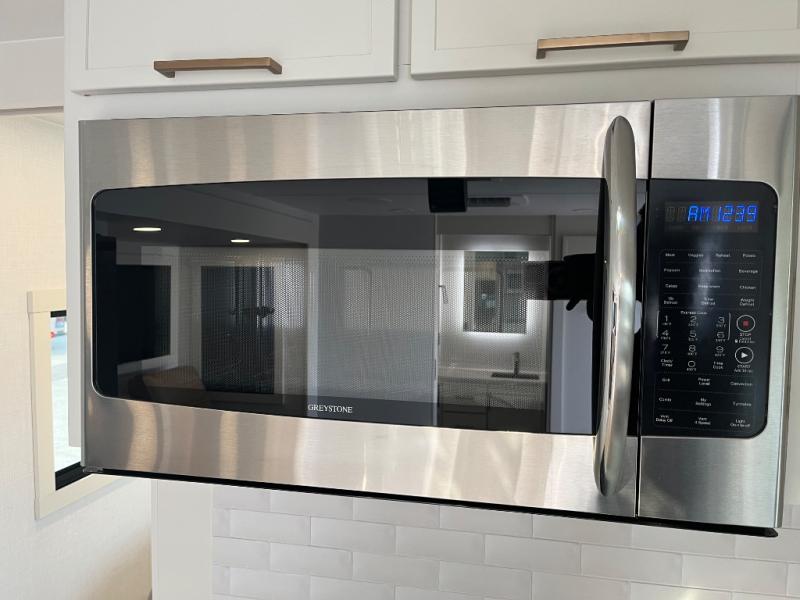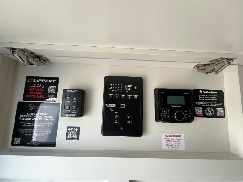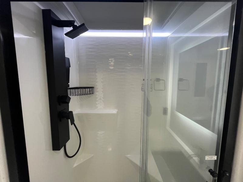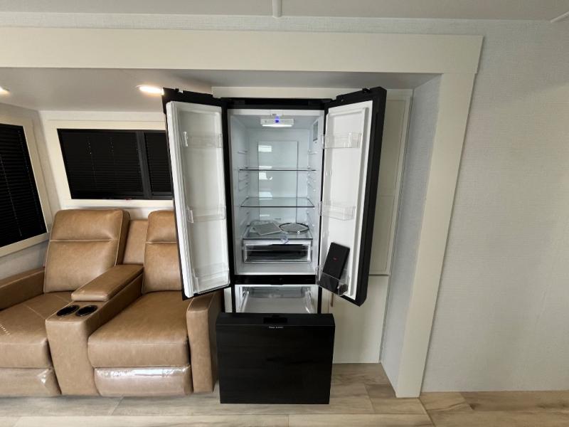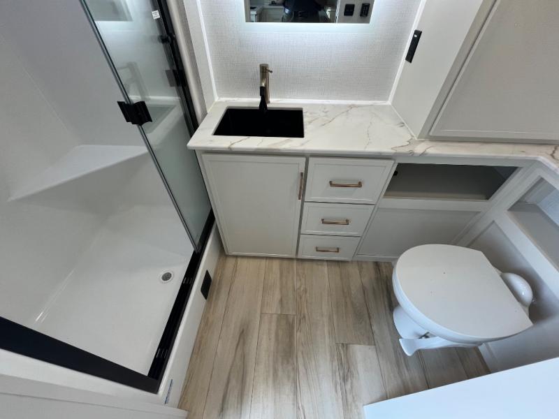 One look at this travel trailer and you'll be sold! The full rear bath features a spacious 42" x 30" shower with a built-in seat and Maxxair fan to name a few comforts. The front private bedroom features a 66" x 80" king bed with a MaxSpace Split-Level Wardrobe underneath to store shoes, clothes, and more! A slide out in the combined living area and kitchen makes your space more open, and you'll enjoy relaxing on the theater seating here in the evenings. The full kitchen includes a three burner stovetop, residential 30" convection microwave, 12 cu. ft. 12V refrigerator, plus a trash bin and Stow N' Go paper towel holder for added convenience. You can choose to eat outdoors under the 19' electric awning with LED lights or stay inside to dine at the pull-out dining table with a drawer for added storage! And if you're needing more sleeping space, just choose the optional tri-fold sofa in place of the theater seating!