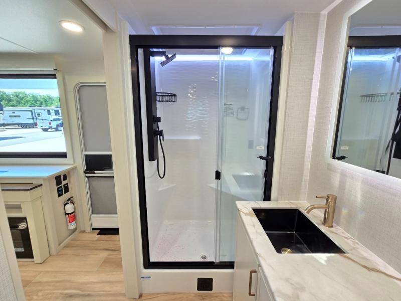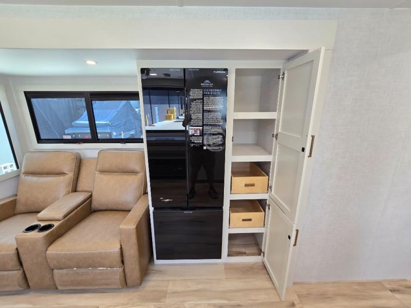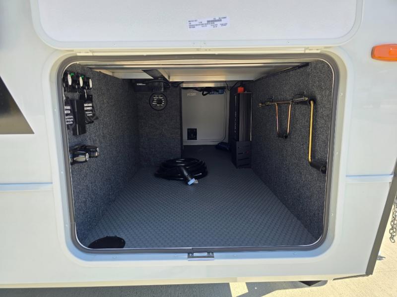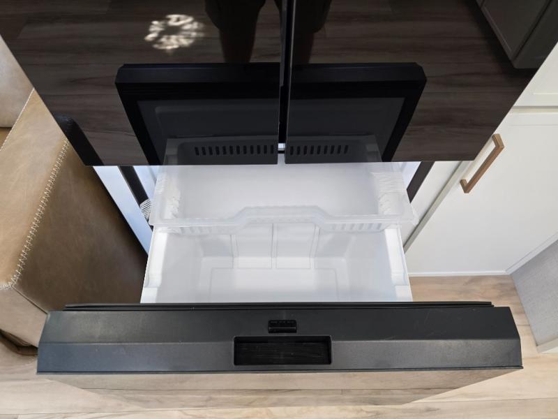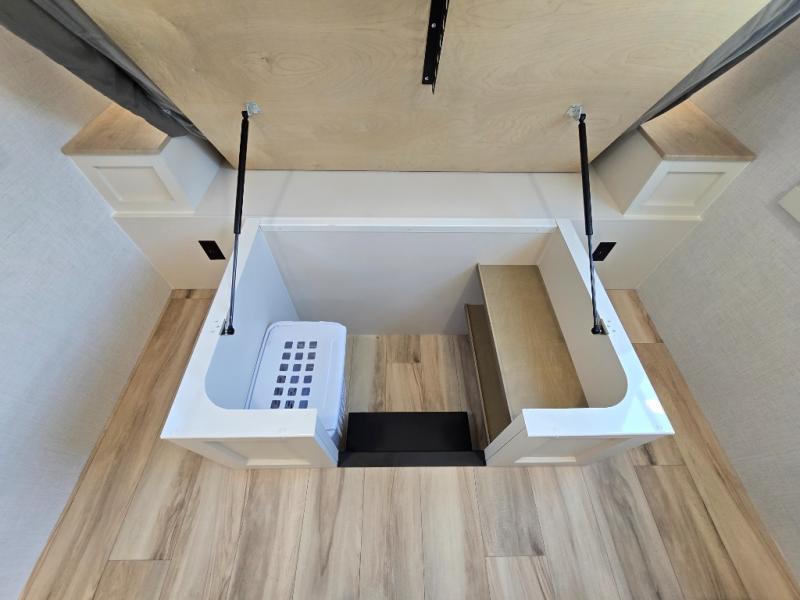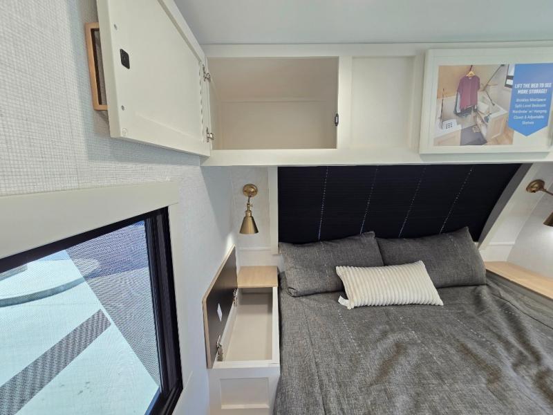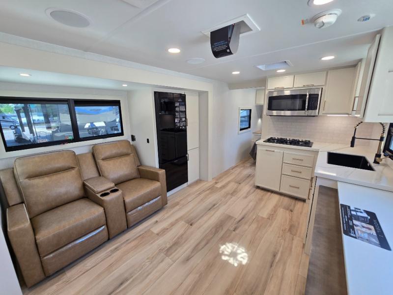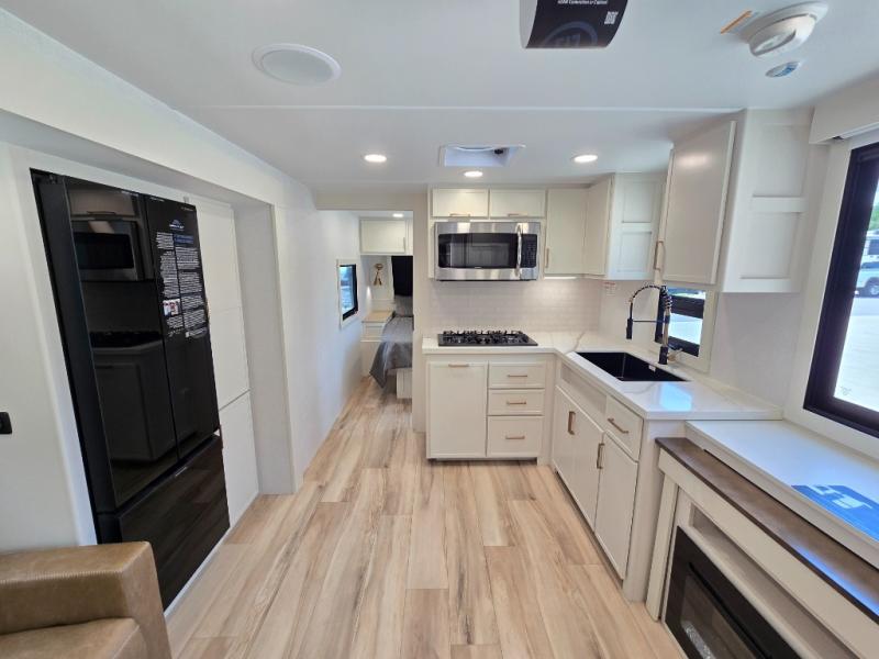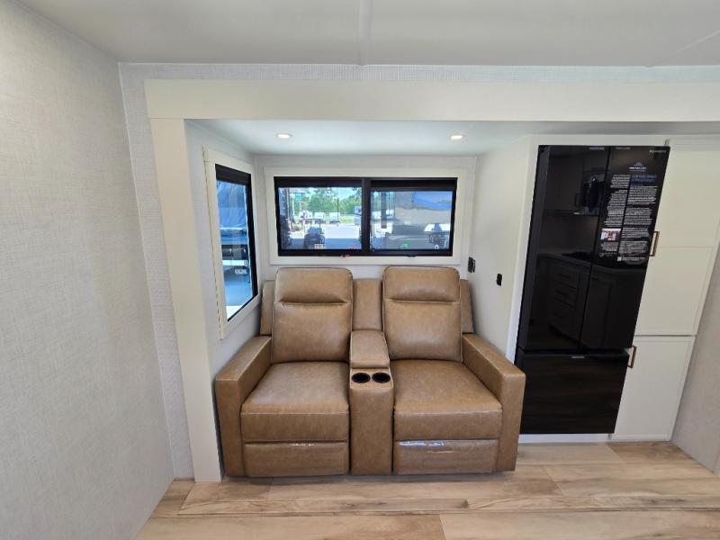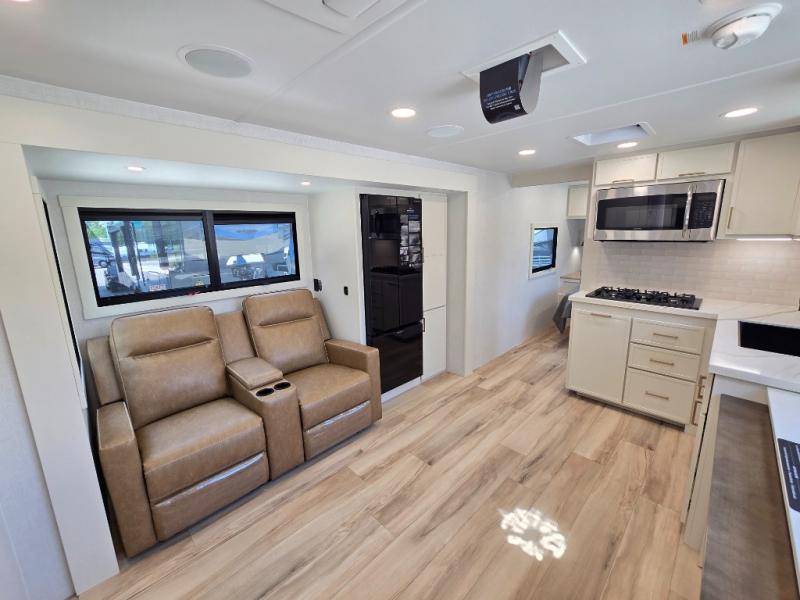One look at this travel trailer and you'll be sold! The full rear bath features a spacious 42" x 30" shower with a built-in seat and Maxxair fan to name a few comforts. The front private bedroom features a 66" x 80" king bed with a MaxSpace Split-Level Wardrobe underneath to store shoes, clothes, and more! A slide out in the combined living area and kitchen makes your space more open, and you'll enjoy relaxing on the theater seating here in the evenings. The full kitchen includes a three burner stovetop, residential 30" convection microwave, 12 cu. ft. 12V refrigerator, plus a trash bin and Stow N' Go paper towel holder for added convenience. You can choose to eat outdoors under the 19' electric awning with LED lights or stay inside to dine at the pull-out dining table with a drawer for added storage! And if you're needing more sleeping space, just choose the optional tri-fold sofa in place of the theater seating!