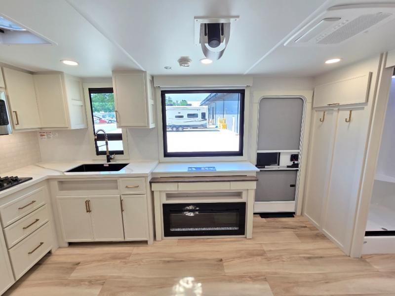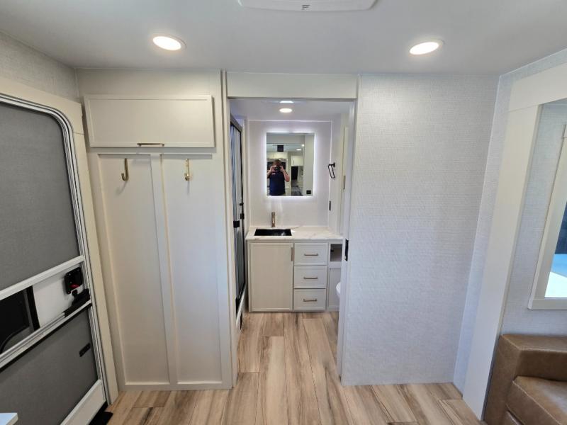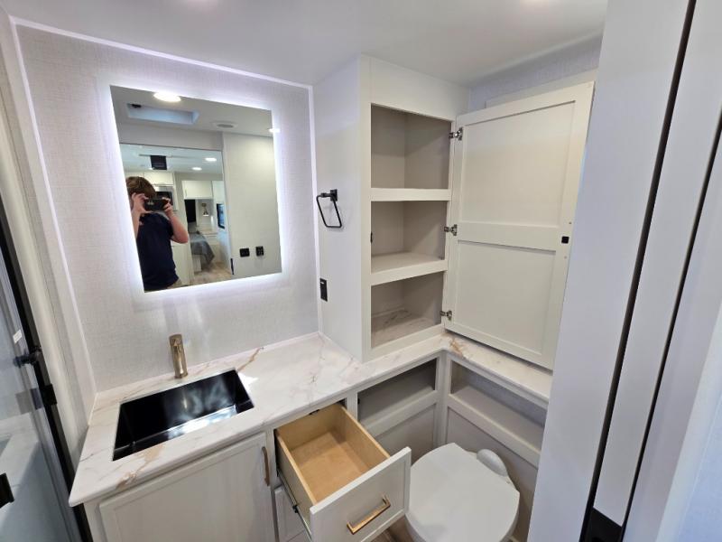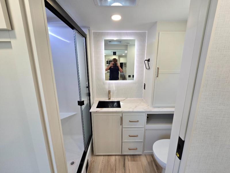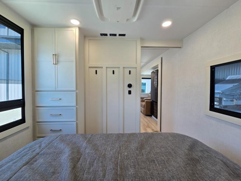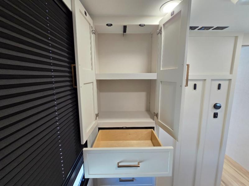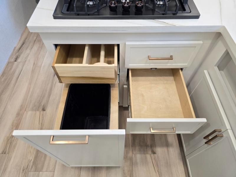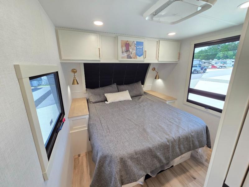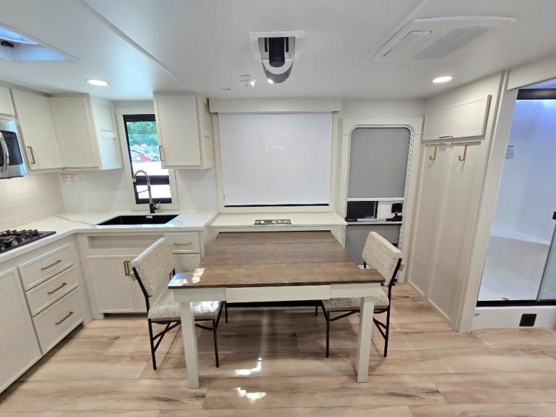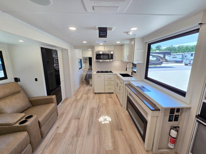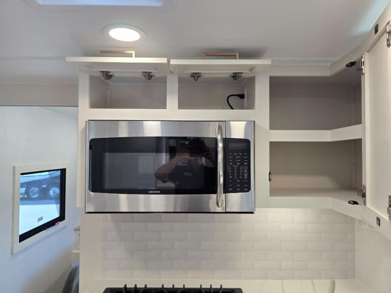 One look at this travel trailer and you'll be sold! The full rear bath features a spacious 42" x 30" shower with a built-in seat and Maxxair fan to name a few comforts. The front private bedroom features a 66" x 80" king bed with a MaxSpace Split-Level Wardrobe underneath to store shoes, clothes, and more! A slide out in the combined living area and kitchen makes your space more open, and you'll enjoy relaxing on the theater seating here in the evenings. The full kitchen includes a three burner stovetop, residential 30" convection microwave, 12 cu. ft. 12V refrigerator, plus a trash bin and Stow N' Go paper towel holder for added convenience. You can choose to eat outdoors under the 19' electric awning with LED lights or stay inside to dine at the pull-out dining table with a drawer for added storage! And if you're needing more sleeping space, just choose the optional tri-fold sofa in place of the theater seating!