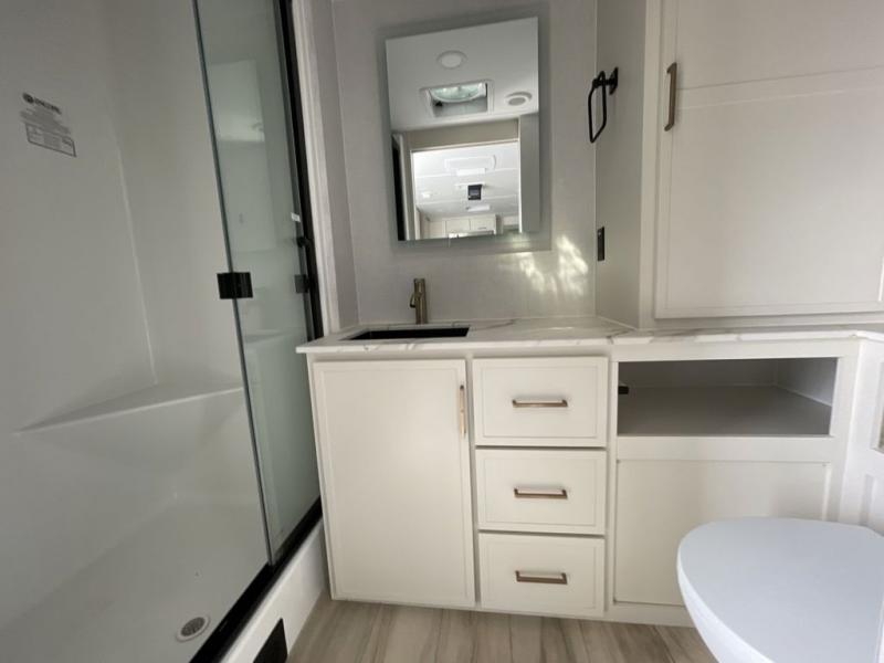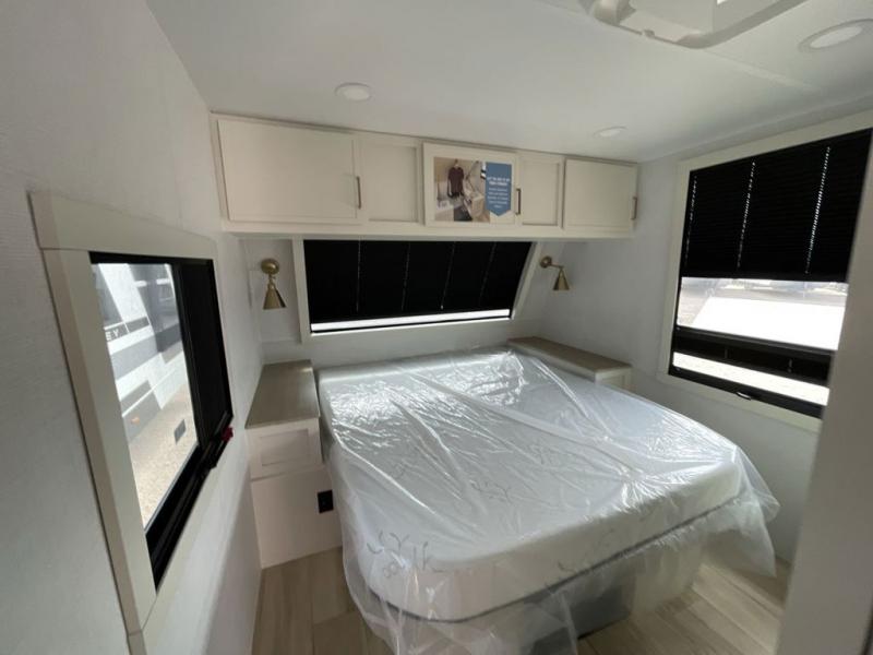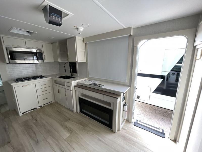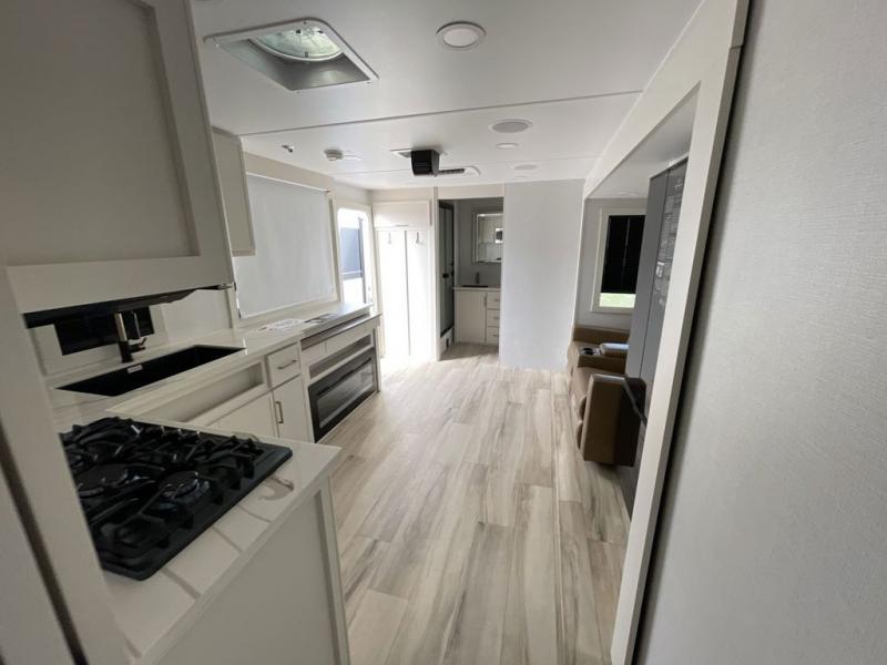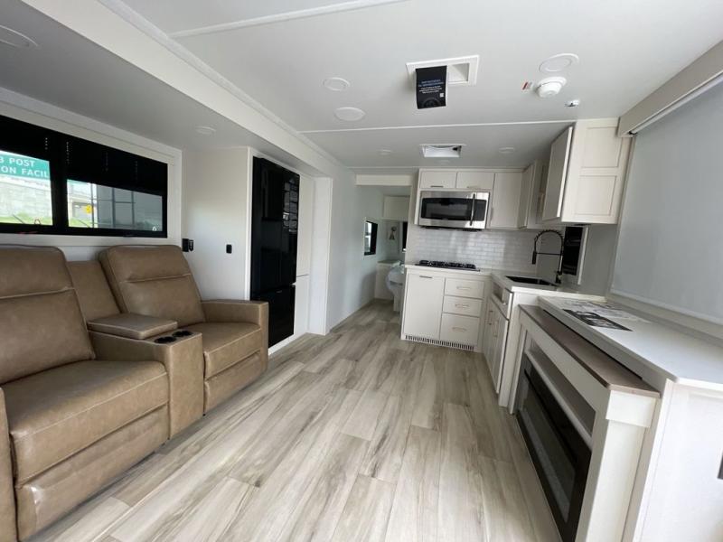One look at this travel trailer and you'll be sold! The full rear bath features a spacious 42" x 30" shower with a built-in seat and Maxxair fan to name a few comforts. The front private bedroom features a 66" x 80" king bed with a MaxSpace Split-Level Wardrobe underneath to store shoes, clothes, and more! A slide out in the combined living area and kitchen makes your space more open, and you'll enjoy relaxing on the theater seating here in the evenings. The full kitchen includes a three burner stovetop, residential 30" convection microwave, 12 cu. ft. 12V refrigerator, plus a trash bin and Stow N' Go paper towel holder for added convenience. You can choose to eat outdoors under the 19' electric awning with LED lights or stay inside to dine at the pull-out dining table with a drawer for added storage! And if you're needing more sleeping space, just choose the optional tri-fold sofa in place of the theater seating!