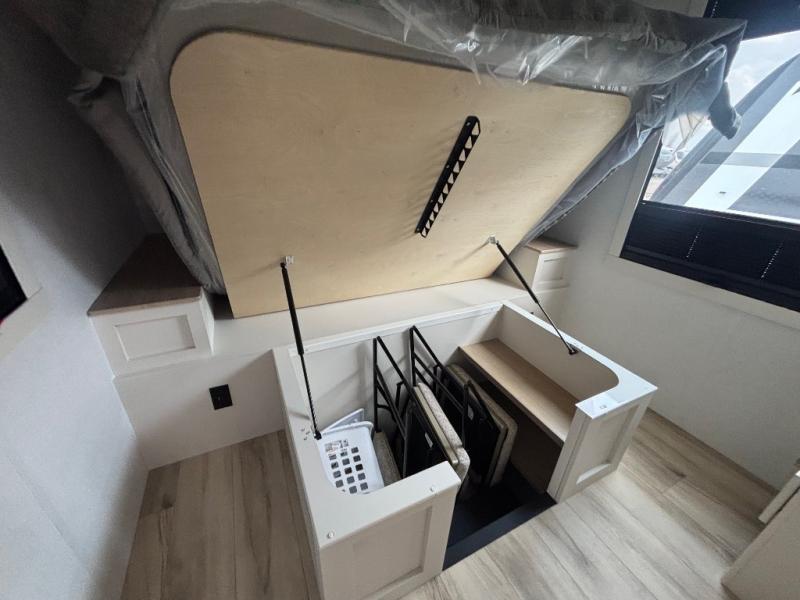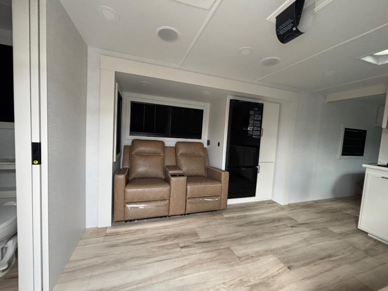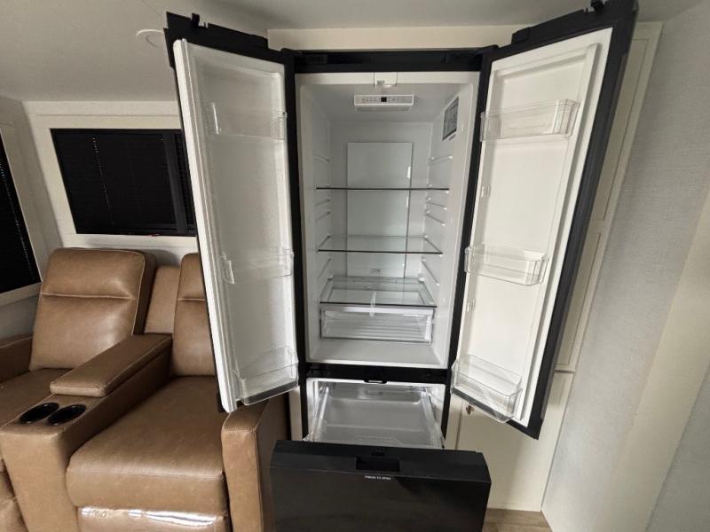 One look at this travel trailer and you'll be sold! The full rear bath features a spacious 42" x 30" shower with a built-in seat and Maxxair fan to name a few comforts. The front private bedroom features a 66" x 80" king bed with a MaxSpace Split-Level Wardrobe underneath to store shoes, clothes, and more! A slide out in the combined living area and kitchen makes your space more open, and you'll enjoy relaxing on the theater seating here in the evenings. The full kitchen includes a three burner stovetop, residential 30" convection microwave, 12 cu. ft. 12V refrigerator, plus a trash bin and Stow N' Go paper towel holder for added convenience. You can choose to eat outdoors under the 19' electric awning with LED lights or stay inside to dine at the pull-out dining table with a drawer for added storage! And if you're needing more sleeping space, just choose the optional tri-fold sofa in place of the theater seating!